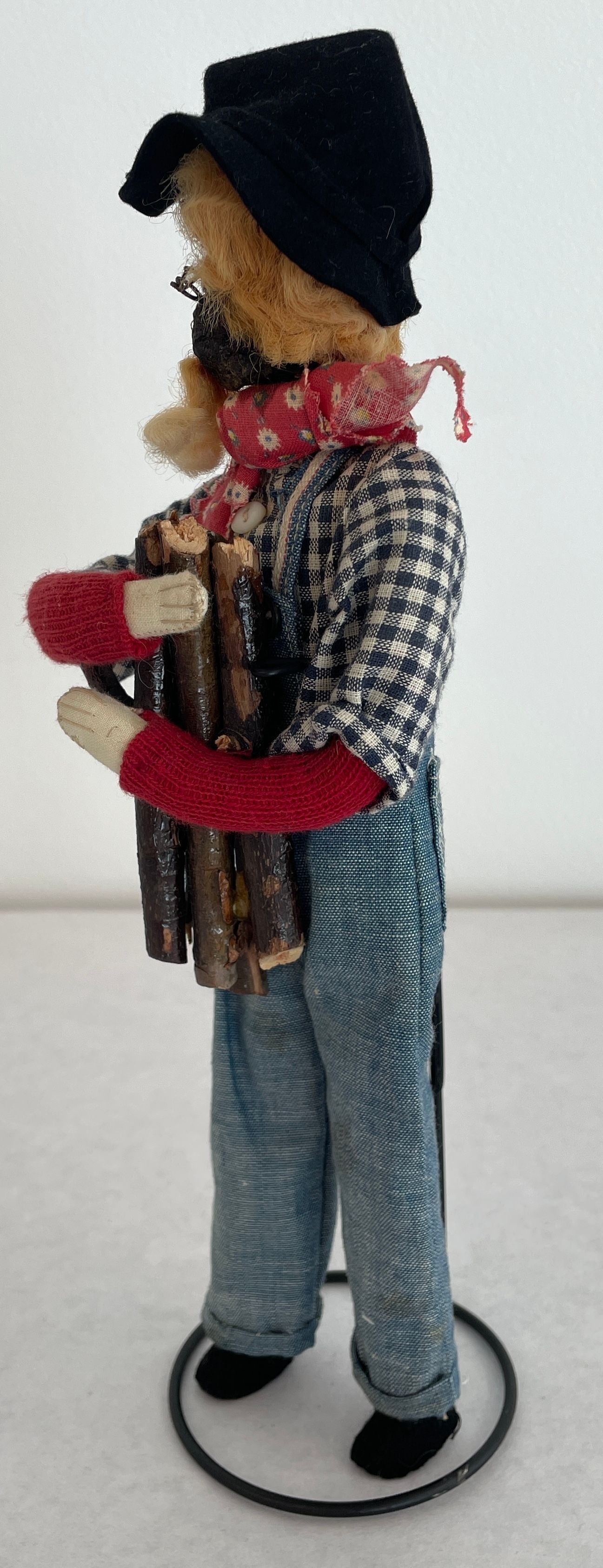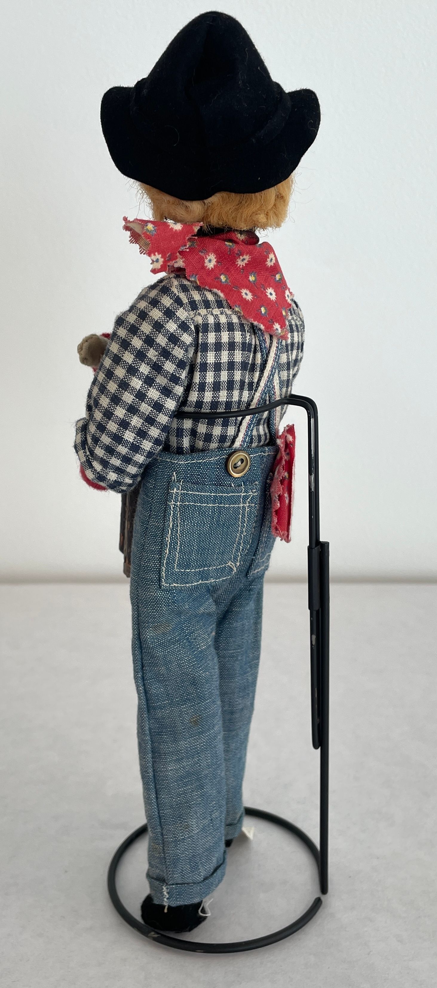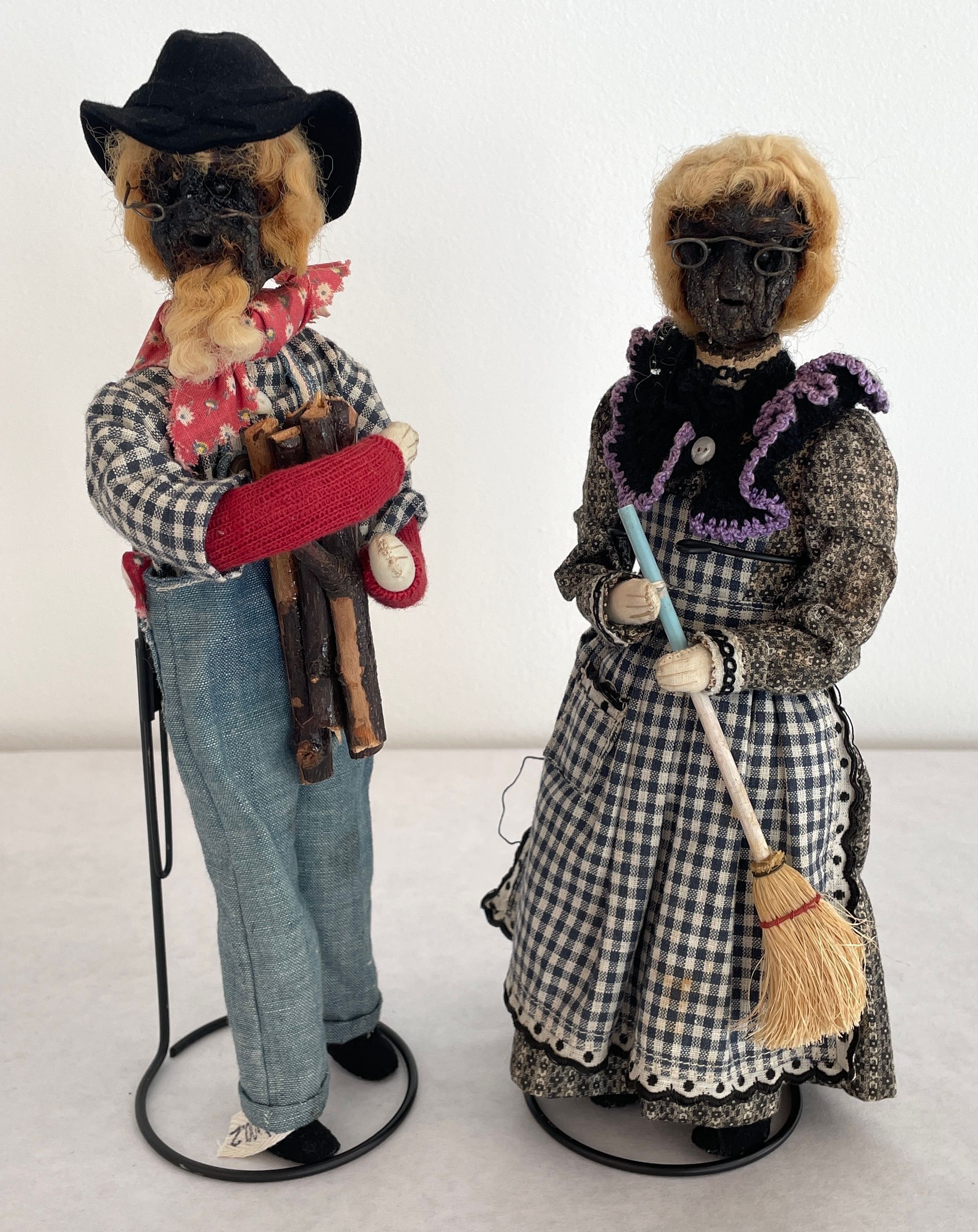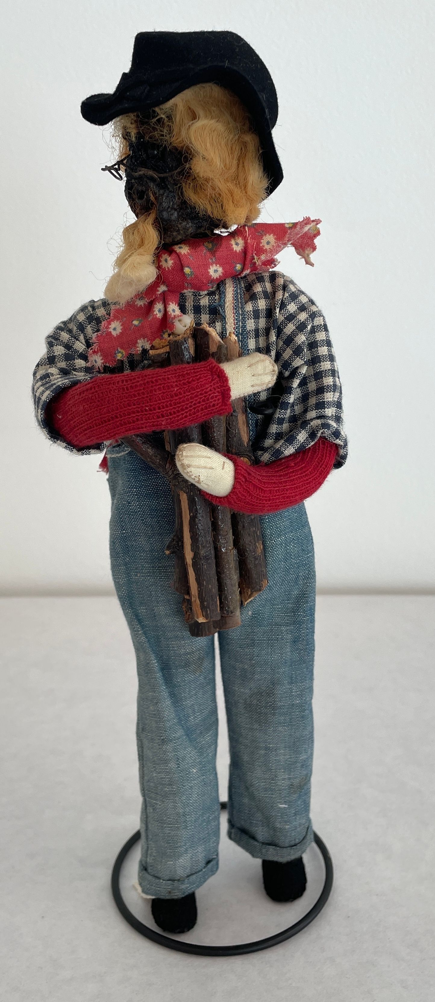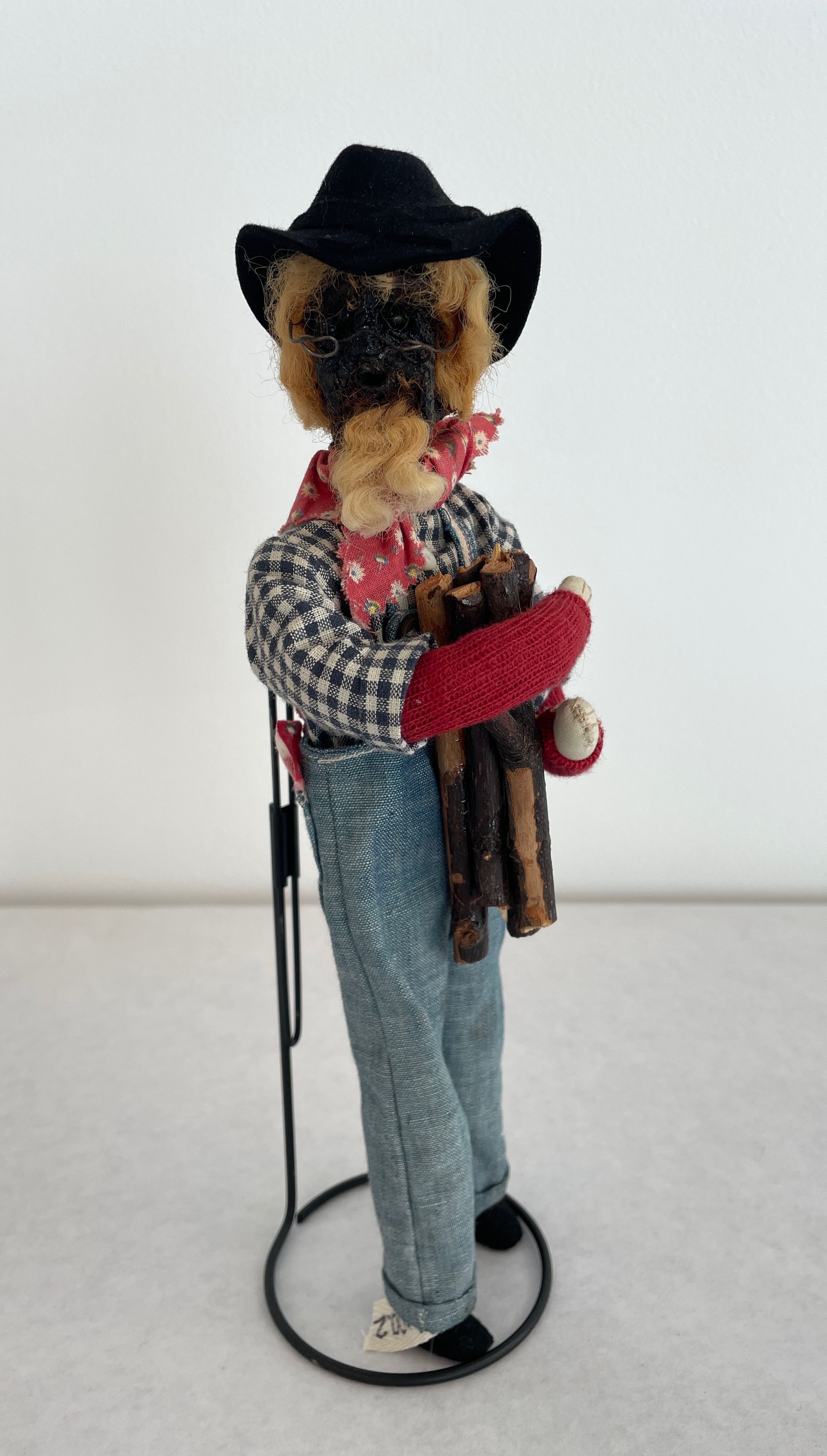 Farmer doll: head is a stained brown shrunken apple with a beard black bead eyes wire glasses and blonde yarn hair with a black hat, spectacles, red bandana, blue jean overalls and a blue and white checkered shirt.