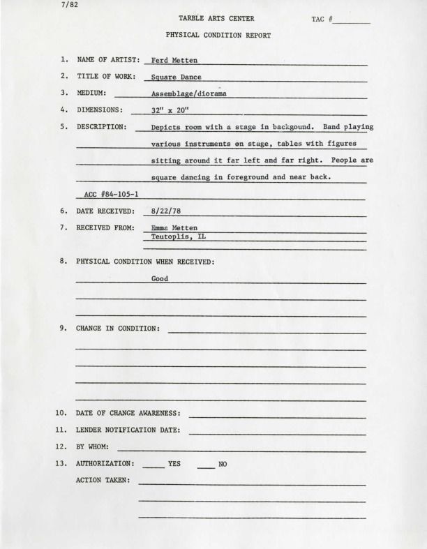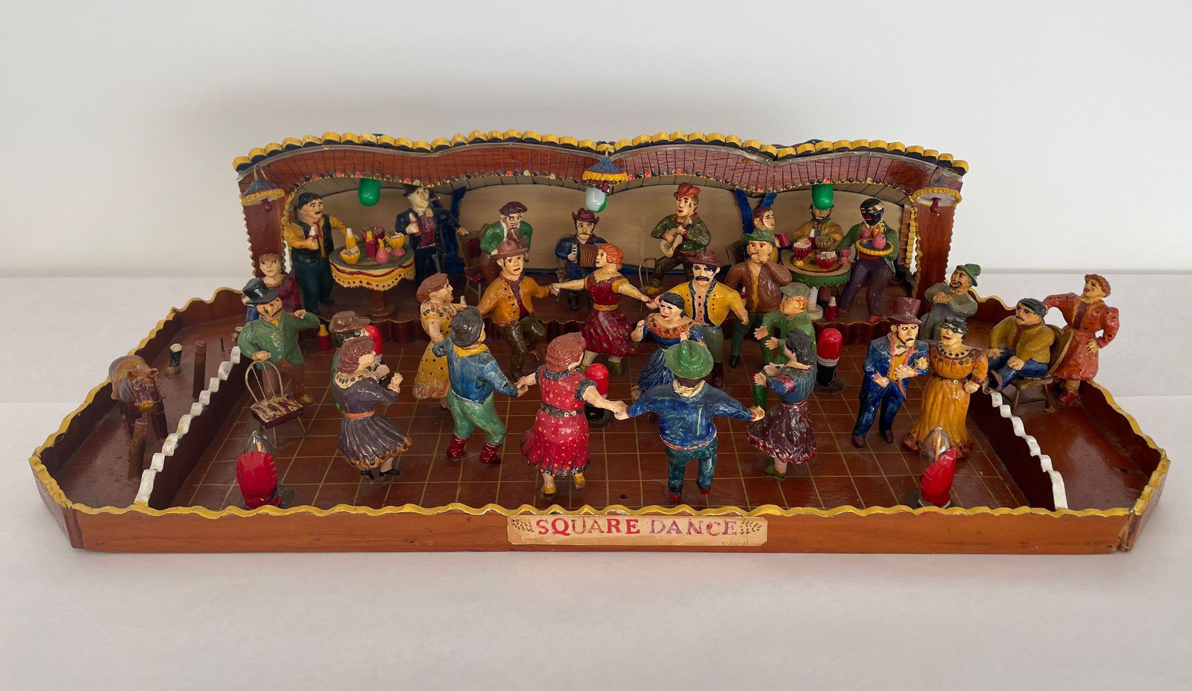 Depicts room with a stage in background. Band playing various instruments on stage, tables with figures sitting around it far left and far right. People are square dancing in foreground.Collection