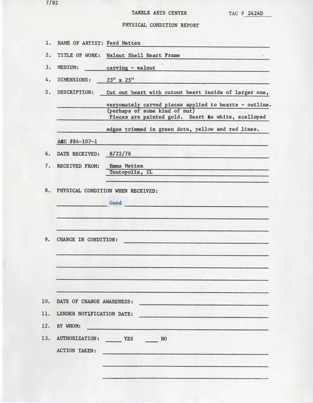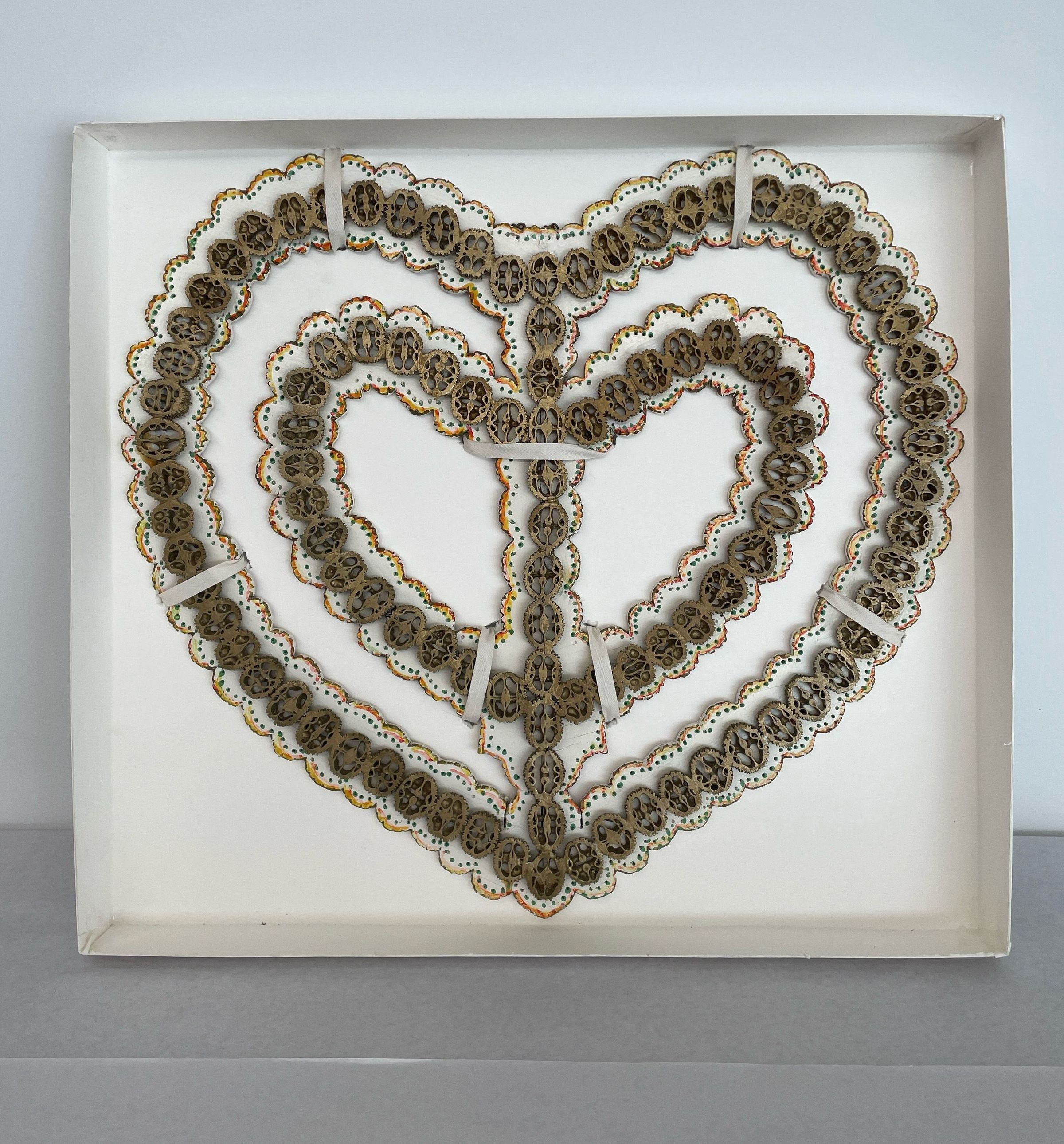 Cut out heart with cutout heart inside of the larger one, ornately carved pieces applied to hearts-outline. (Perhaps of some kind of nut). Pieces are painted gold. Heart is white scalloped edges trimmed in green dots, yellow and red lines.Collection