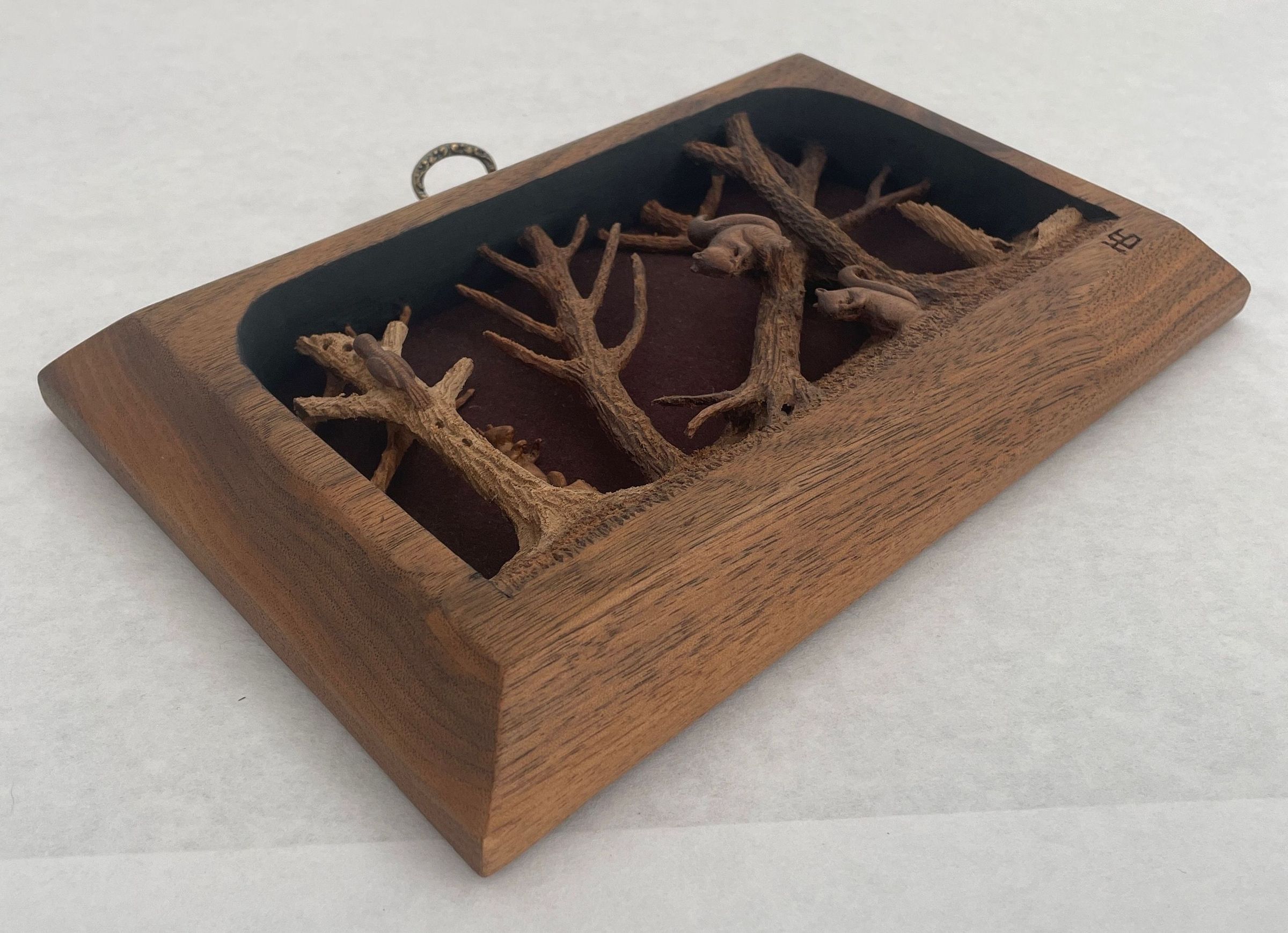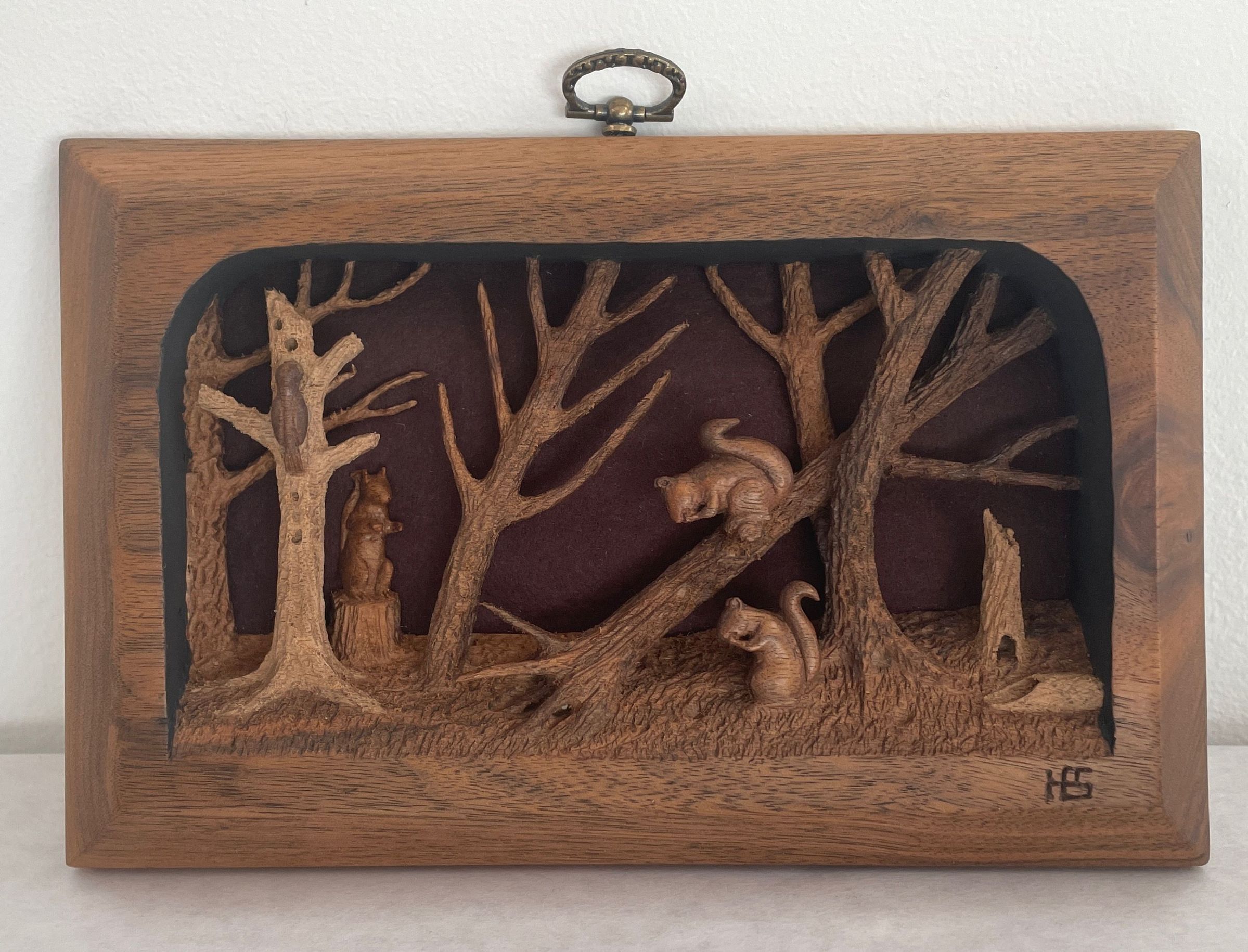 Small bas-relief walnut carving. Several carved trees portrayed. One has fallen into another at right of work. Wood pecker on front of tree at far left. Three squirrels depicted: one on tree stump far left, one eating on fallen tree center, one eating on ground. "HES" carved lower right. Metal hangin device visible at top. Brown felt backing.Collection