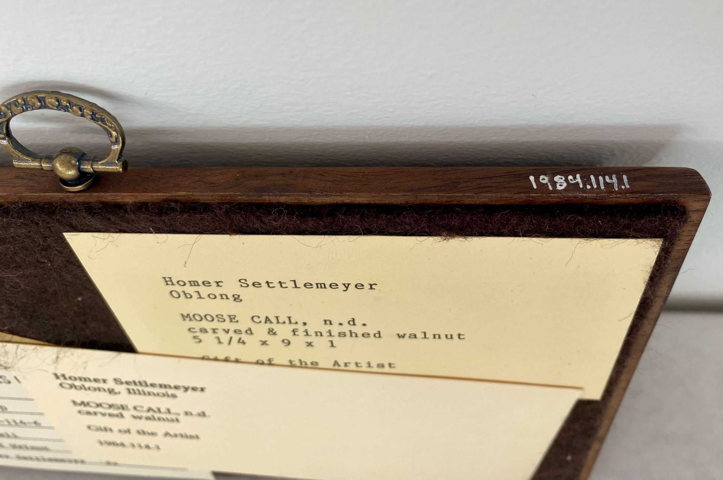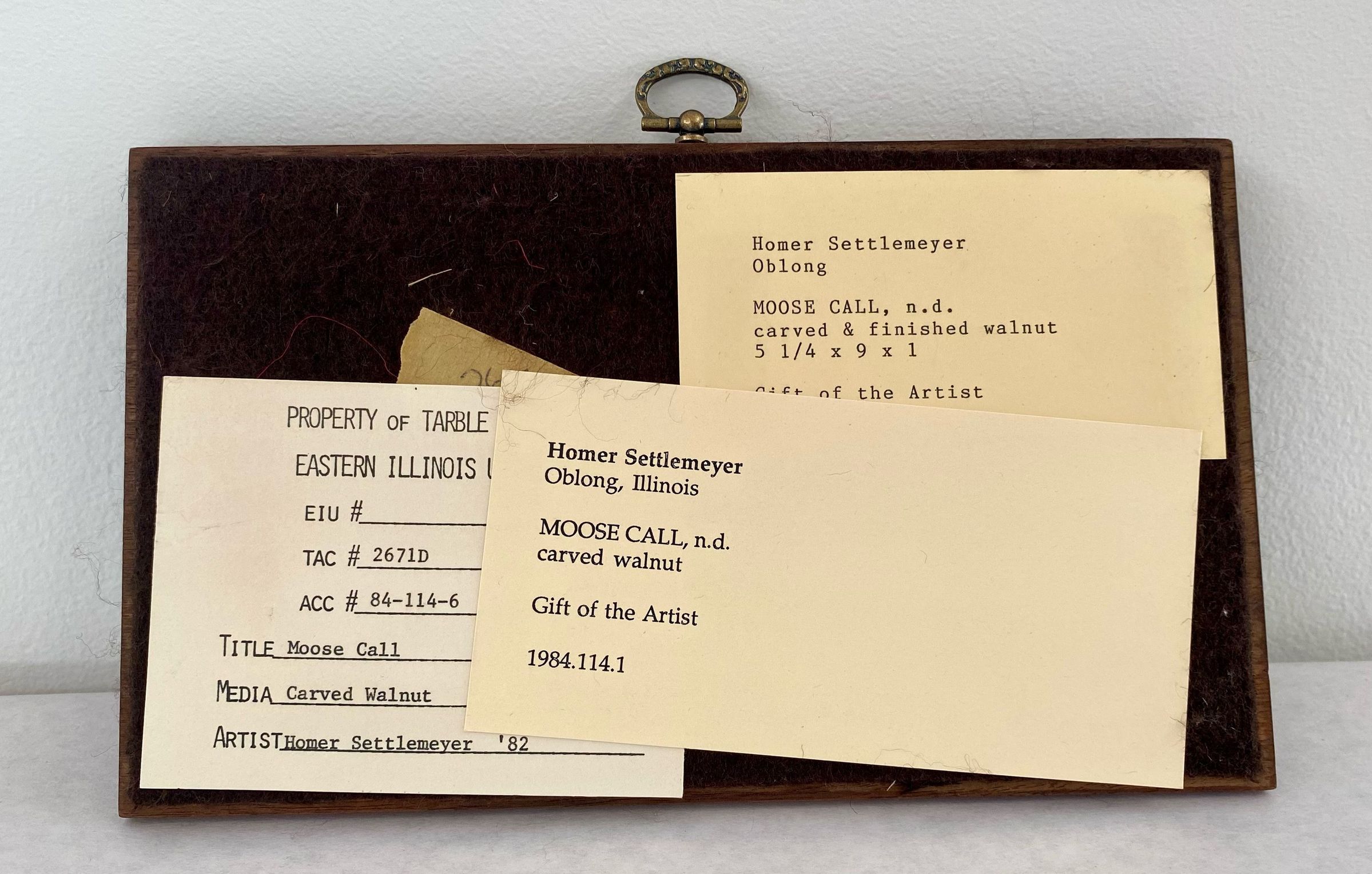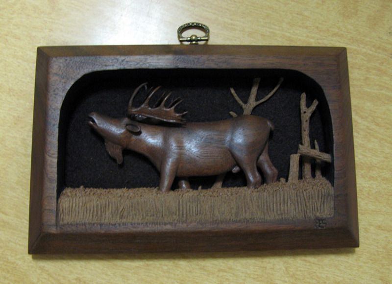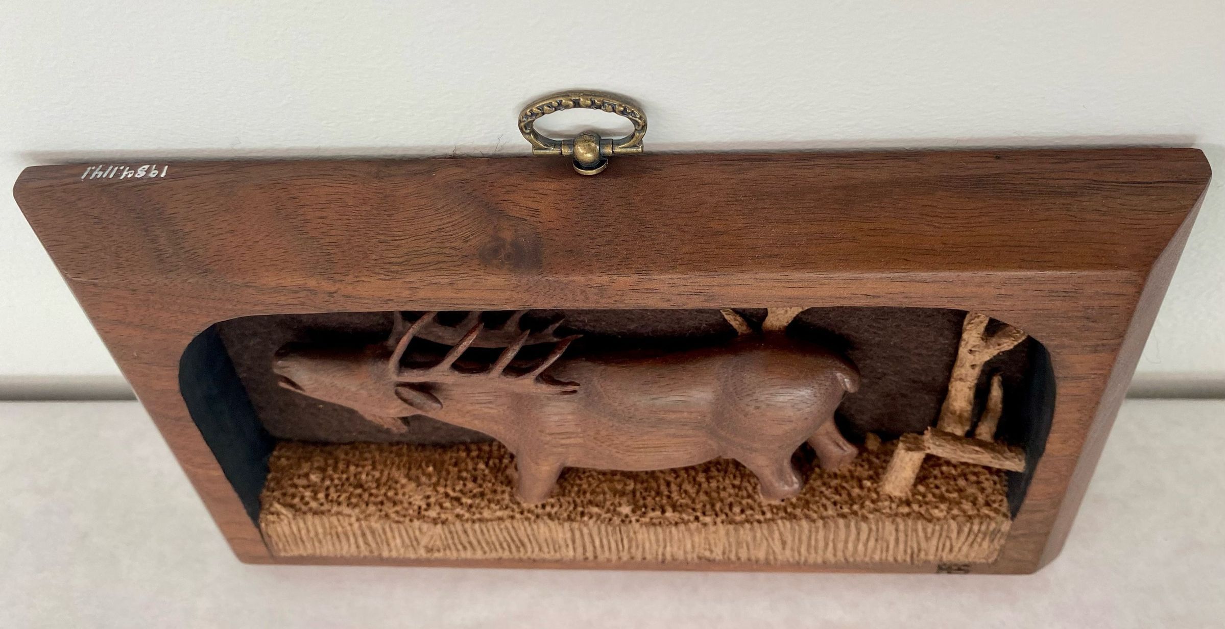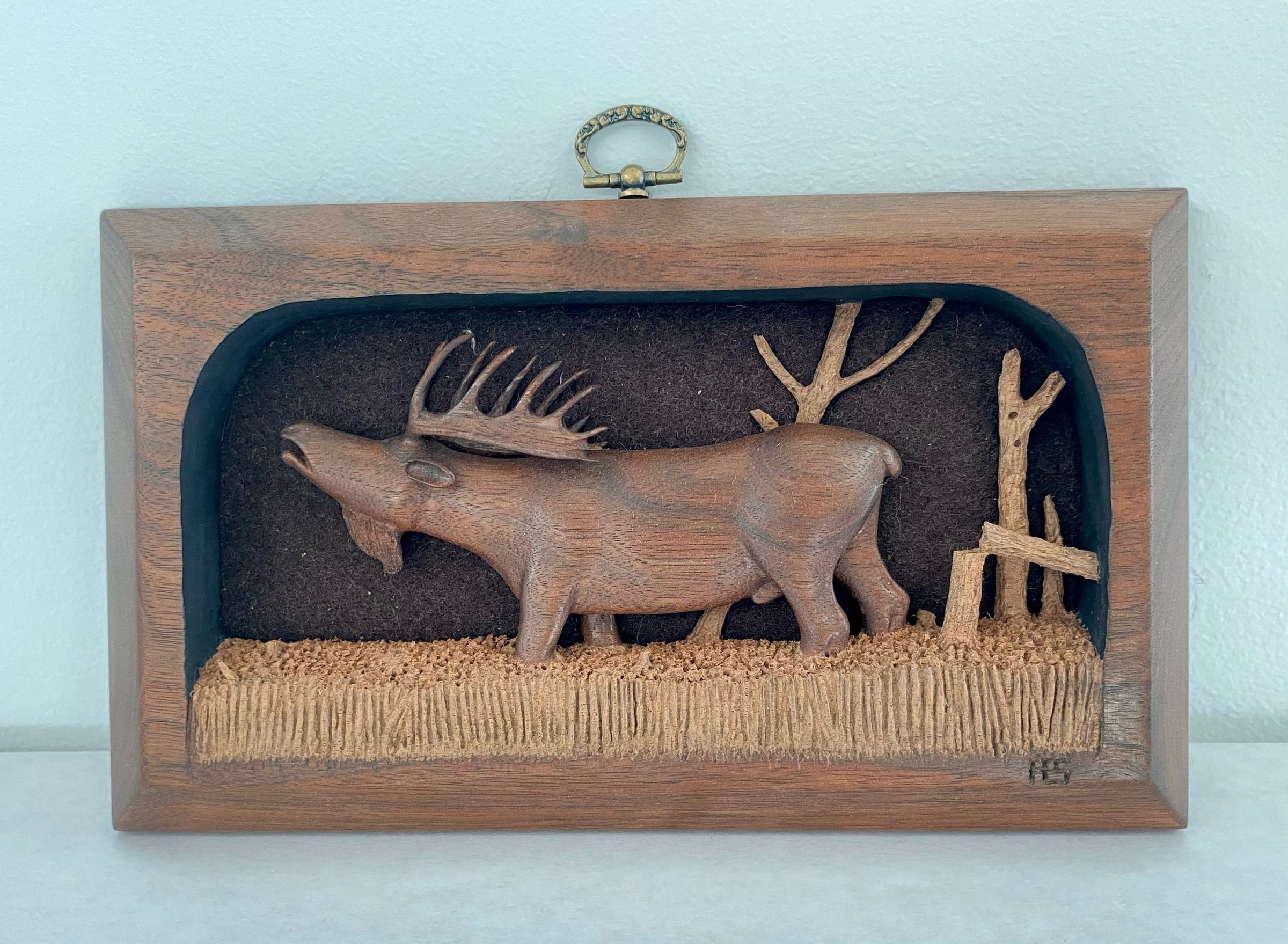 Small bas-relief walnut carving depicts large moose giving hiscall. Moose has large ornate antlers and goatee. Carved wood atbottom resembles grass several carved trees far right.Collection