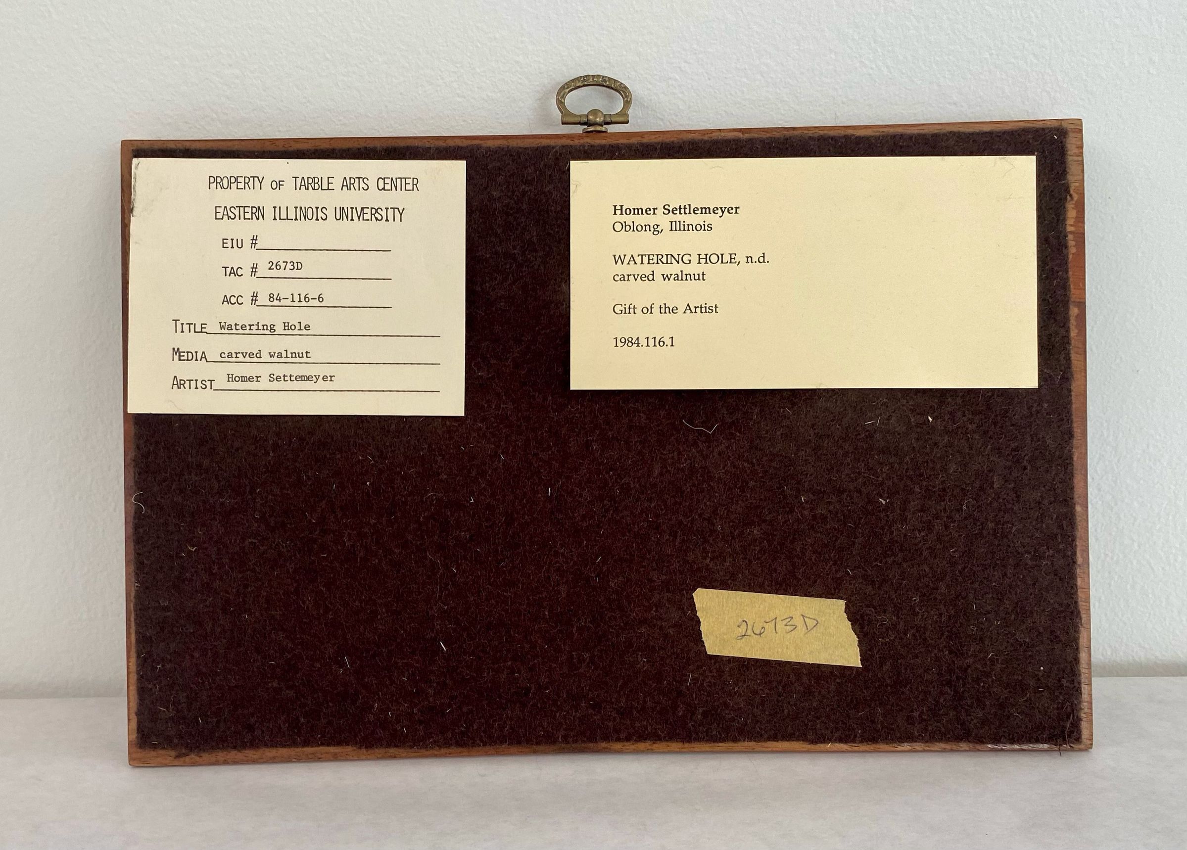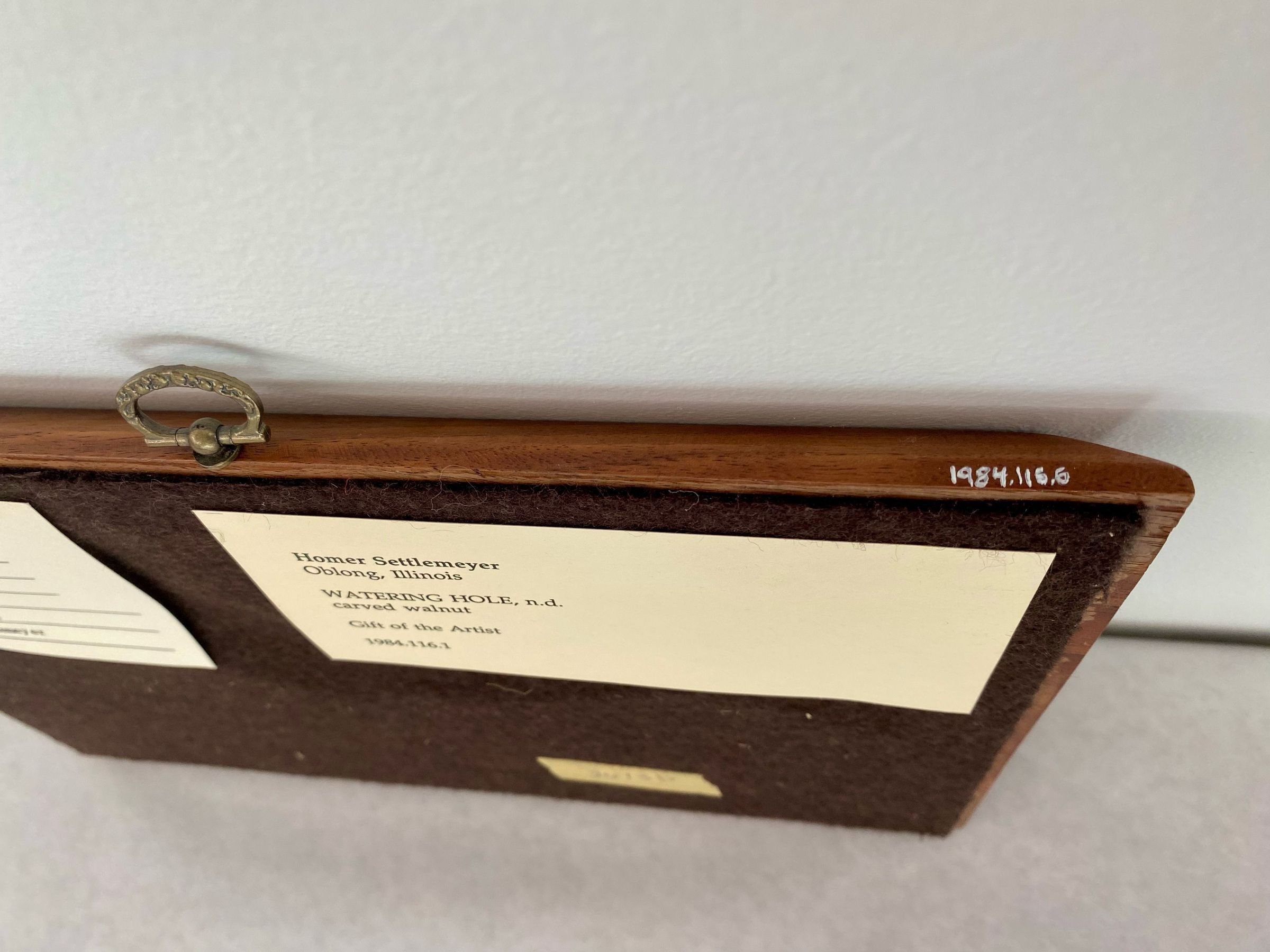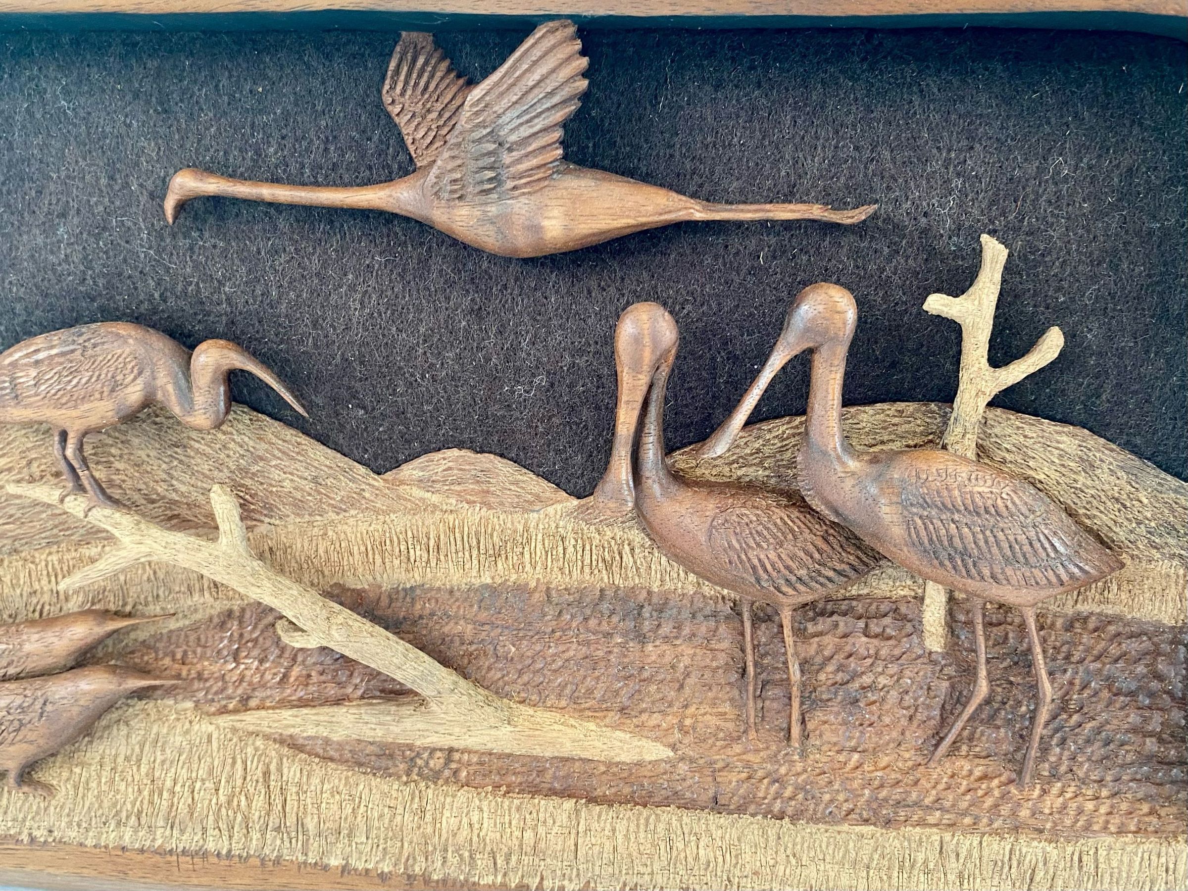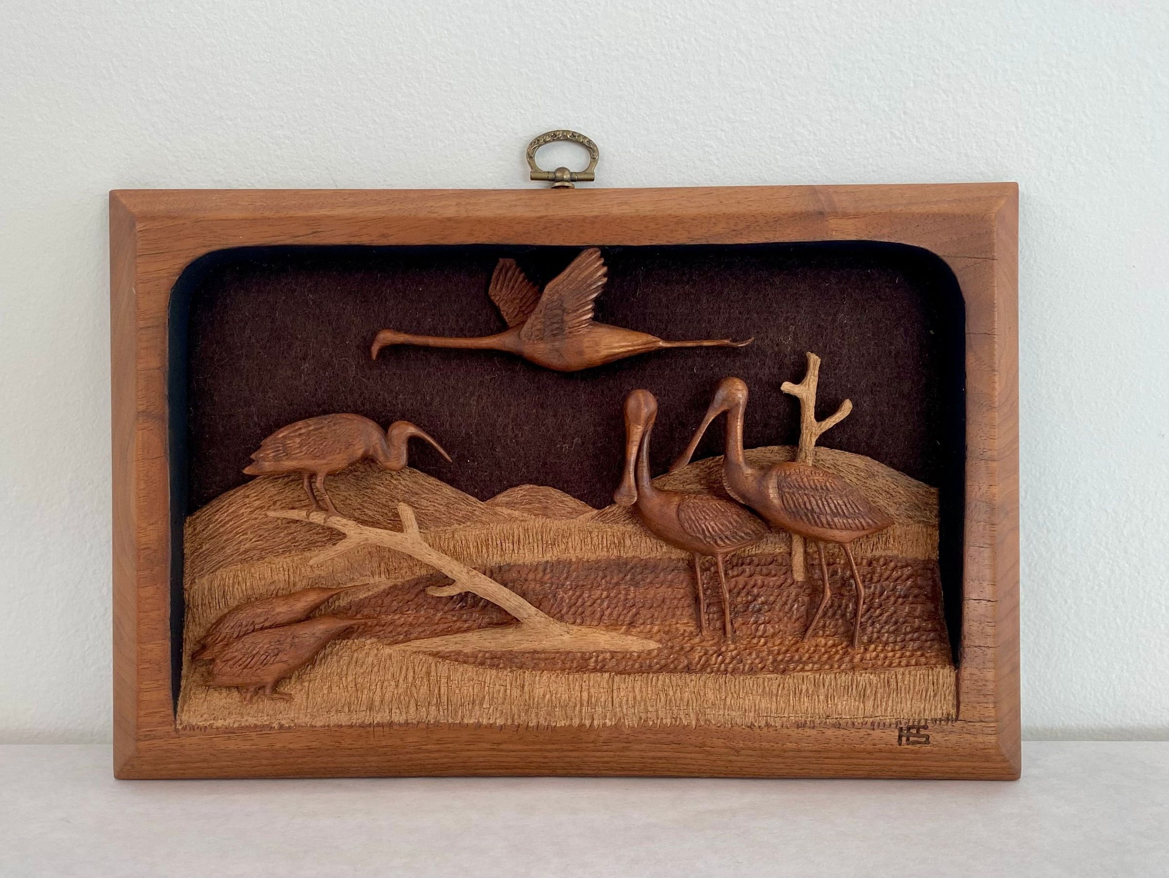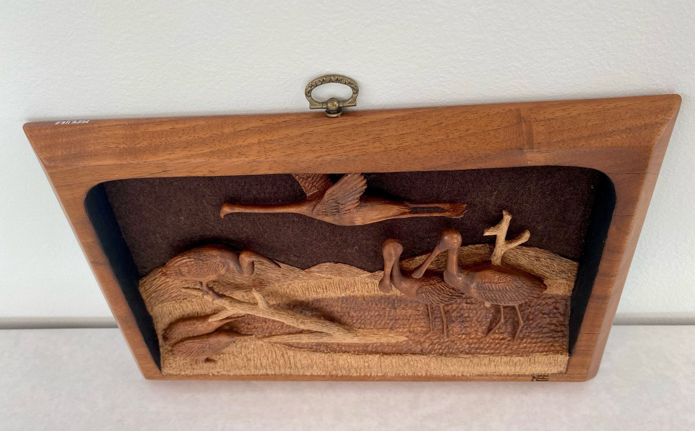 bird is in flight in center two are standing in water oneperched on limb at left and two hovering far left corner.Brown feet backing metal hanging device at back.Collection