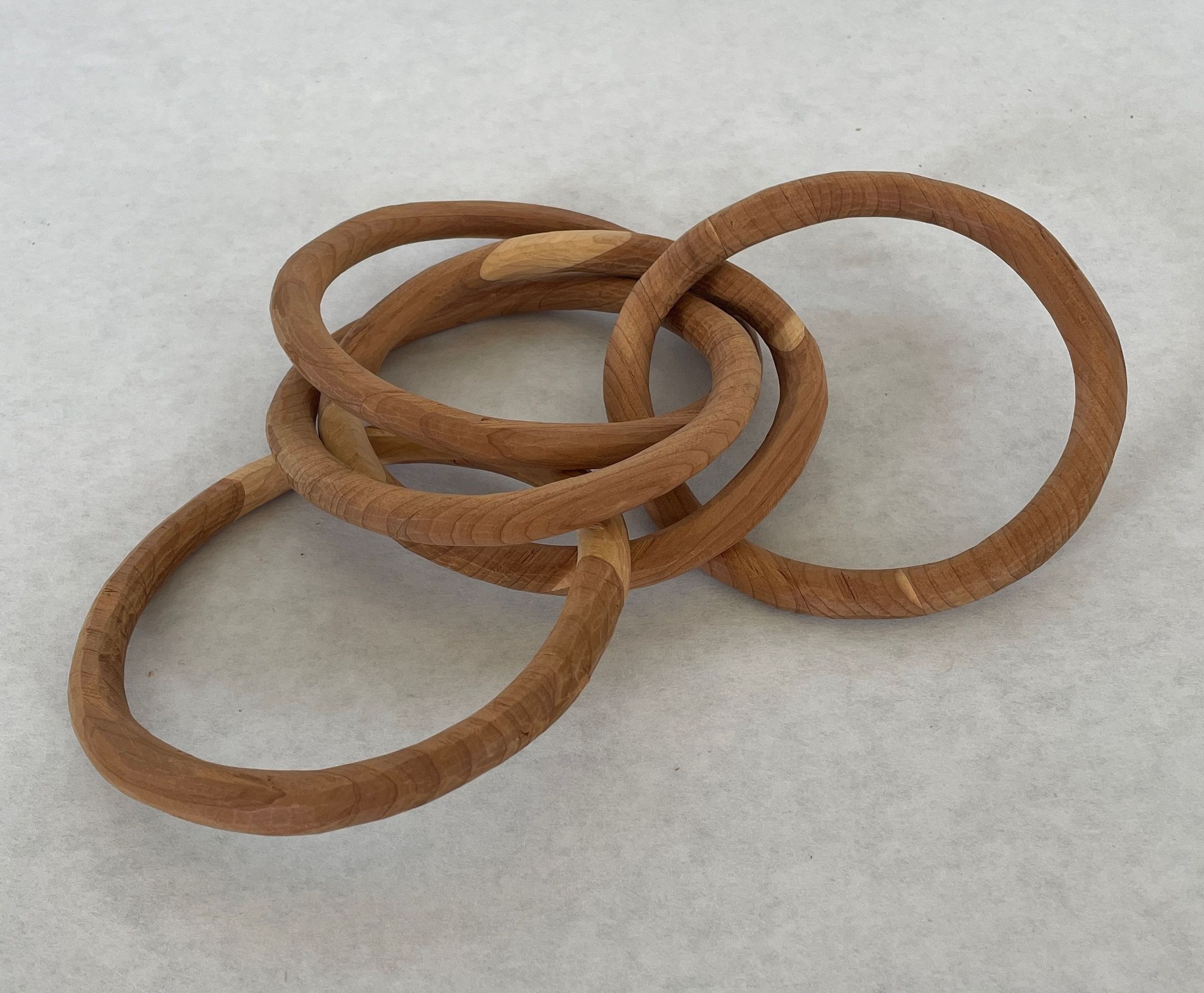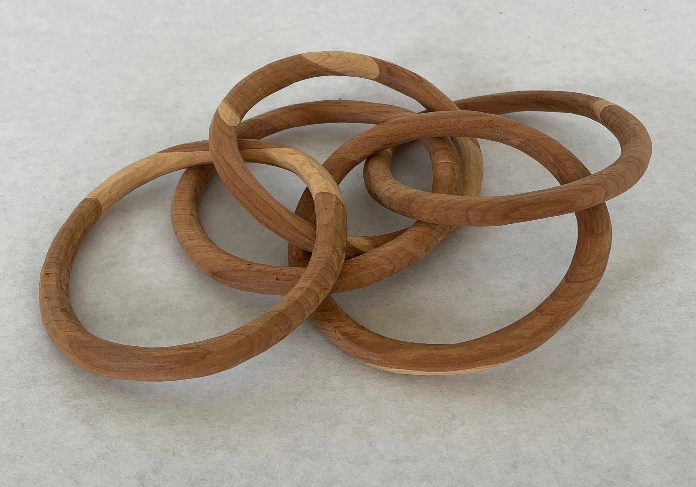 Five carved wooden rings interconnected. Can not separate. Cut from one piece of wood. Dark wood with some pieces of light wood.Collection