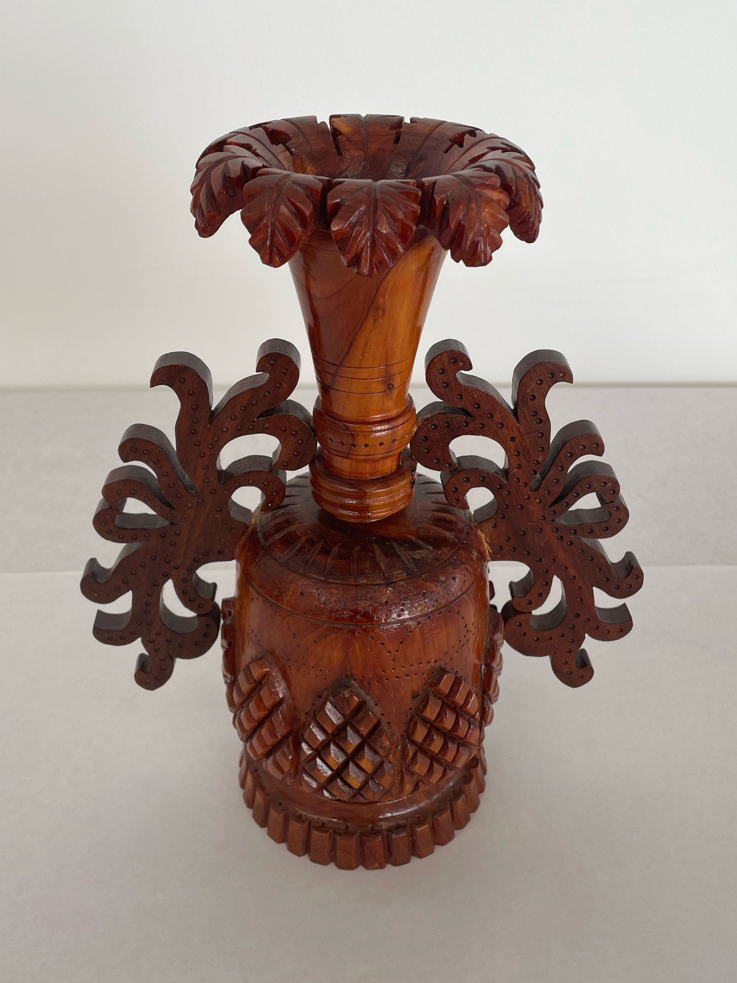 Small carved urn with high handle circling over top. Urn is ornately carved and painted with yellow green and red. Top is carved with leaf-like forms. Handle is carved resembling vines.Collection
