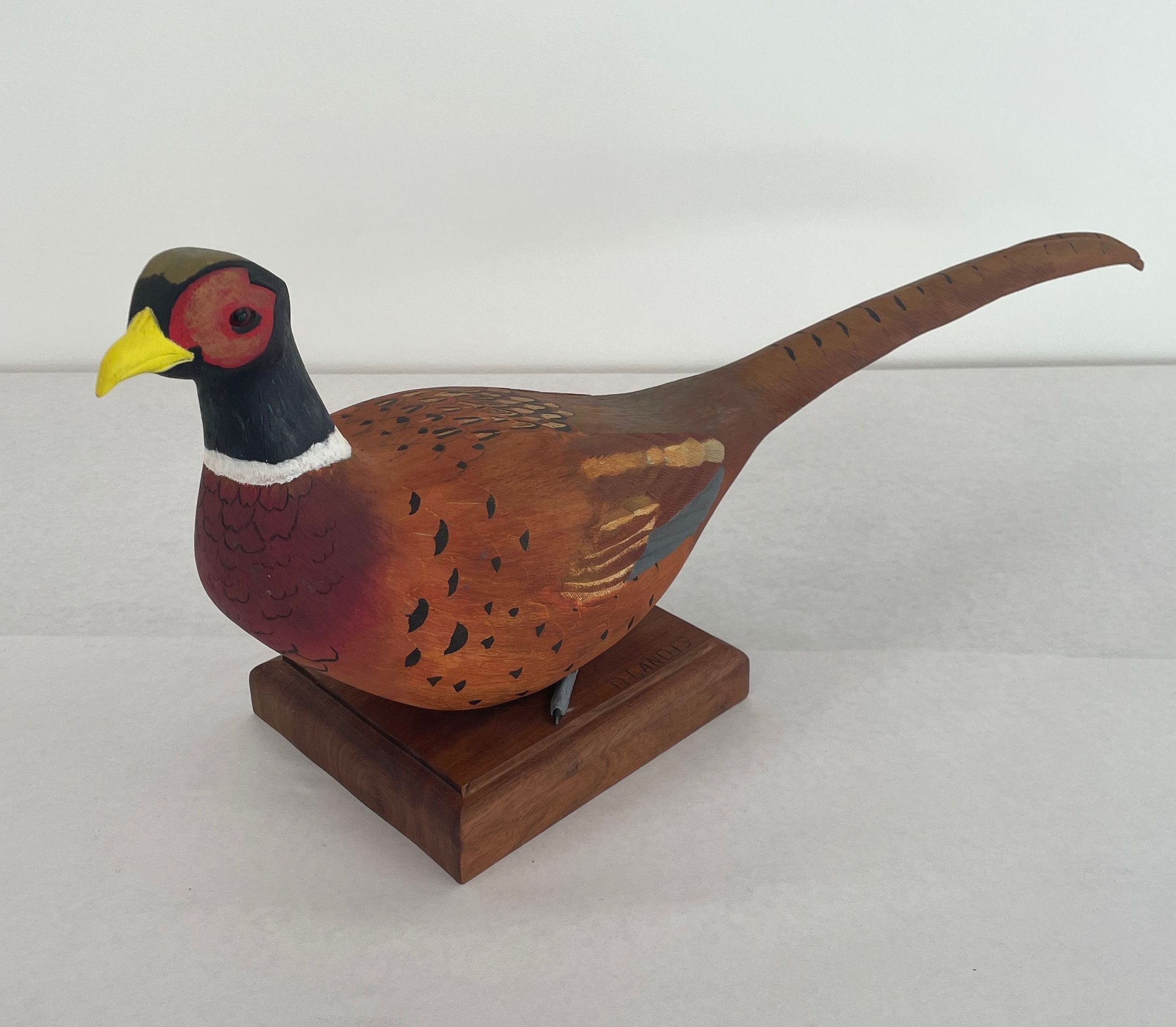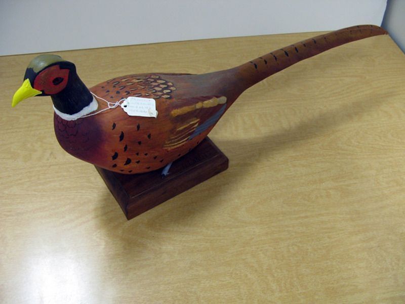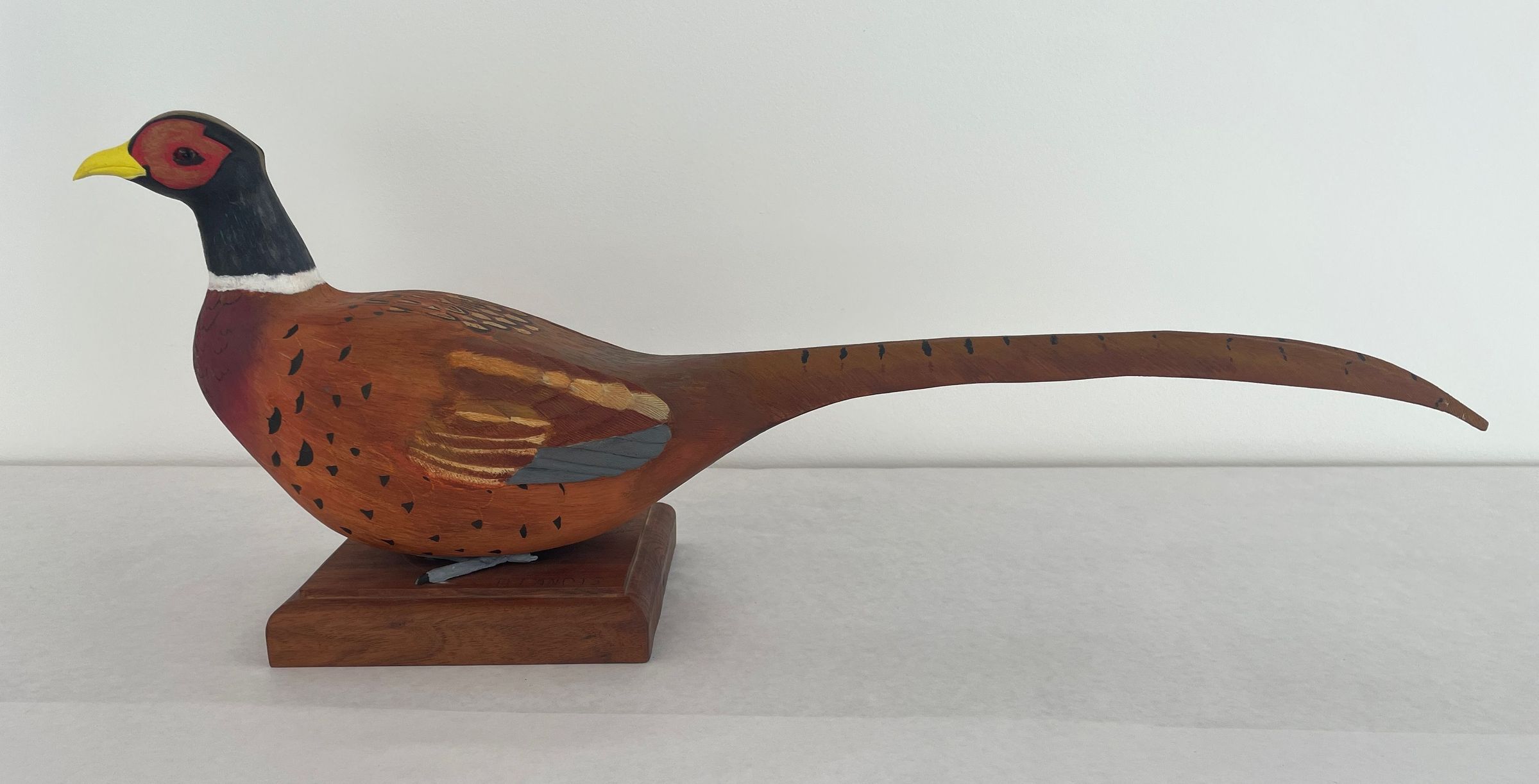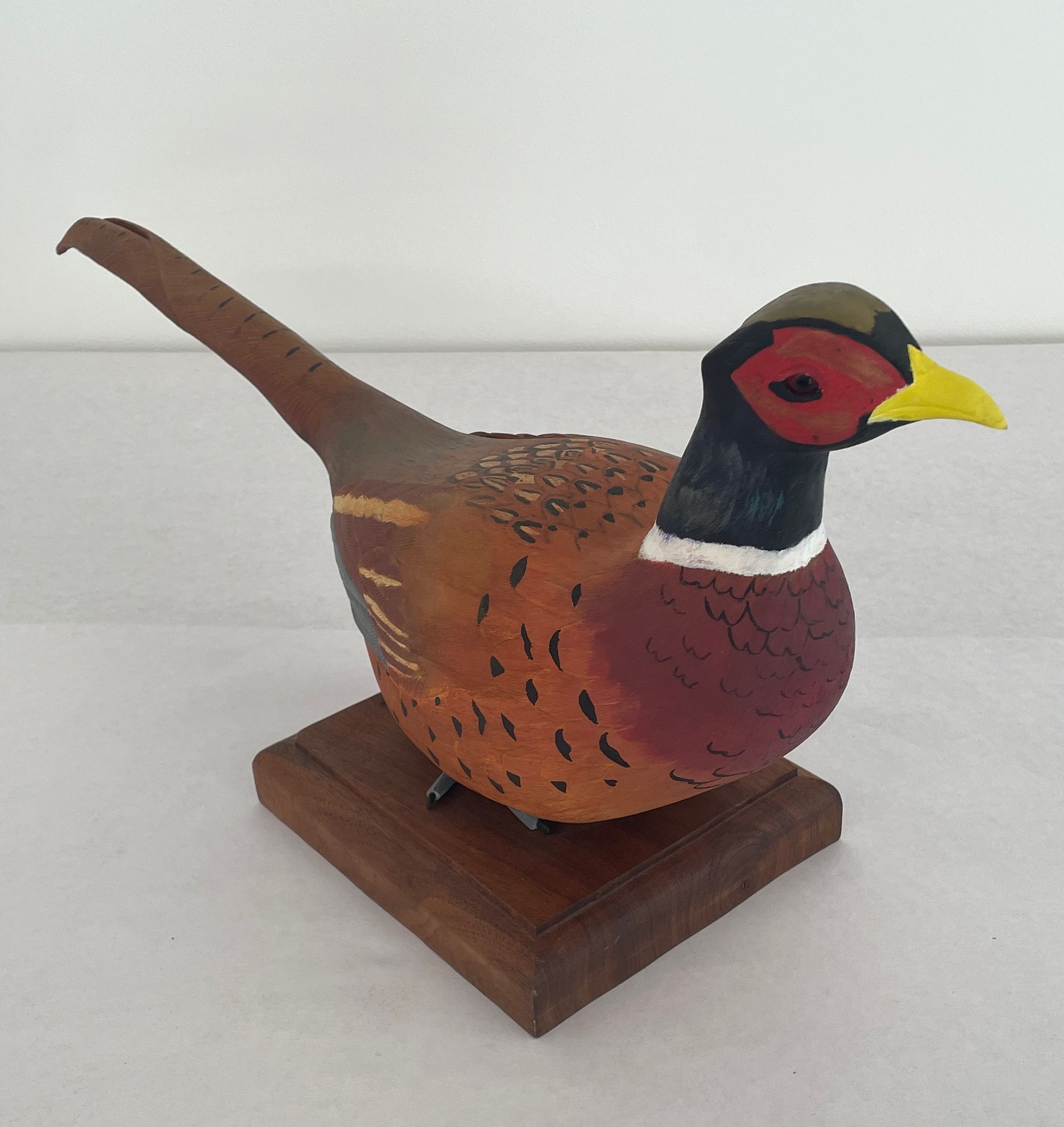 A hand carved and painted wood decoy. Head is black gold-tan red with yellow beak, orange red and gold around the eyes. Body is painted in various browns with black flecks and white wring around the neck. A long feathered tail has black markings. The bird's gray feet are secured to a stained wood platform.Artwork Details