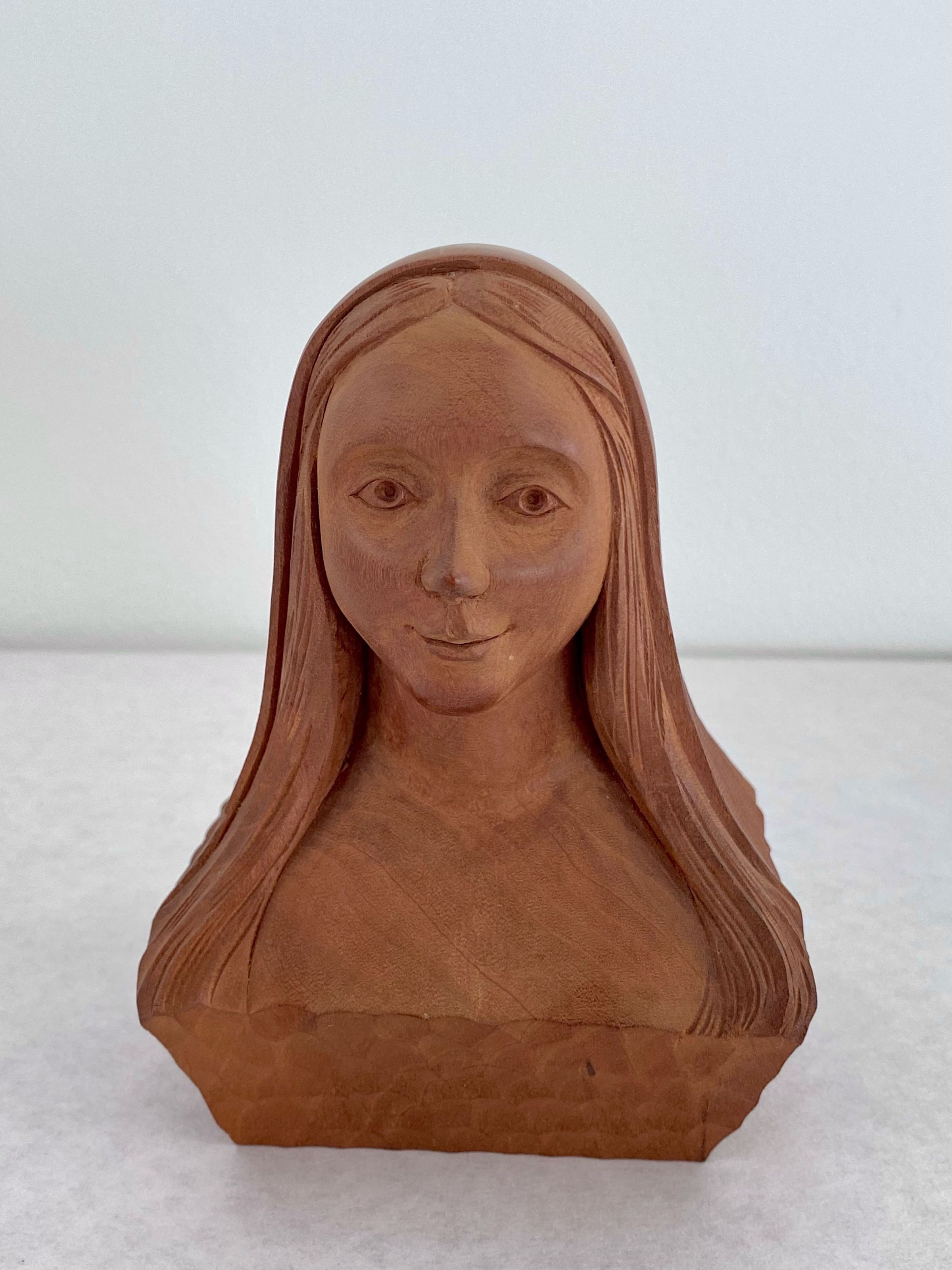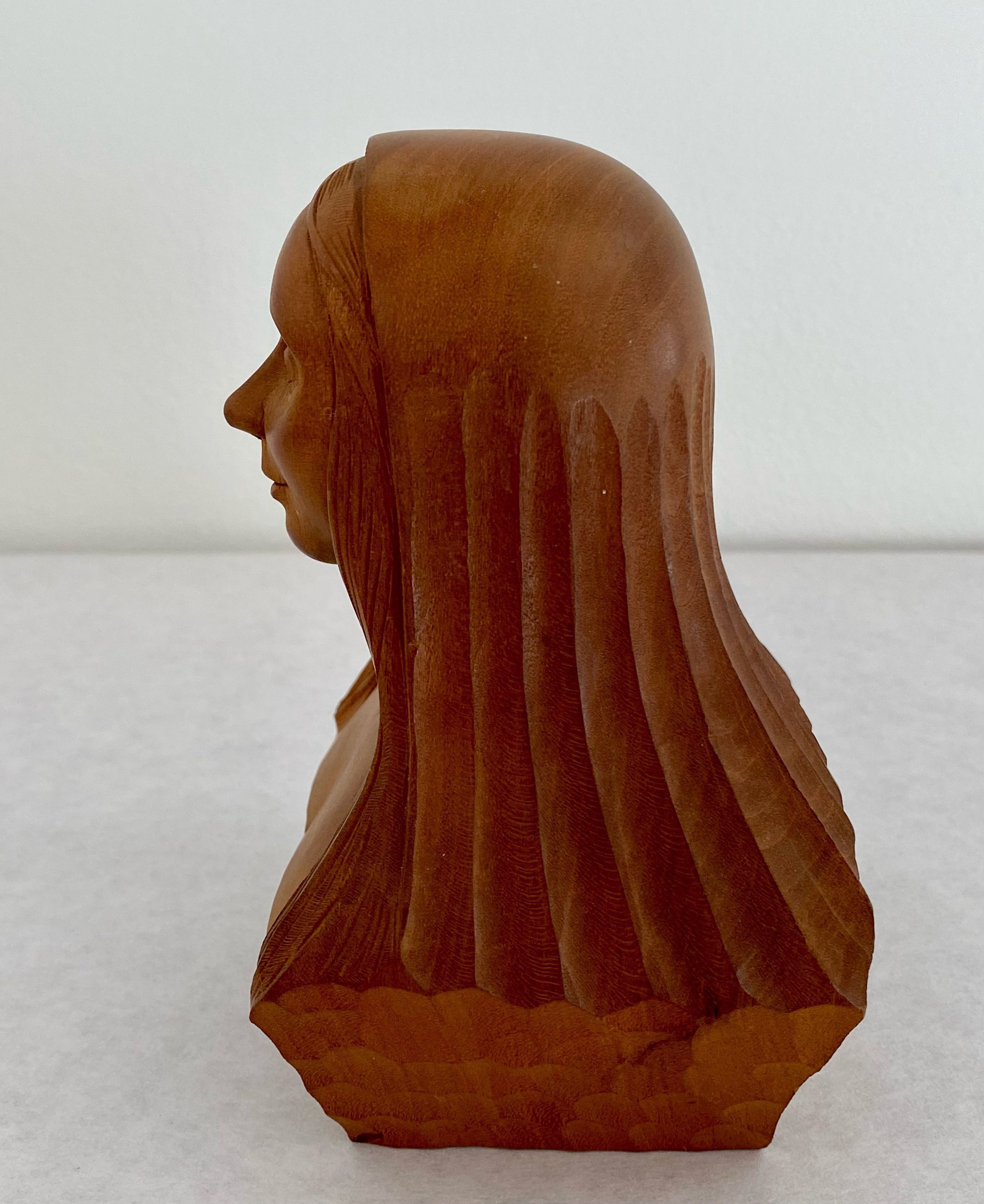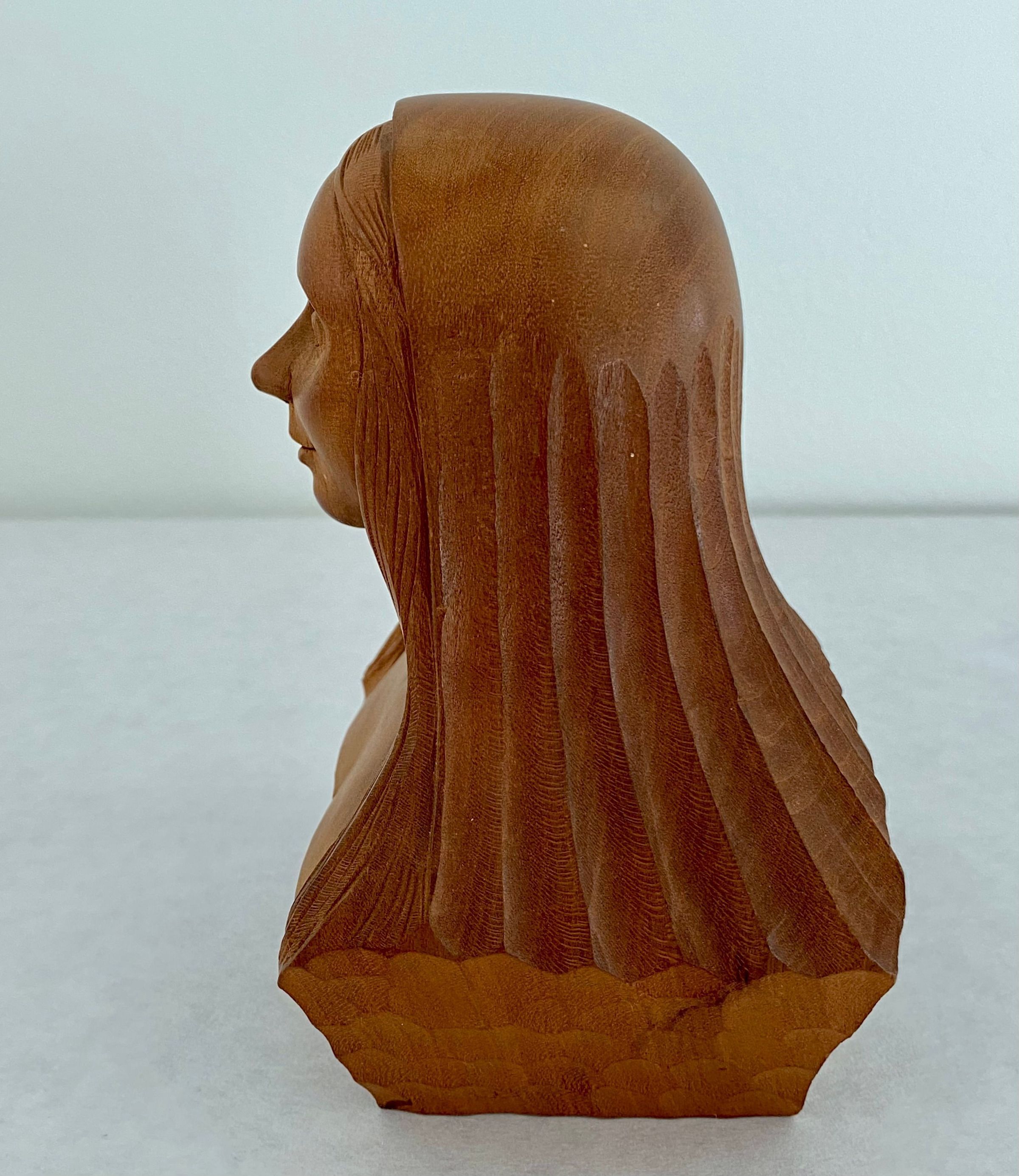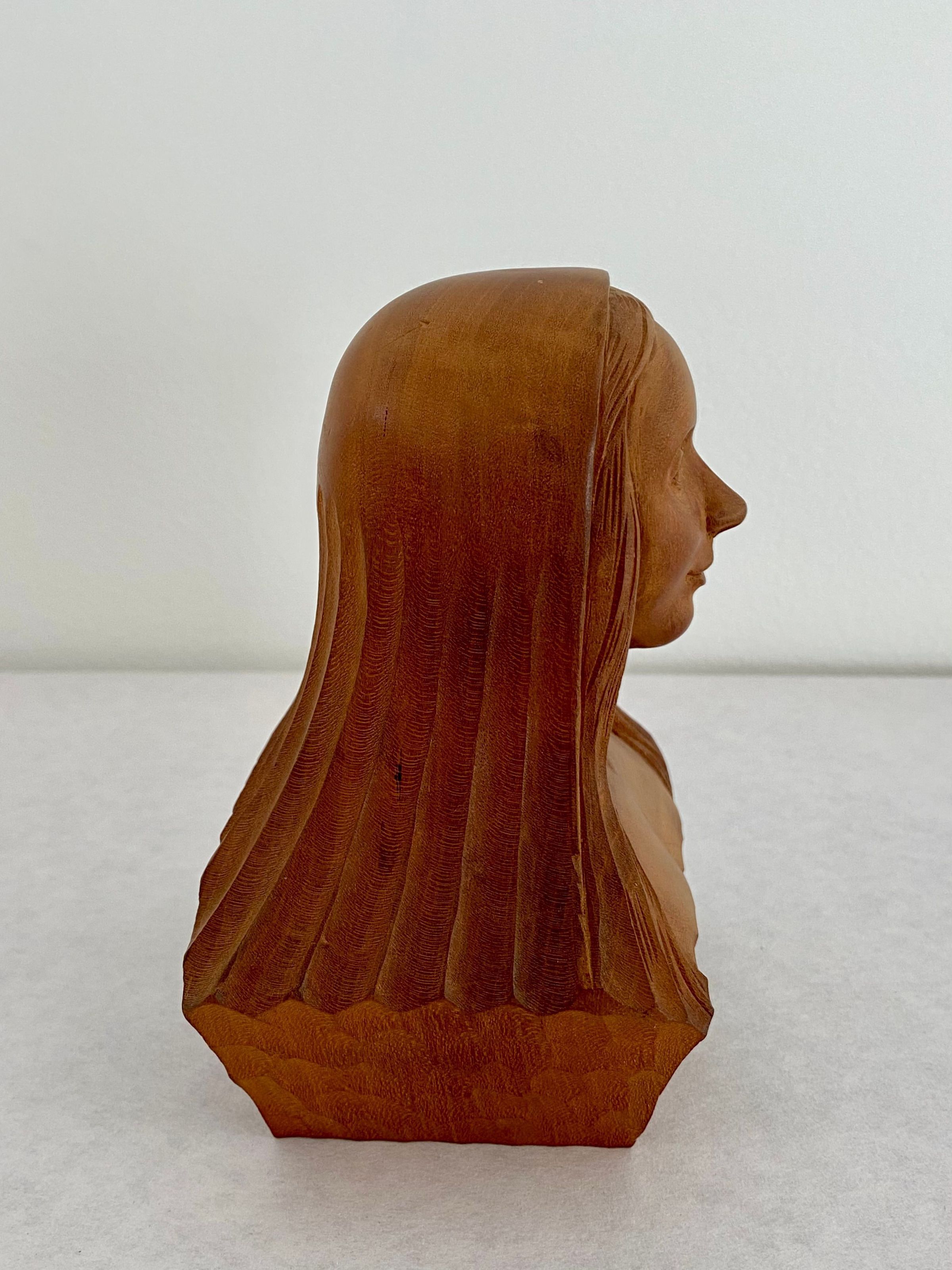 Bust of Madonna carved from a medium brown toned walnut face is simple protruded nose, hair and head covering together and drape entire piece.Collection