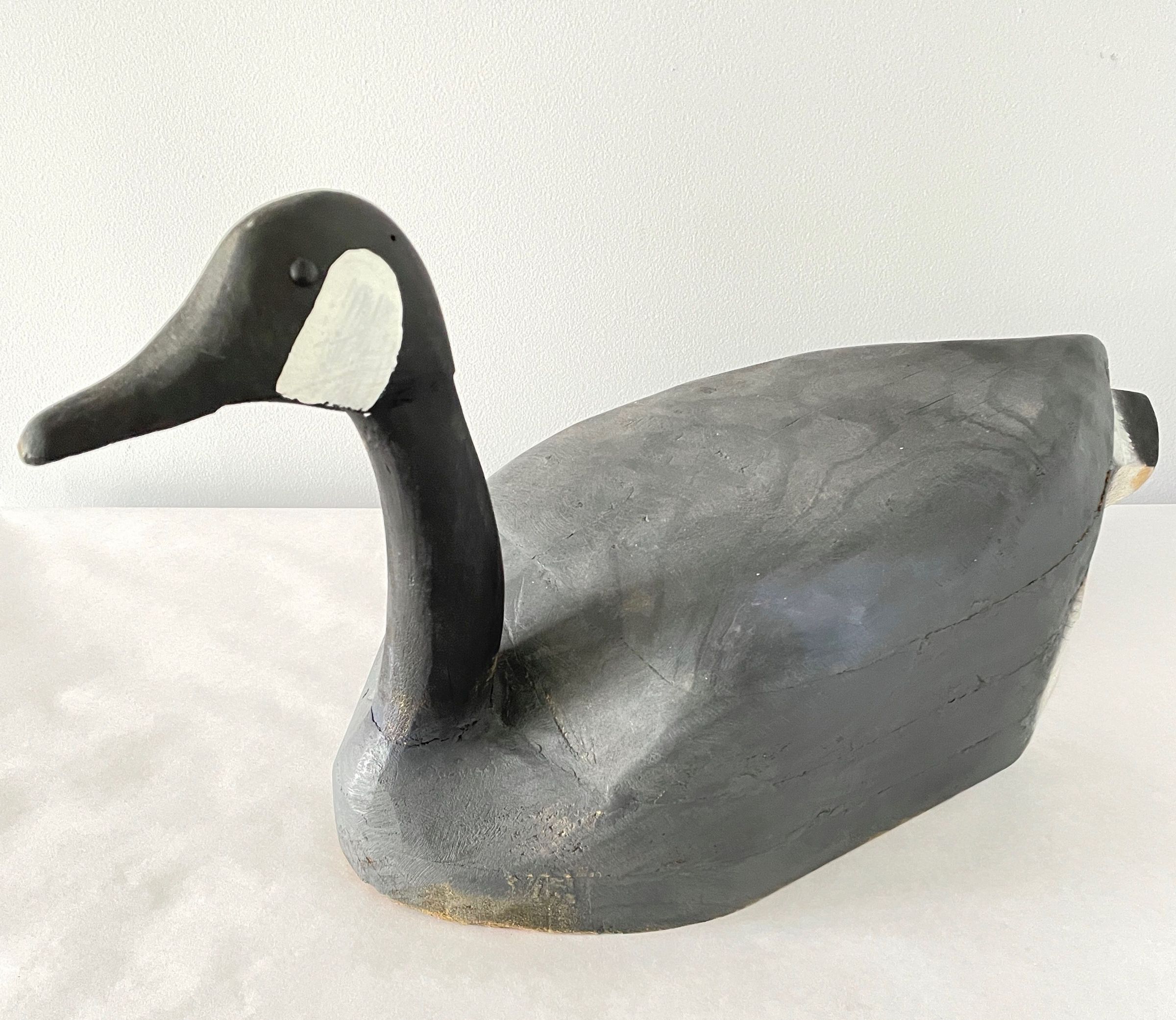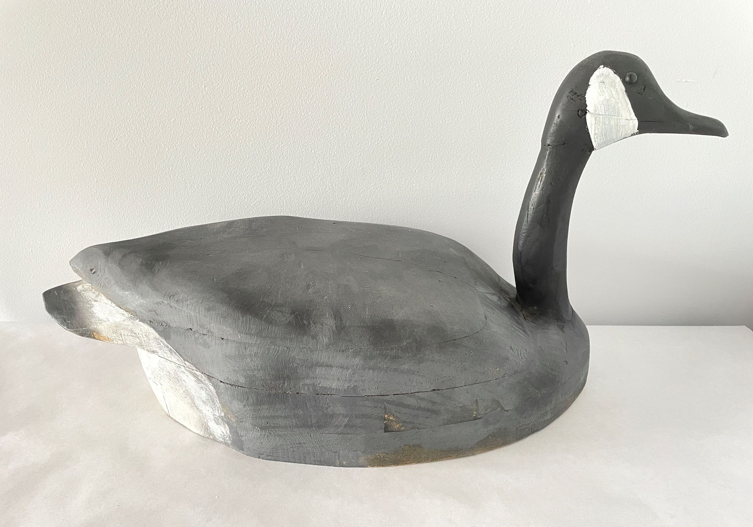 Large goose decoy. Grey body accented with white in rear. Head and long neck are painted black and with white patches on side of head.Collection