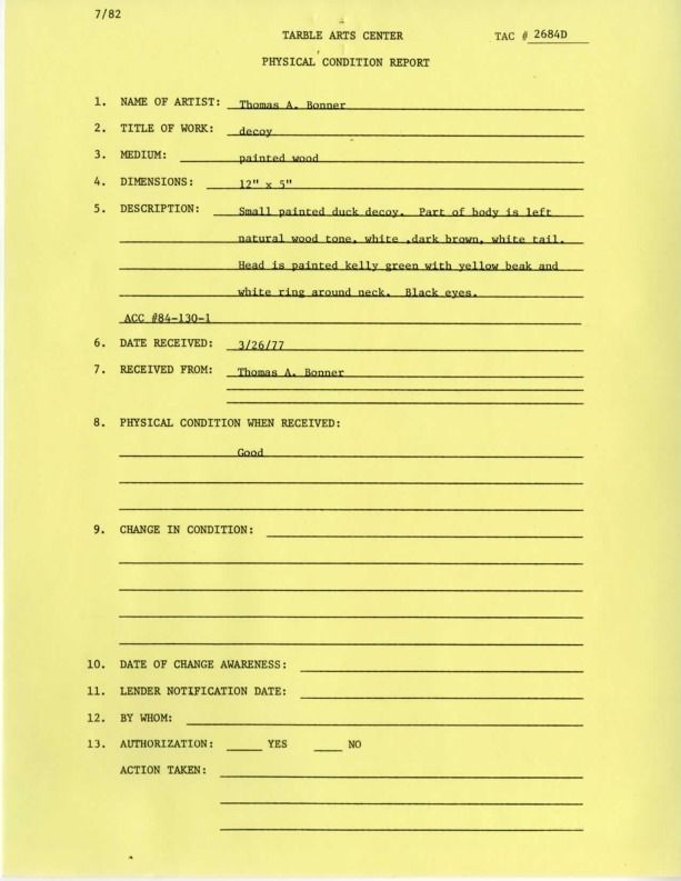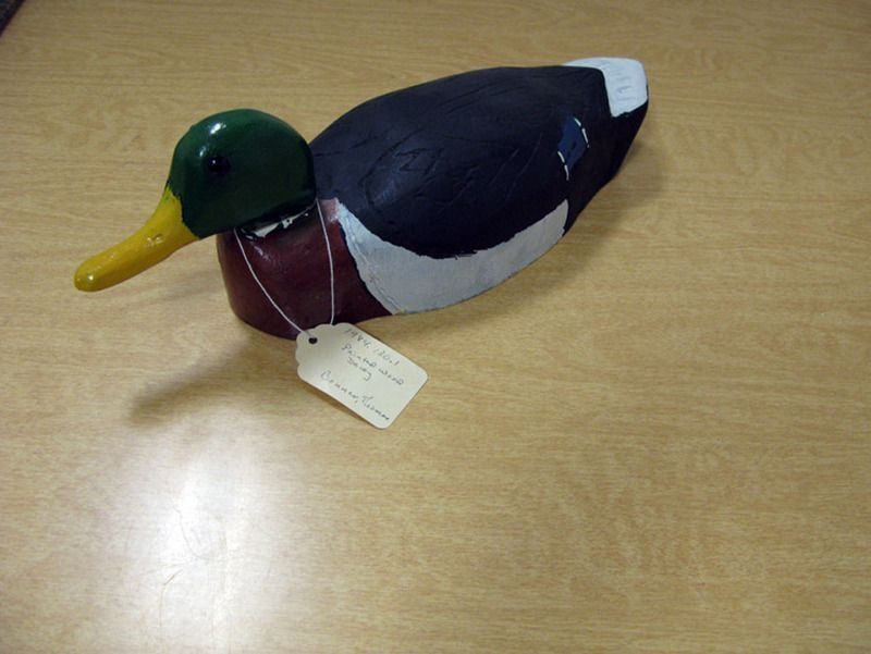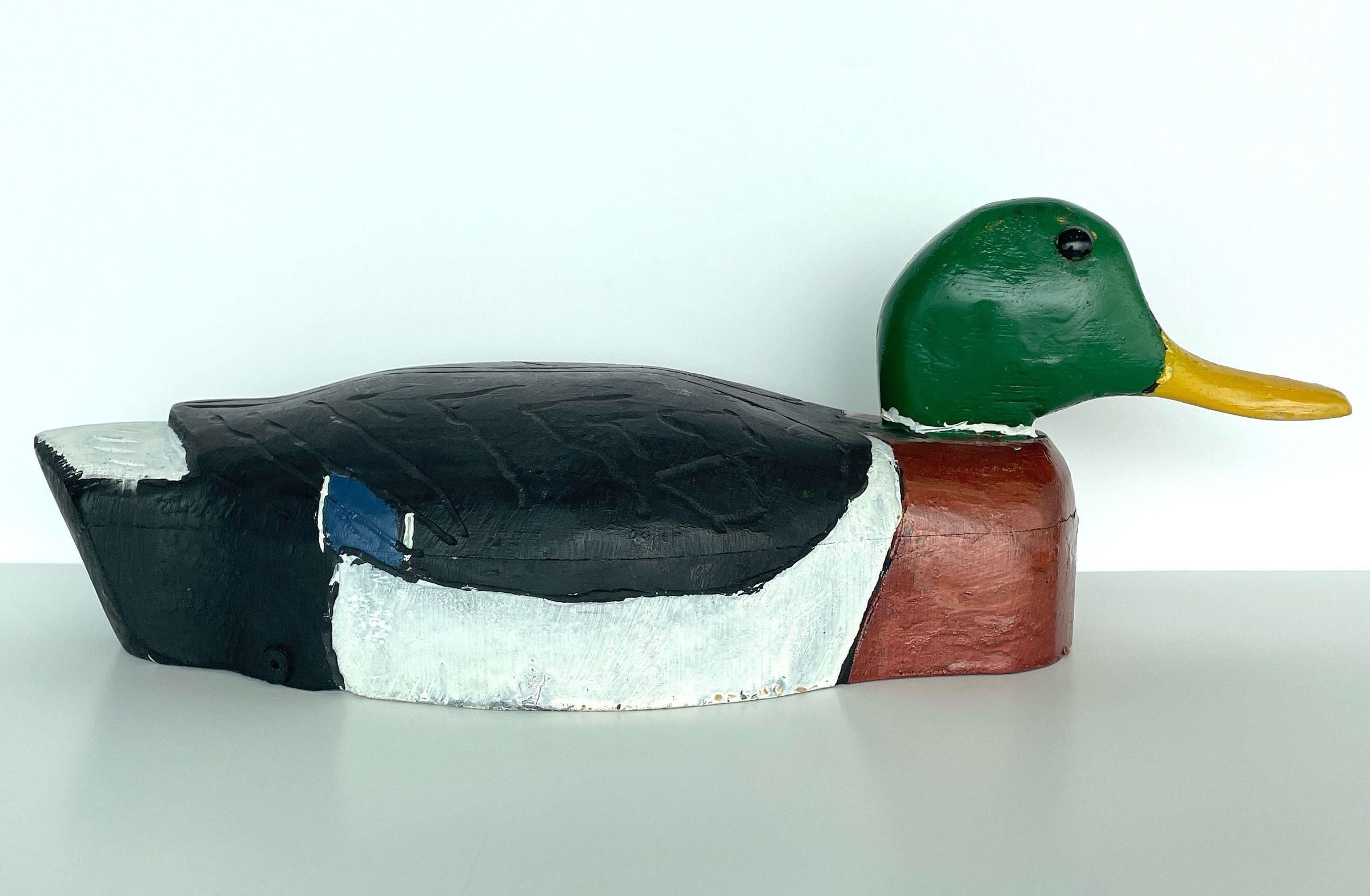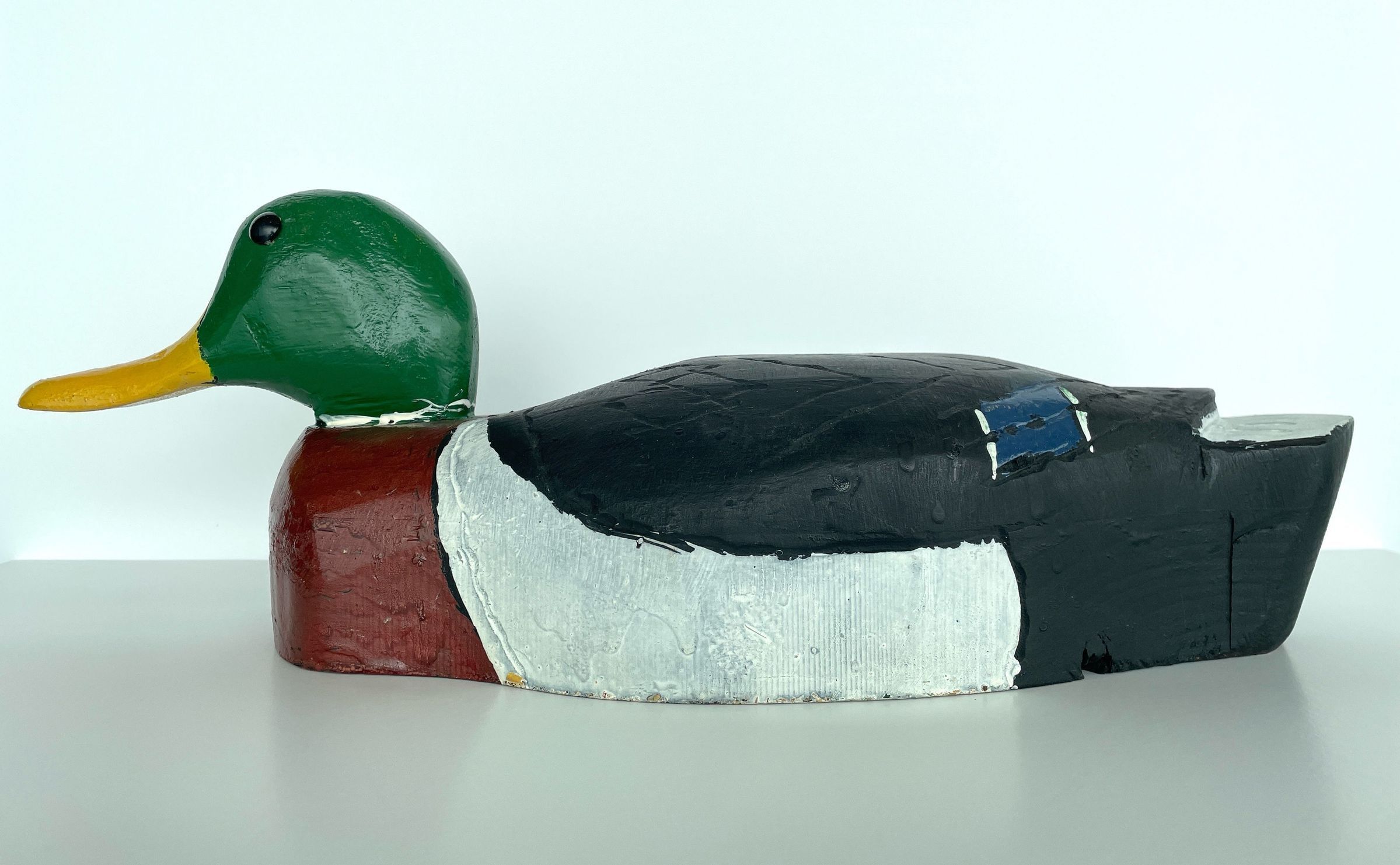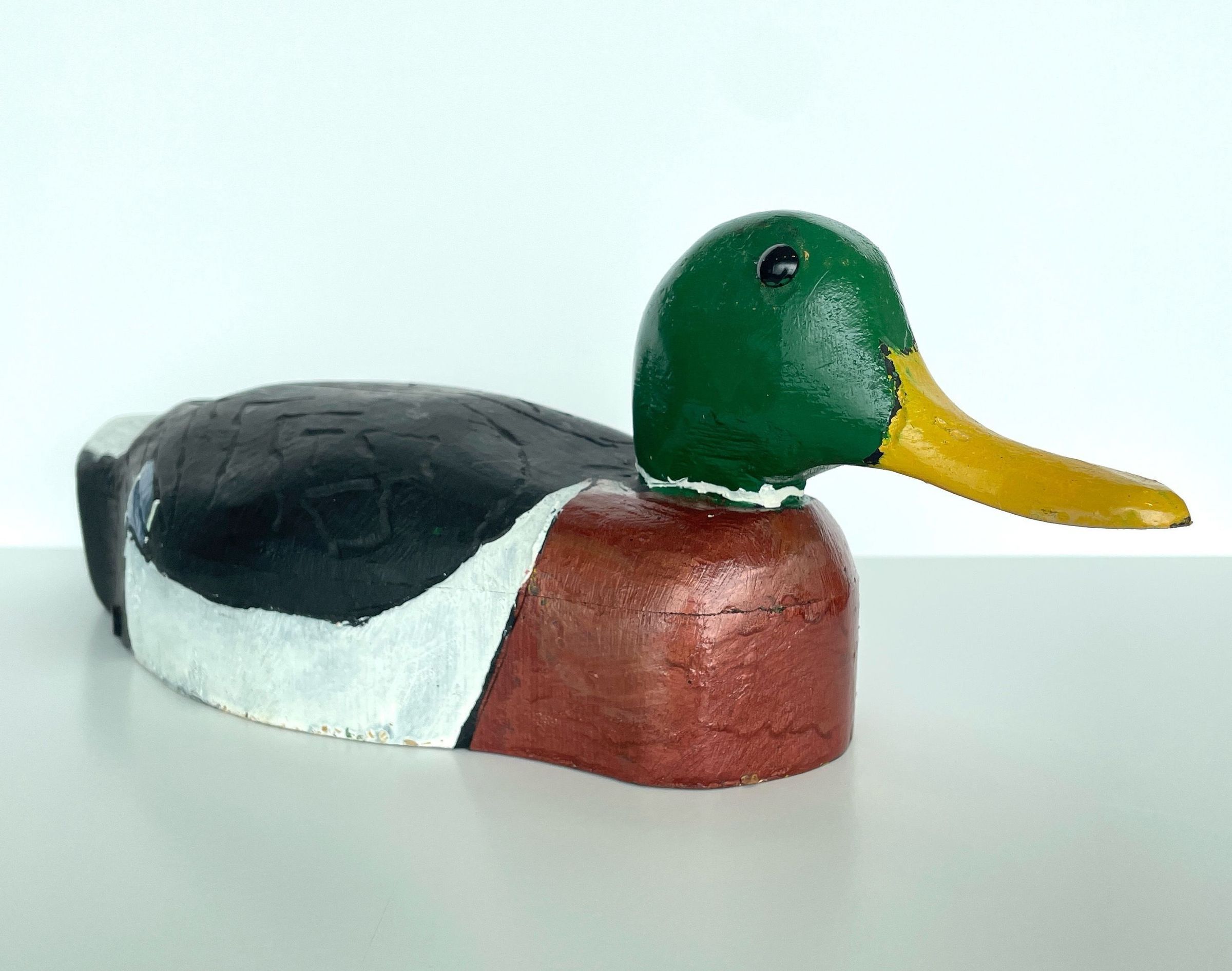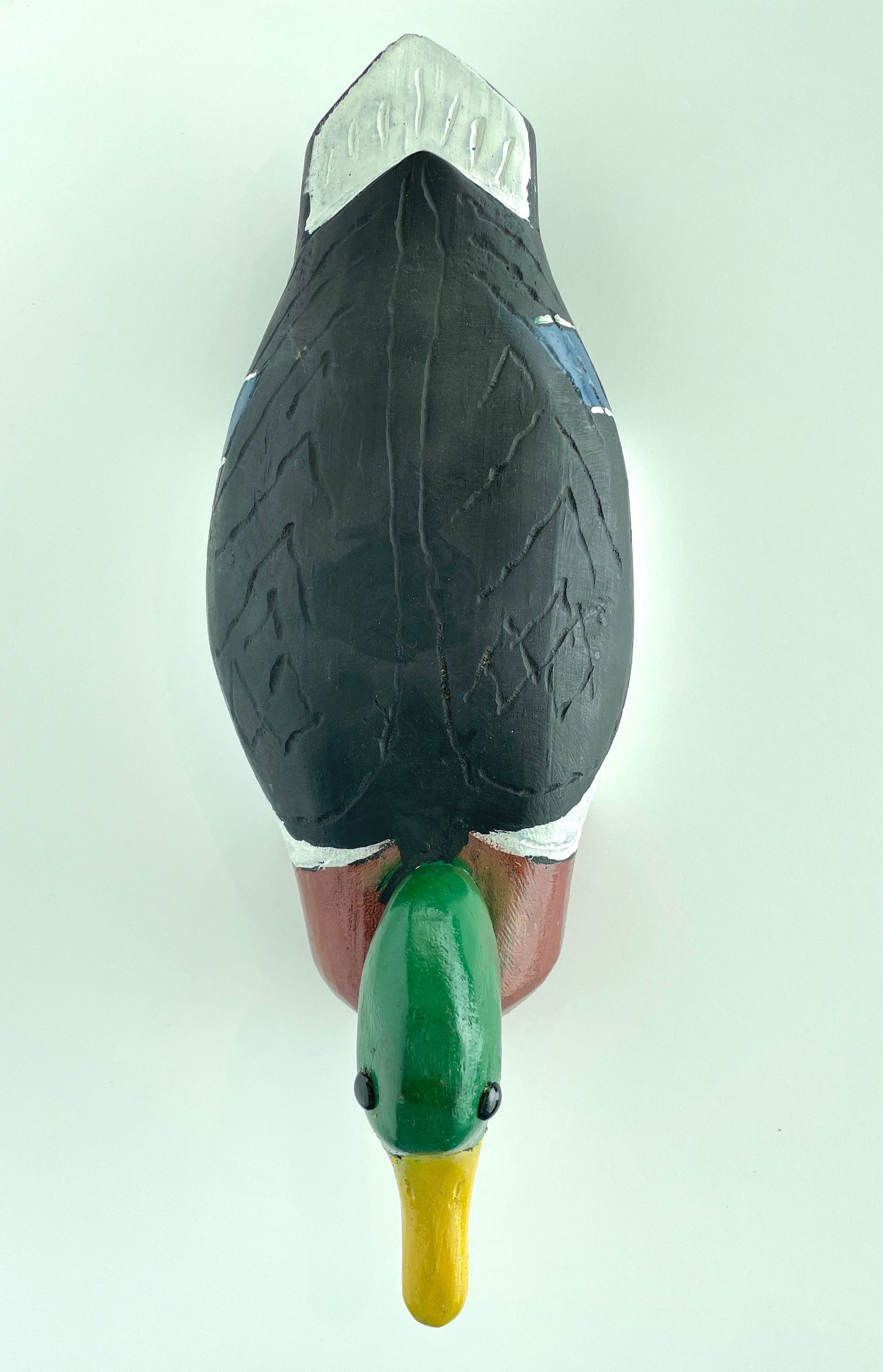 Small painted duck decoy. Part of body is left natural wood tone, white dark brown white tail. Head is printed Kelly green with yellow beak and white ring around neck. Black eyes.Collection
