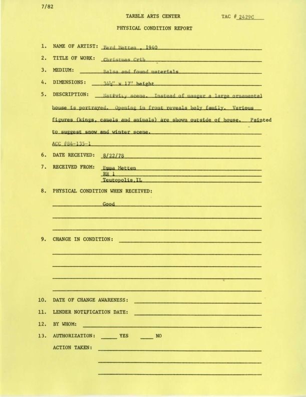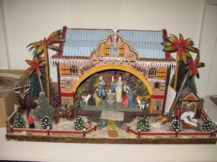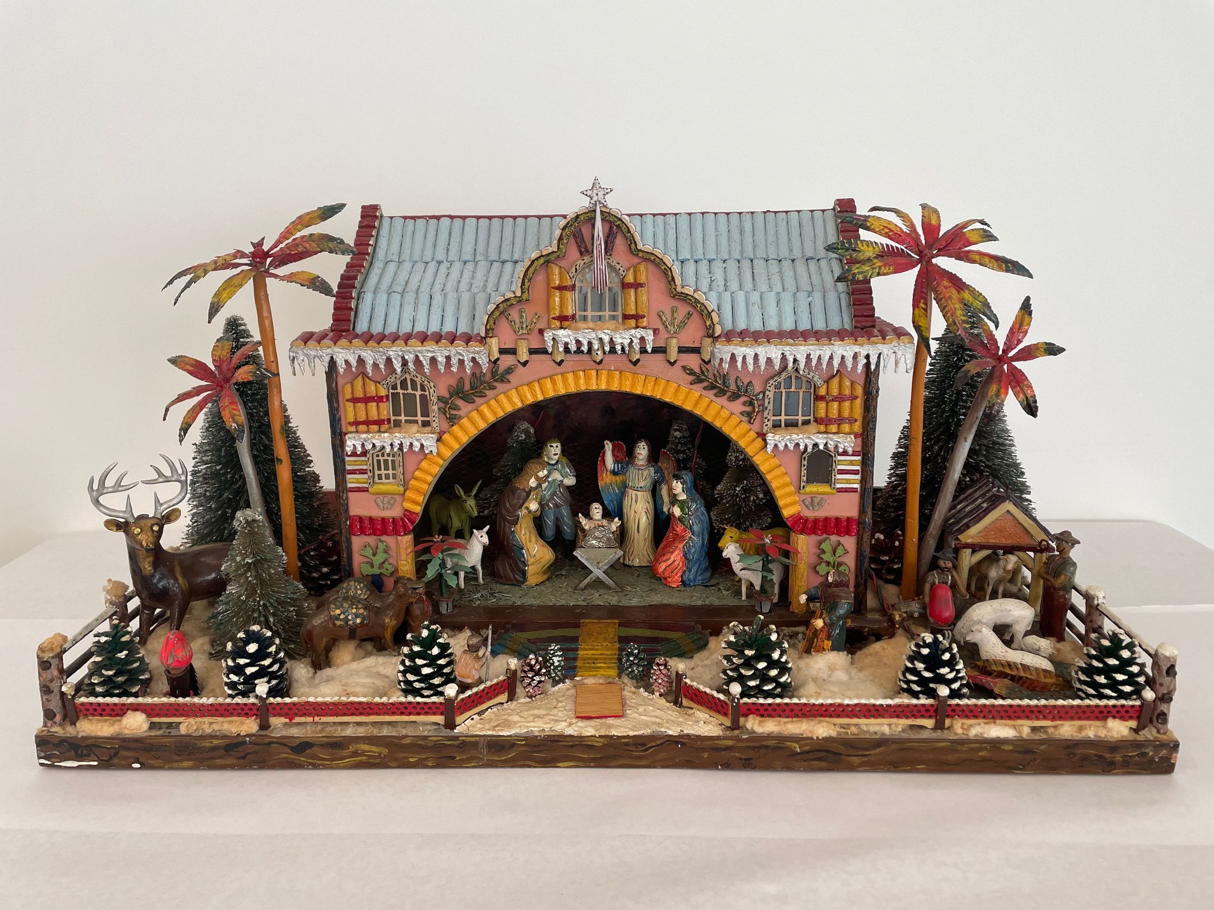 An assembled diorama of a manger scene. The manger is a large ornate structure with a blue roof and yellow and red shutters. Opening in front revealing a the holy family. Inside Mary, Joseph, the baby Jesus, angels, and animals. Various figures (kings, camels and animals) are shown outside of house. Painted to suggest snow, a winter scene.Artwork Details