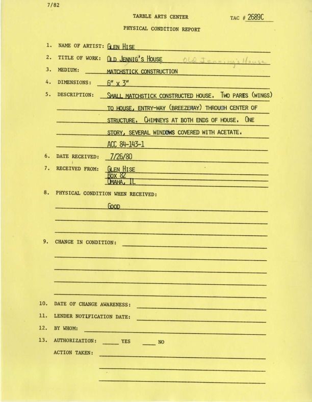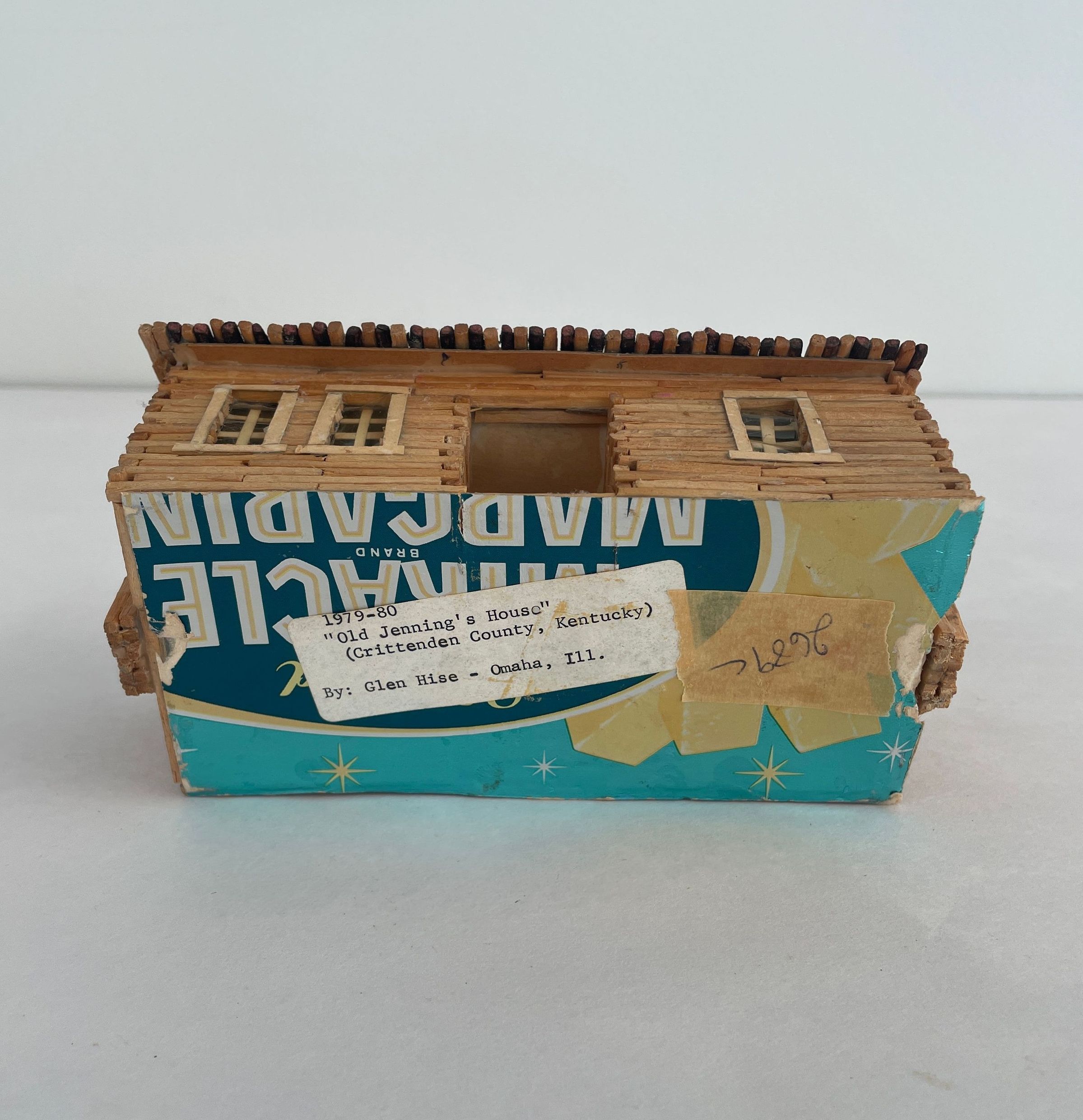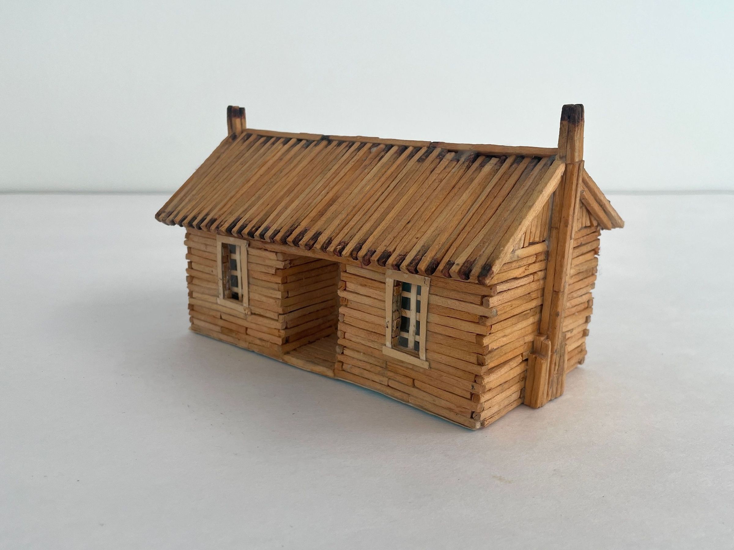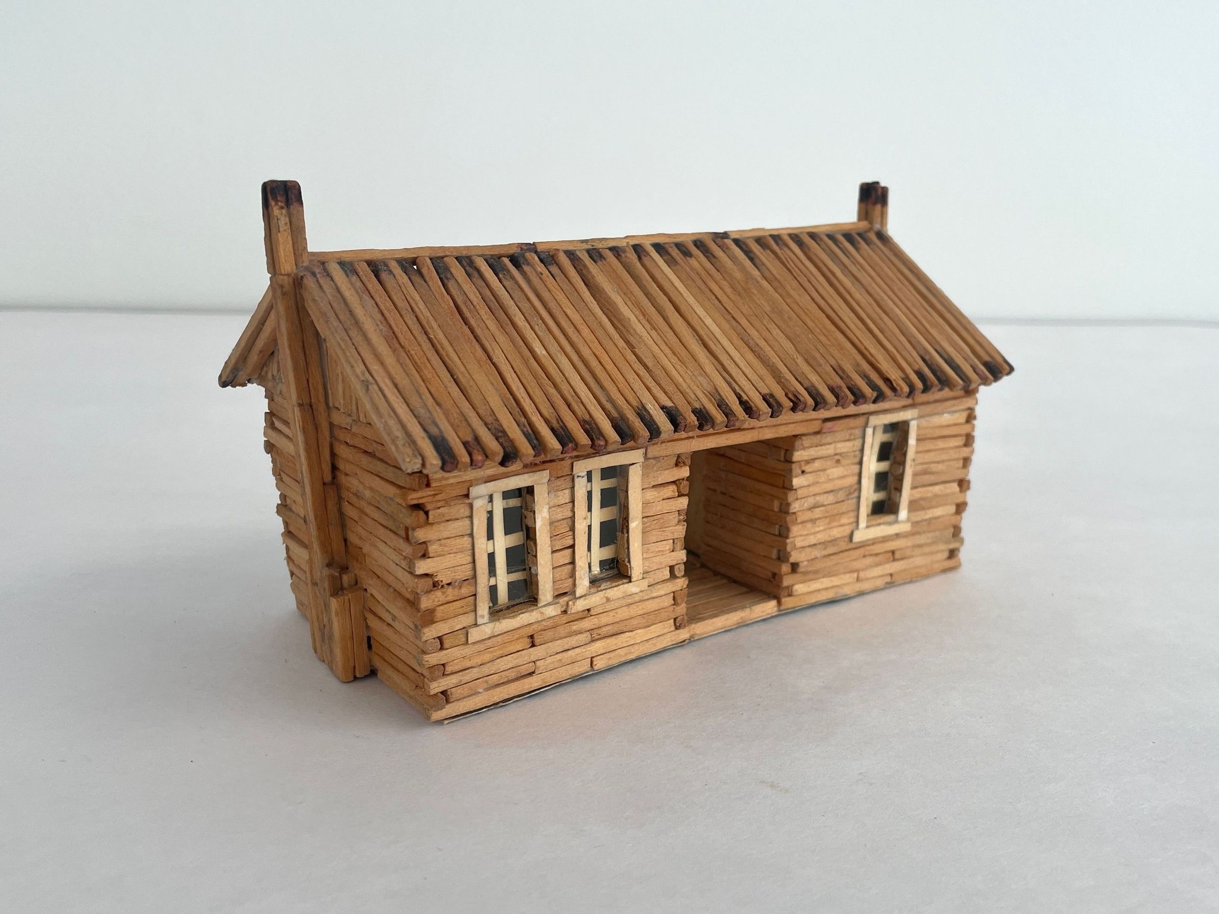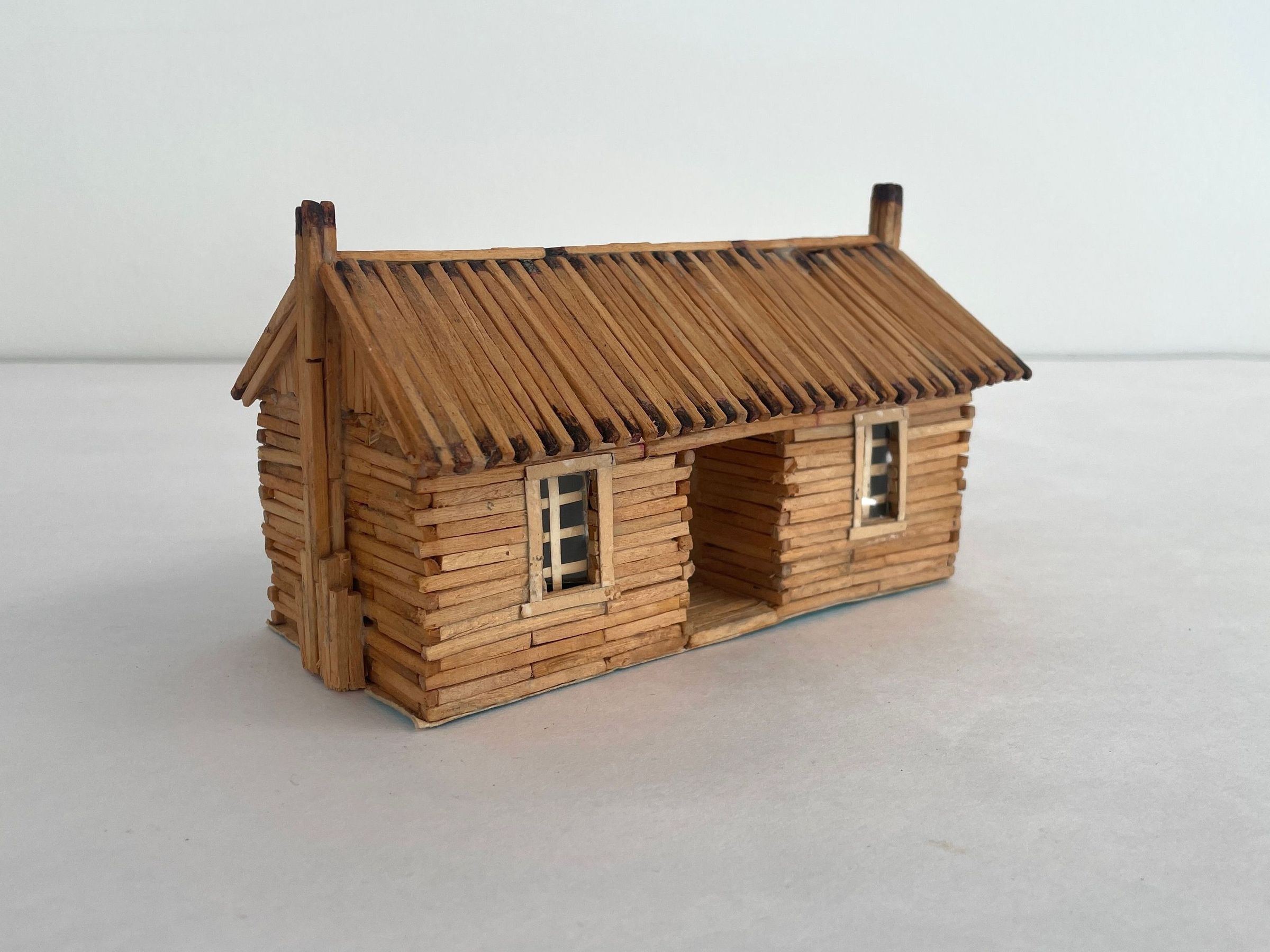 Small matchstick construction house. Two parts (wings) to house entry-way (Breezeway) through center structure. Chimneys at both ends of house. One story, several windows covered with acetate.Artwork Details