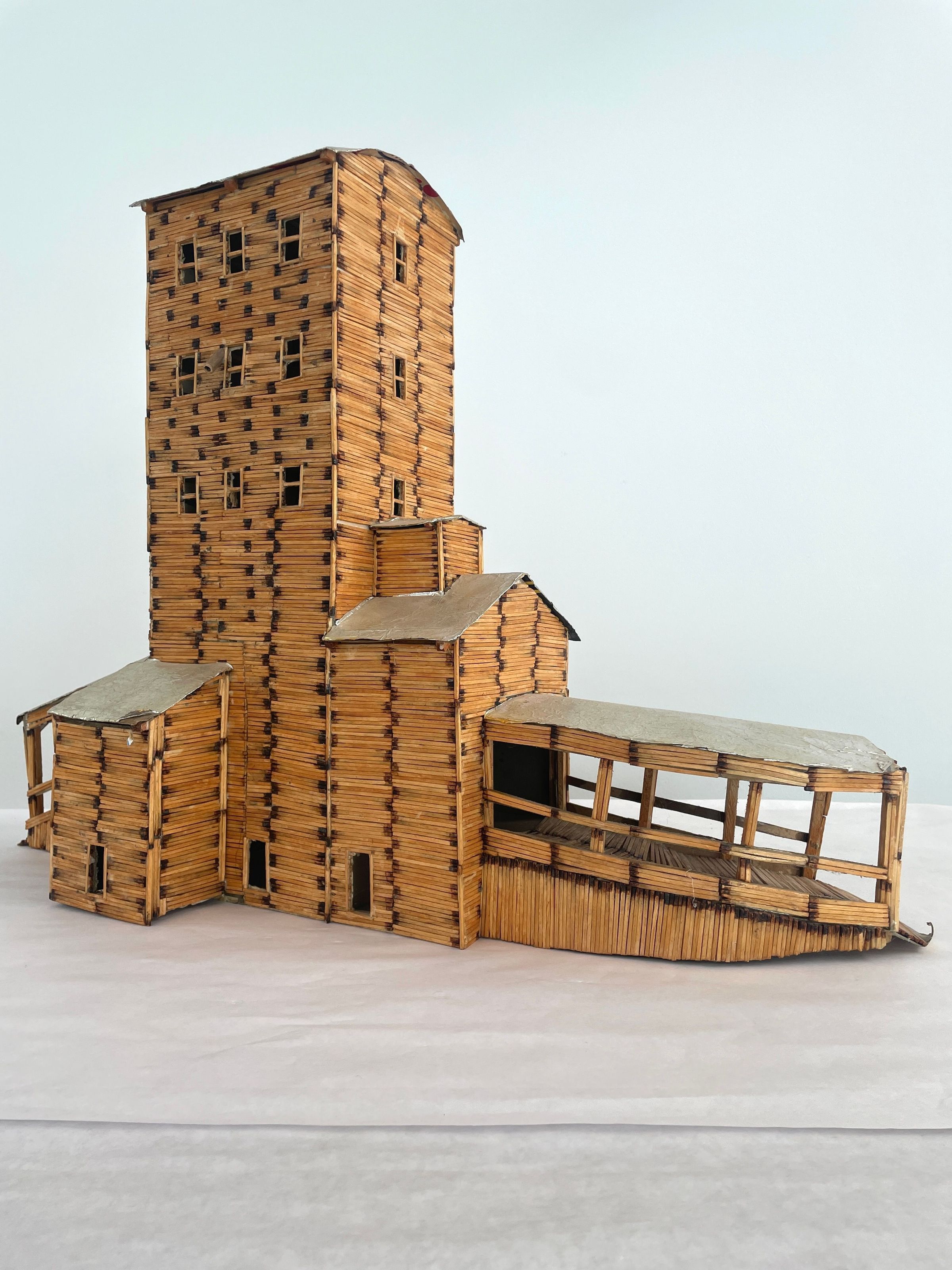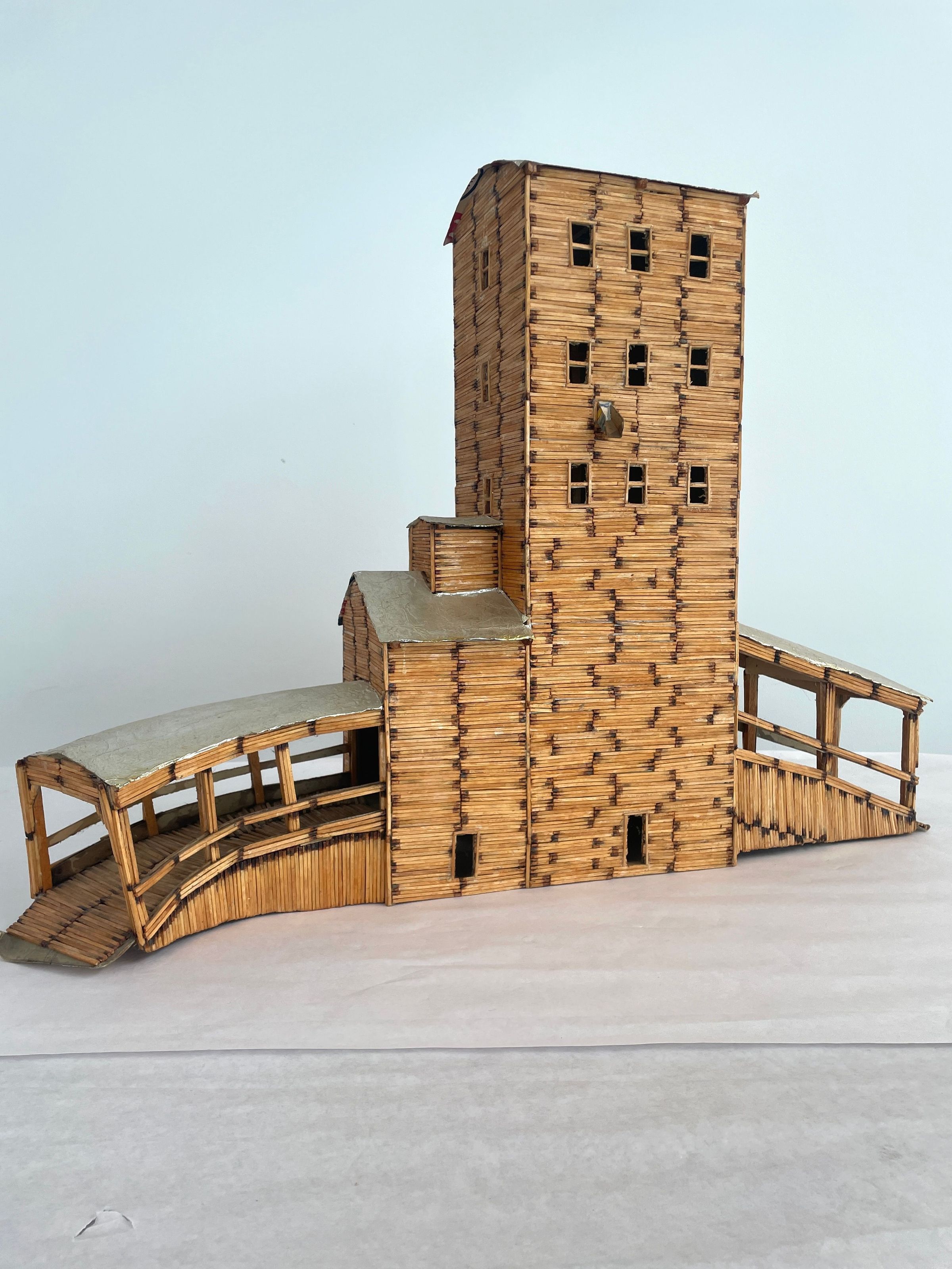 Large structure with tall square tower rising from mid-section. Low arched decks (loading) descend from either side of structure. Roofed sections are made from cardboard.Artwork Details