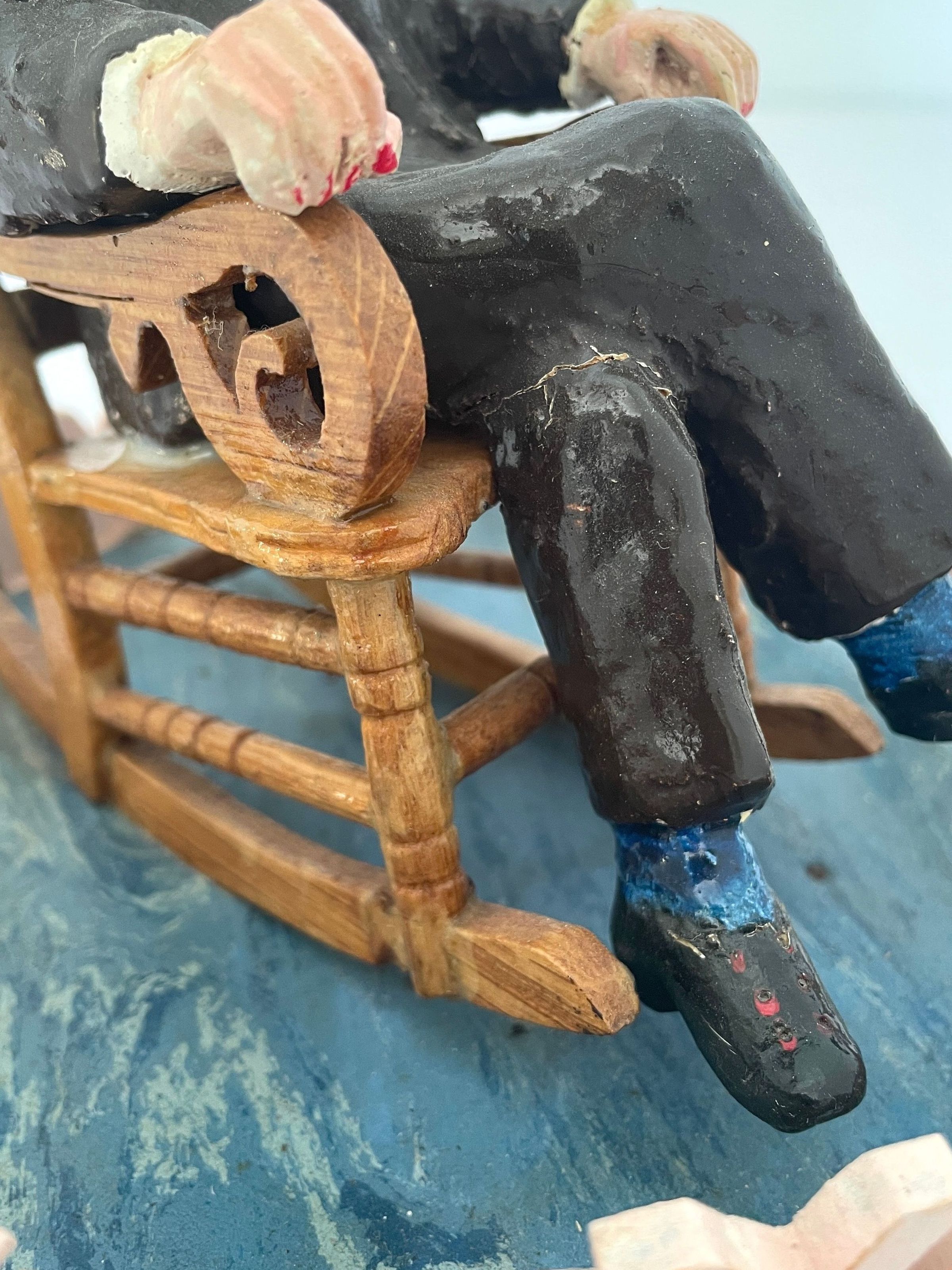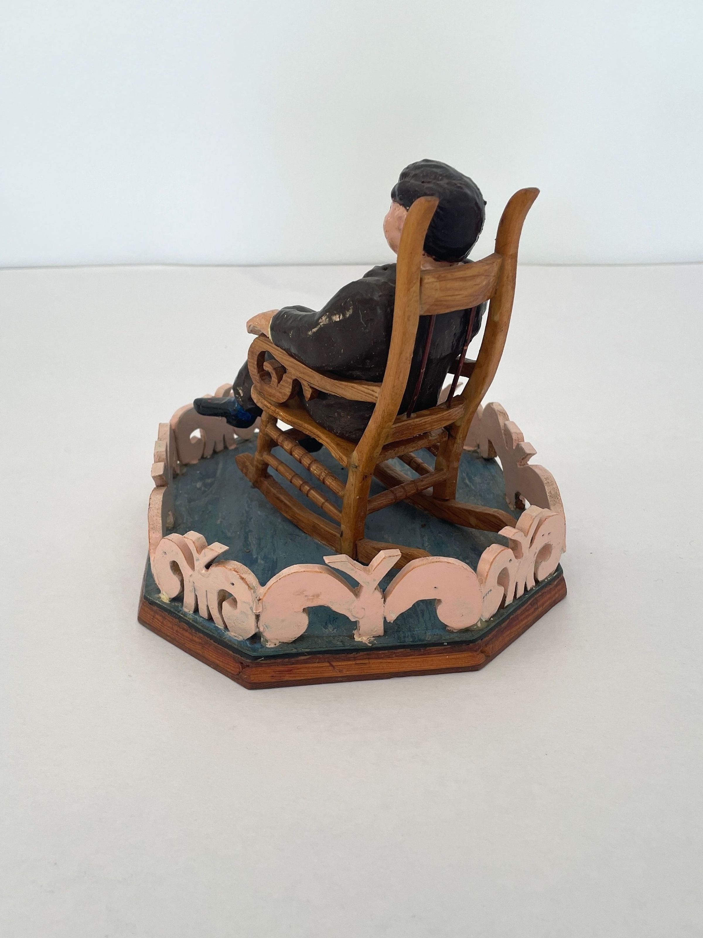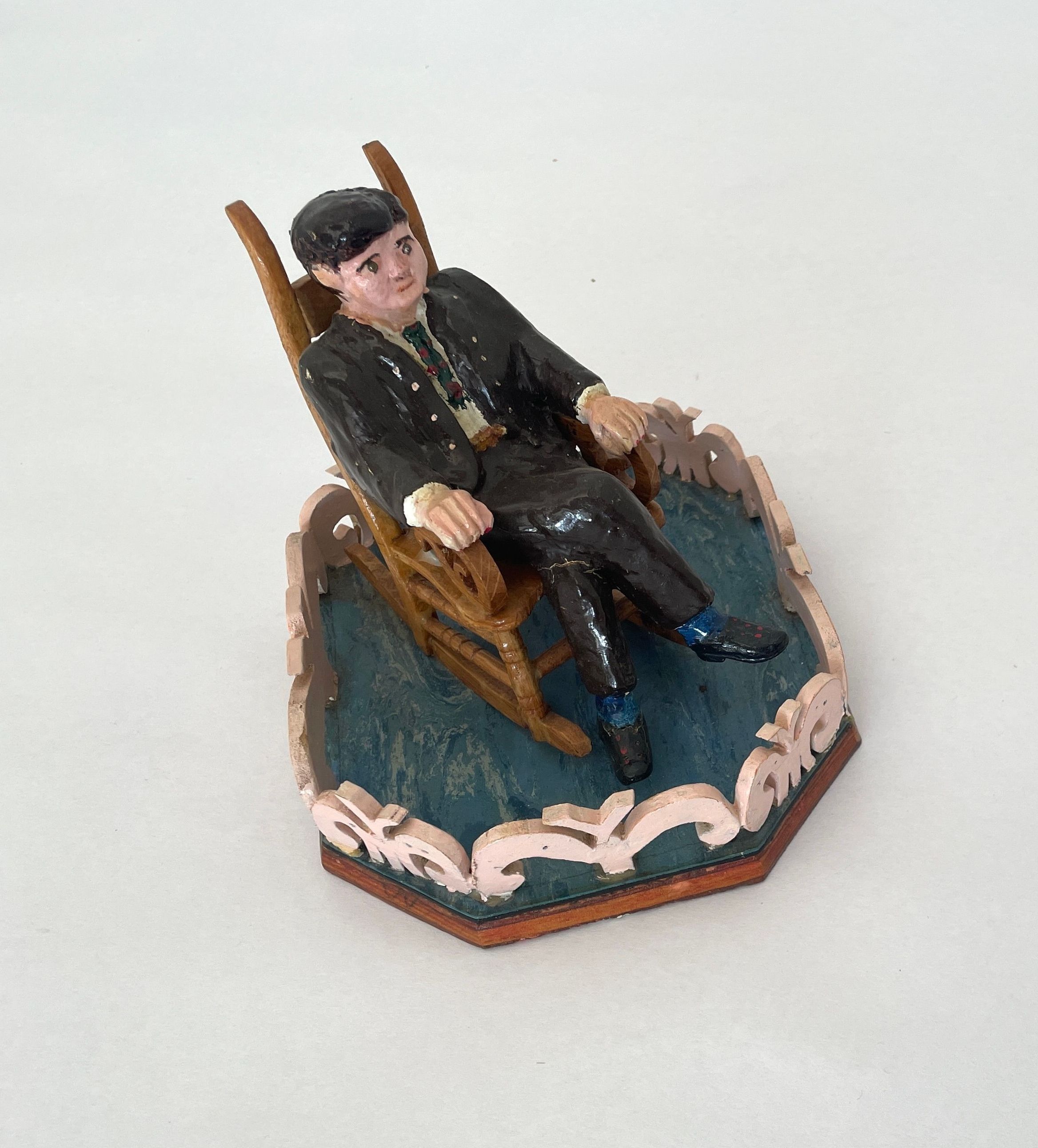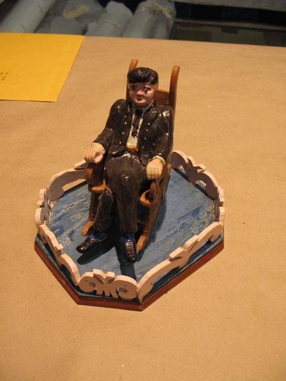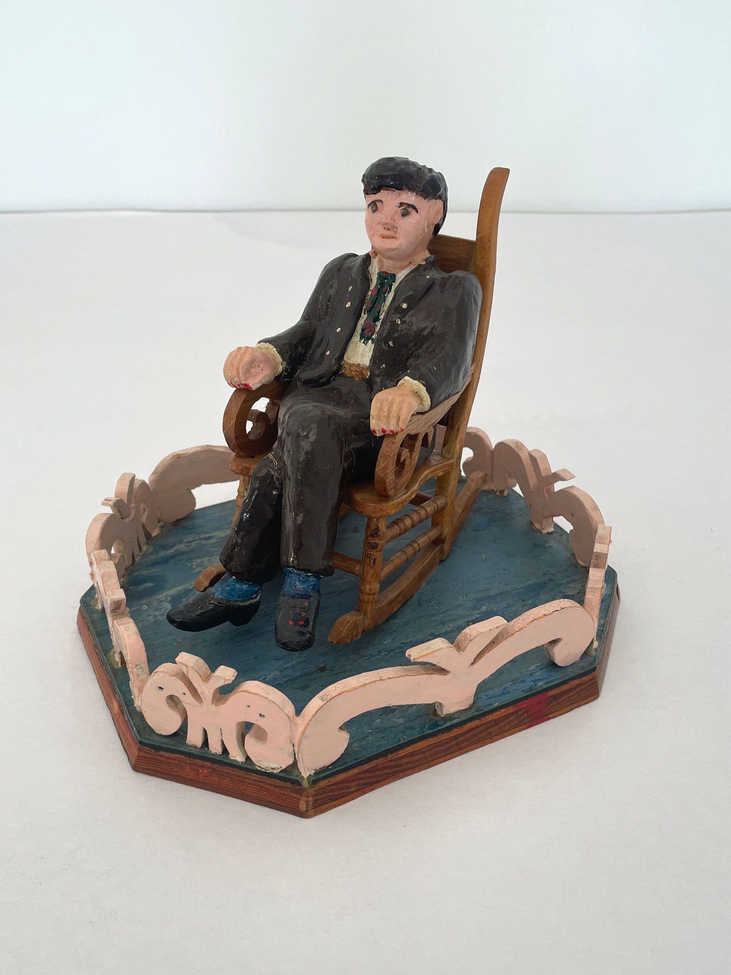 Carving depicts J.F.K. lounging in wooden rocking chair.Wearing brown suit white shirt green and red tie. Base is painted blue with pink carved edging surrounding it.Artwork Details