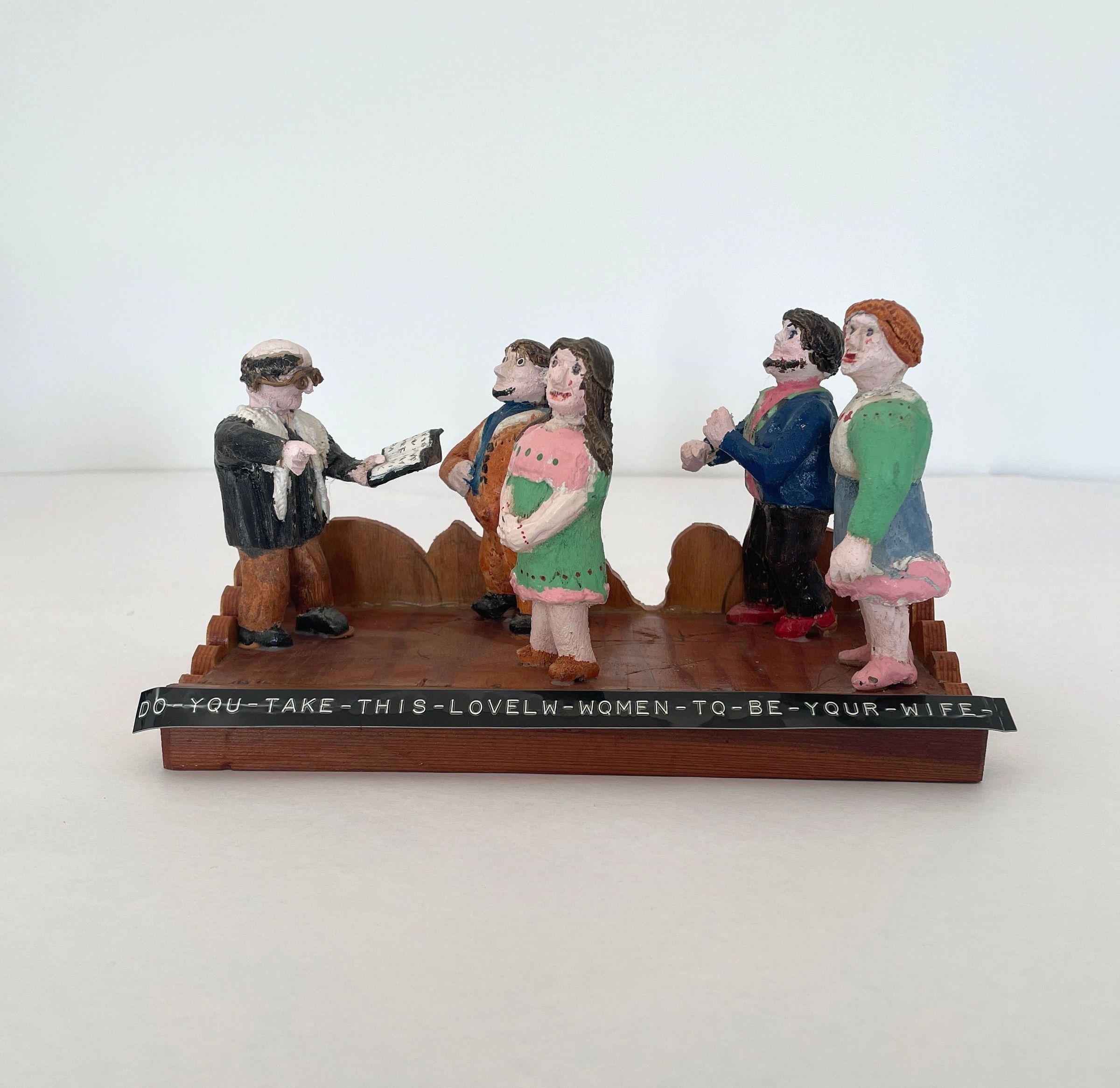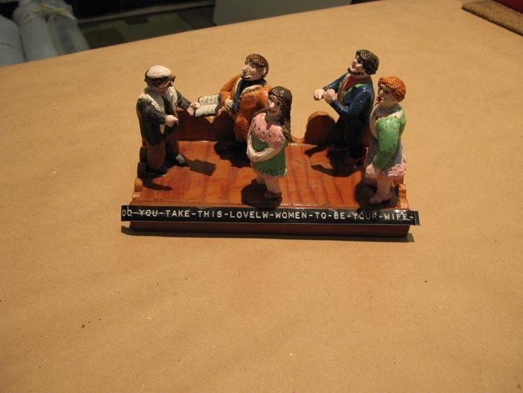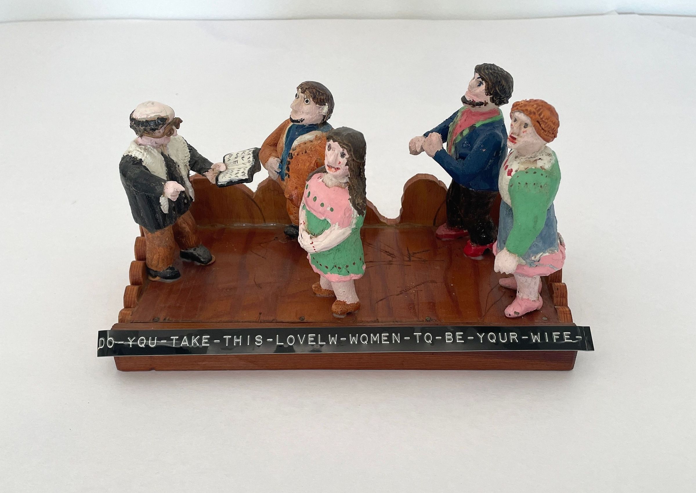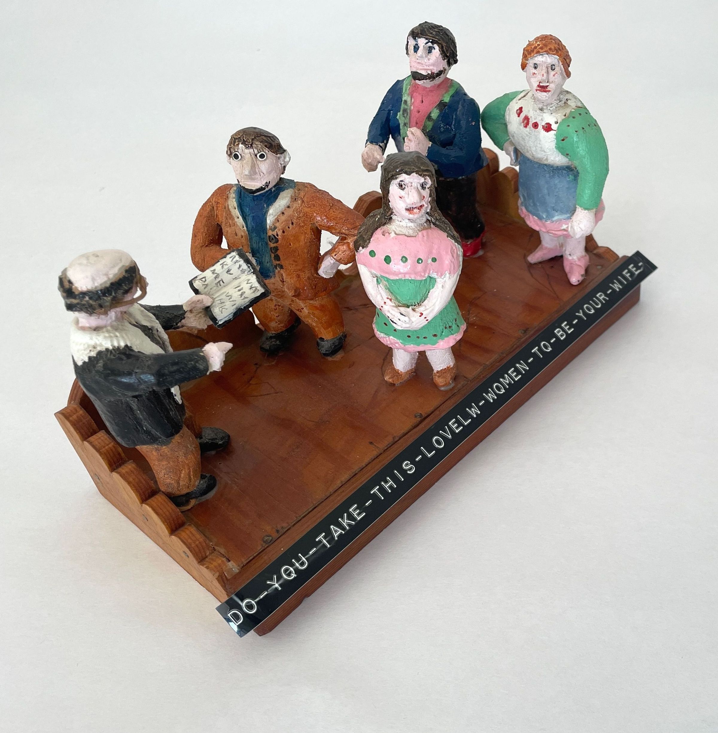 Scene depicts wedding ceremony set upon a natural wood base. Black label in front reads "You take this-lovely-women-to be-your-wife." Pastor far left with Bible, two couples in front.Collection