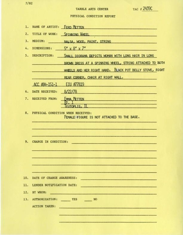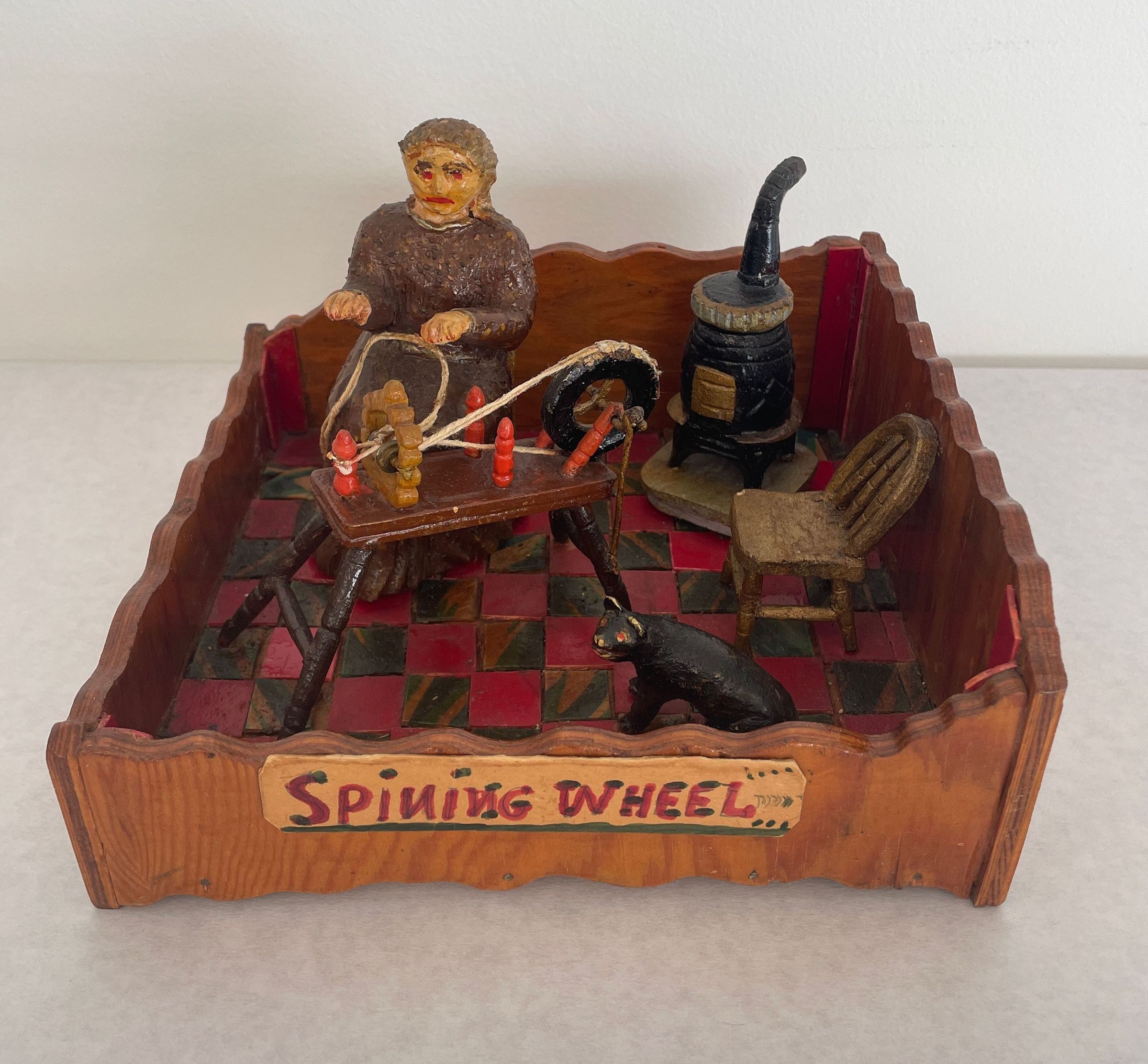 Small diorama depicts woman with long hair in long brown dress at a spinning wheel, string attached to both wheel and her right hand. Black pot belly stove right rear corner, chair at right wall.Artwork Details