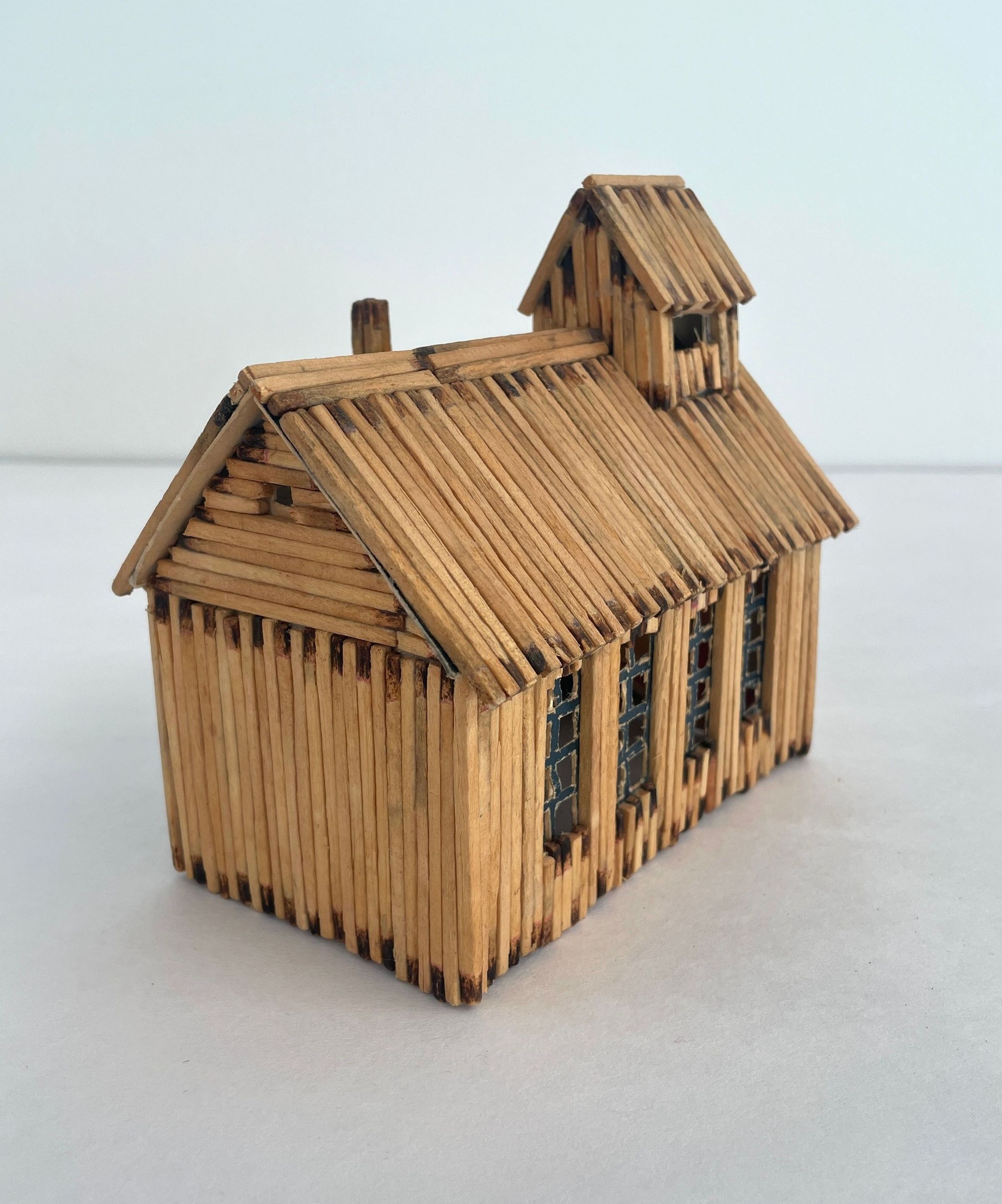 Matchstick construction. All are tan in color with white cardboard trim. School has chimney and school bell on roof.Artwork Details