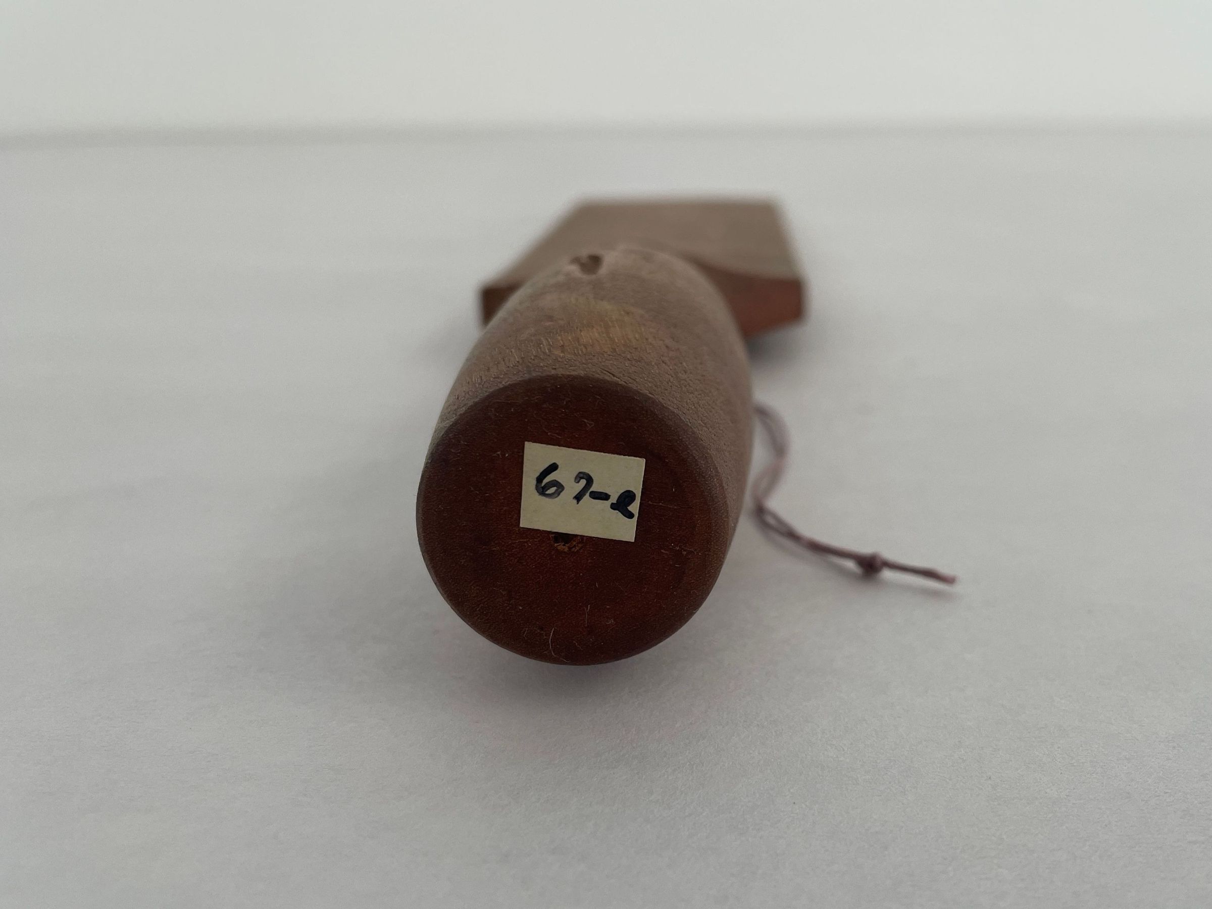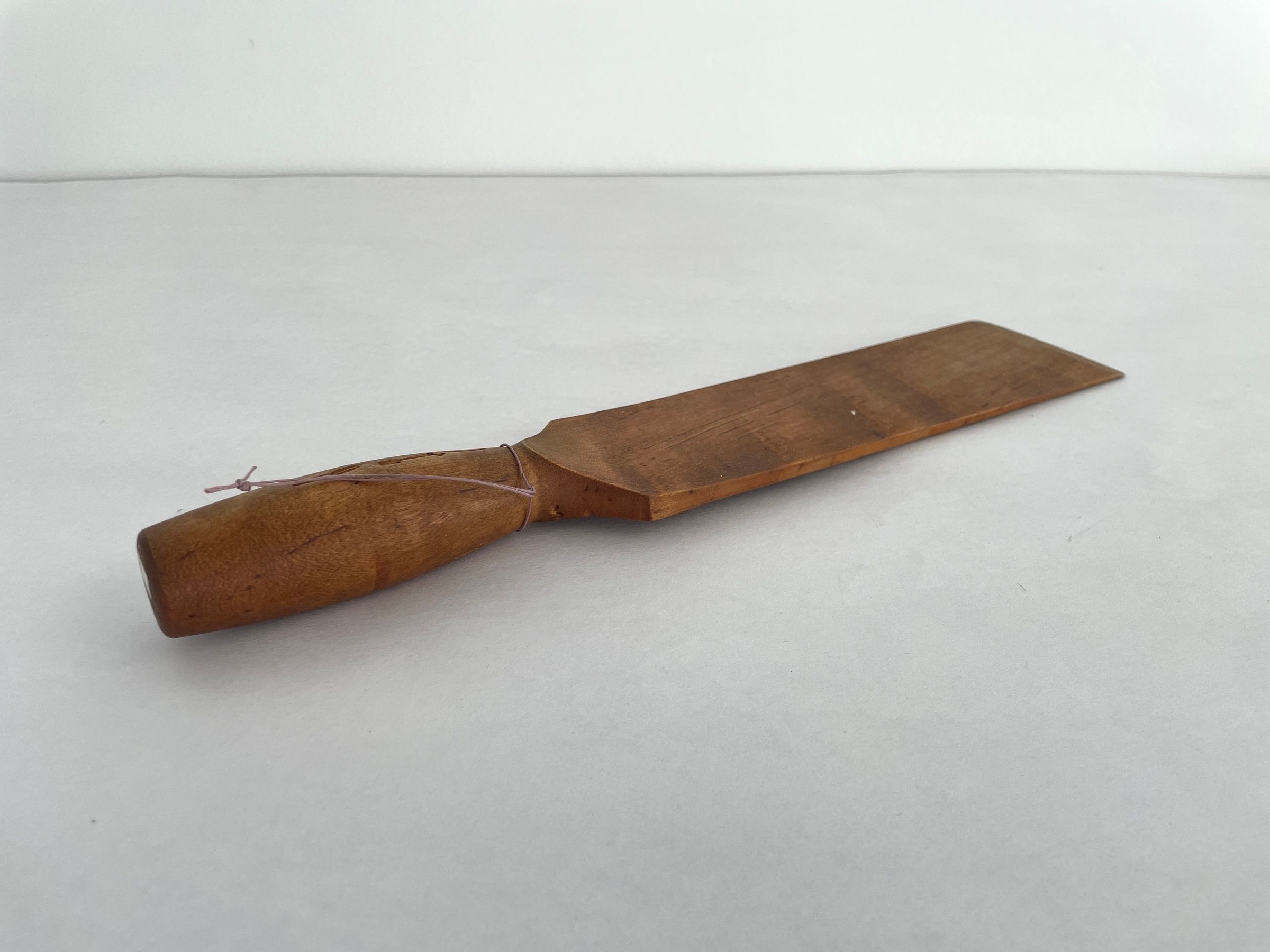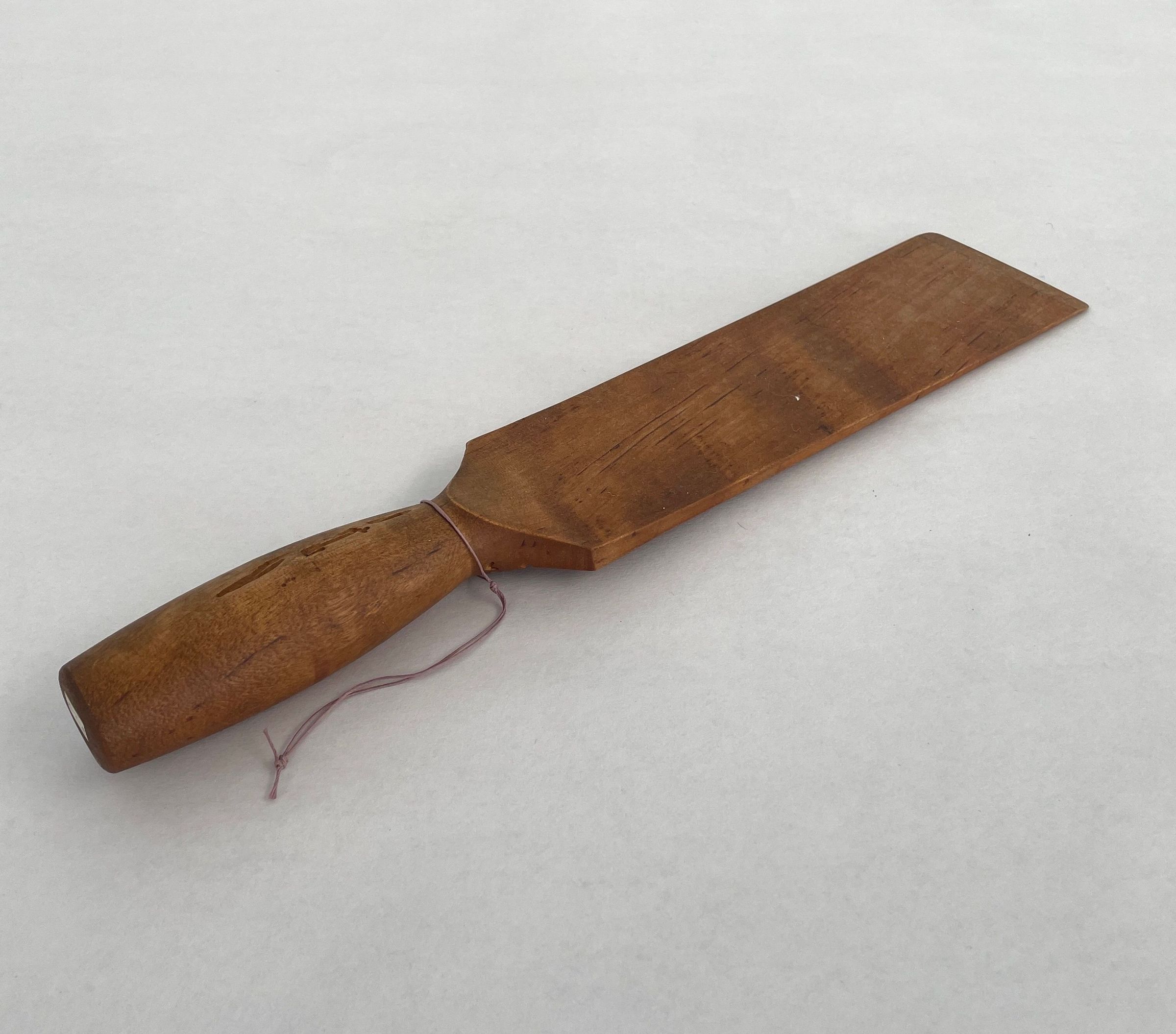 Natural wood flat paddle with a cylindrical handle.Collection