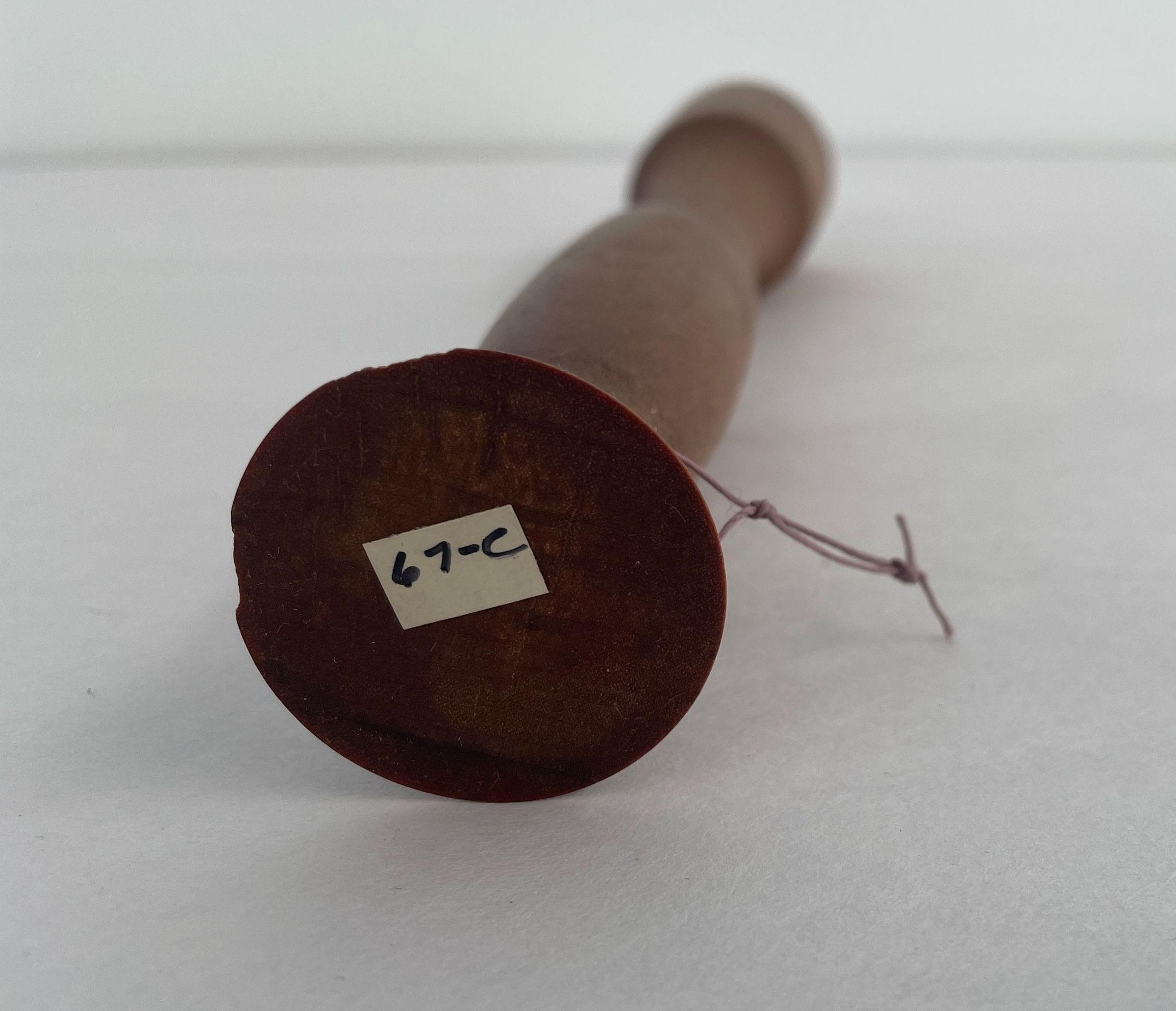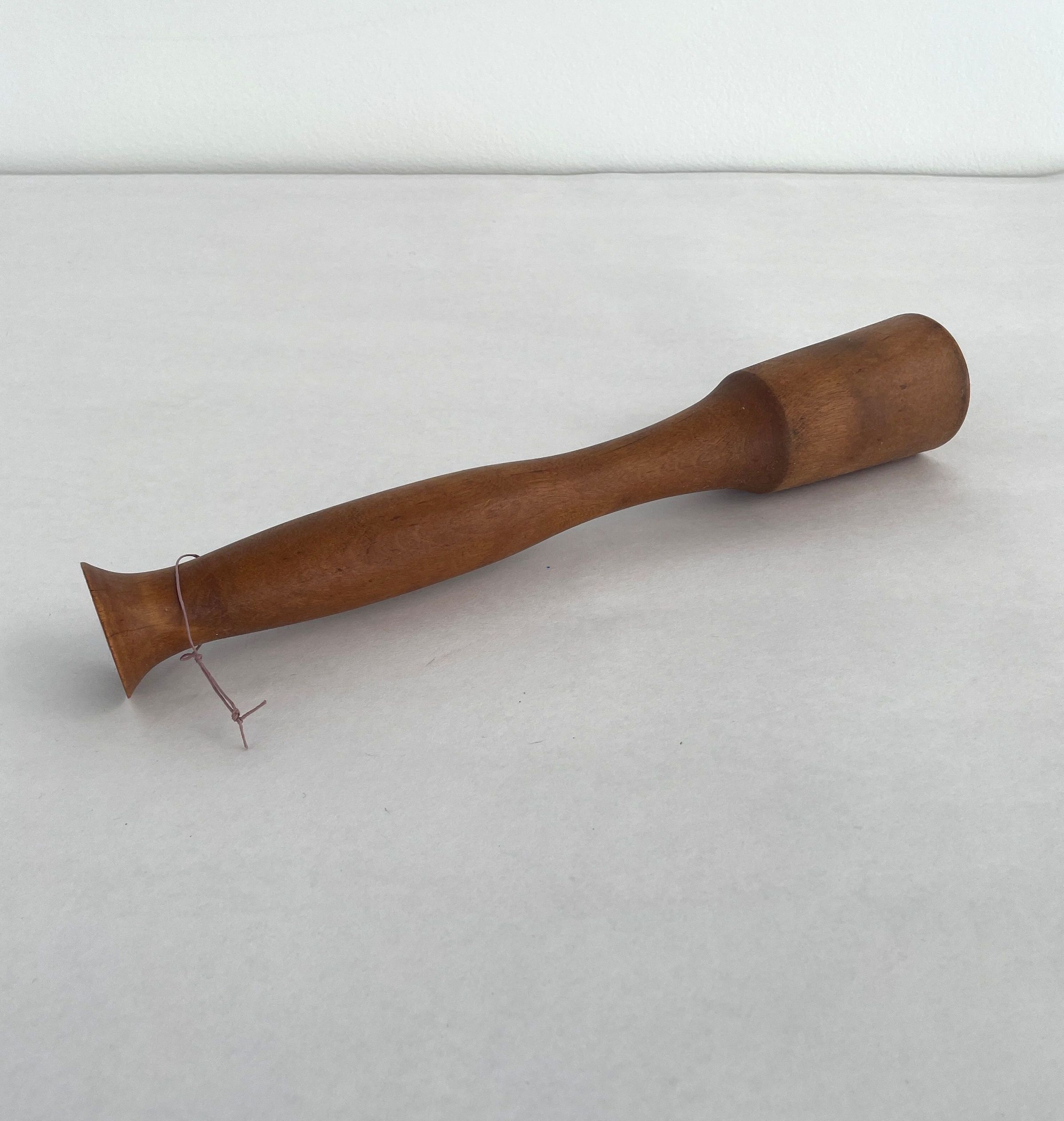 Natural wood utensil has a long cylindrical handle/shaft that widens slightly to create a sturdy mashing surface with a flat bottom.Collection