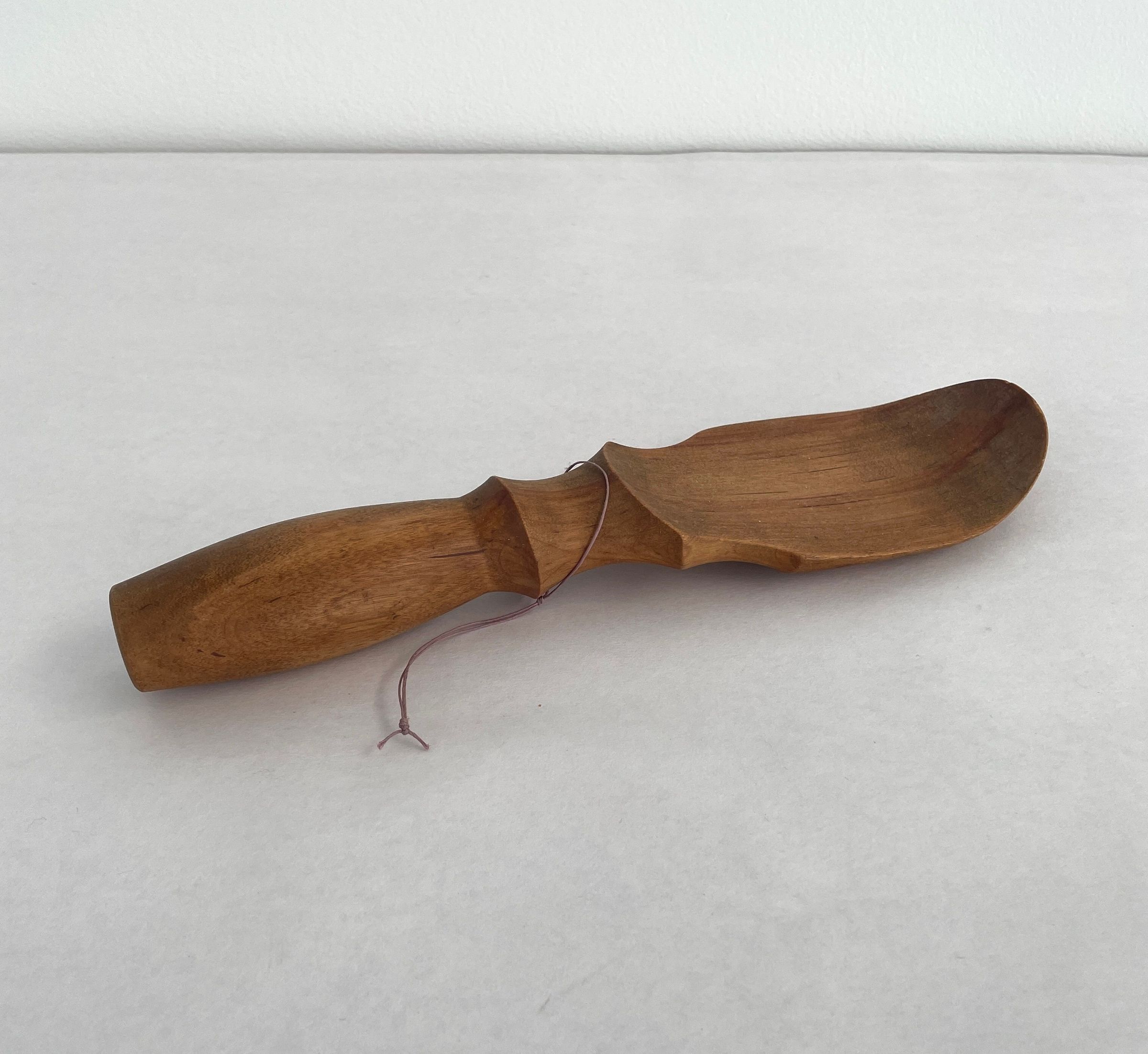 Natural wood turner resembles a spatula but has a turned up surface at the tip of its flat flipping surface.Collection