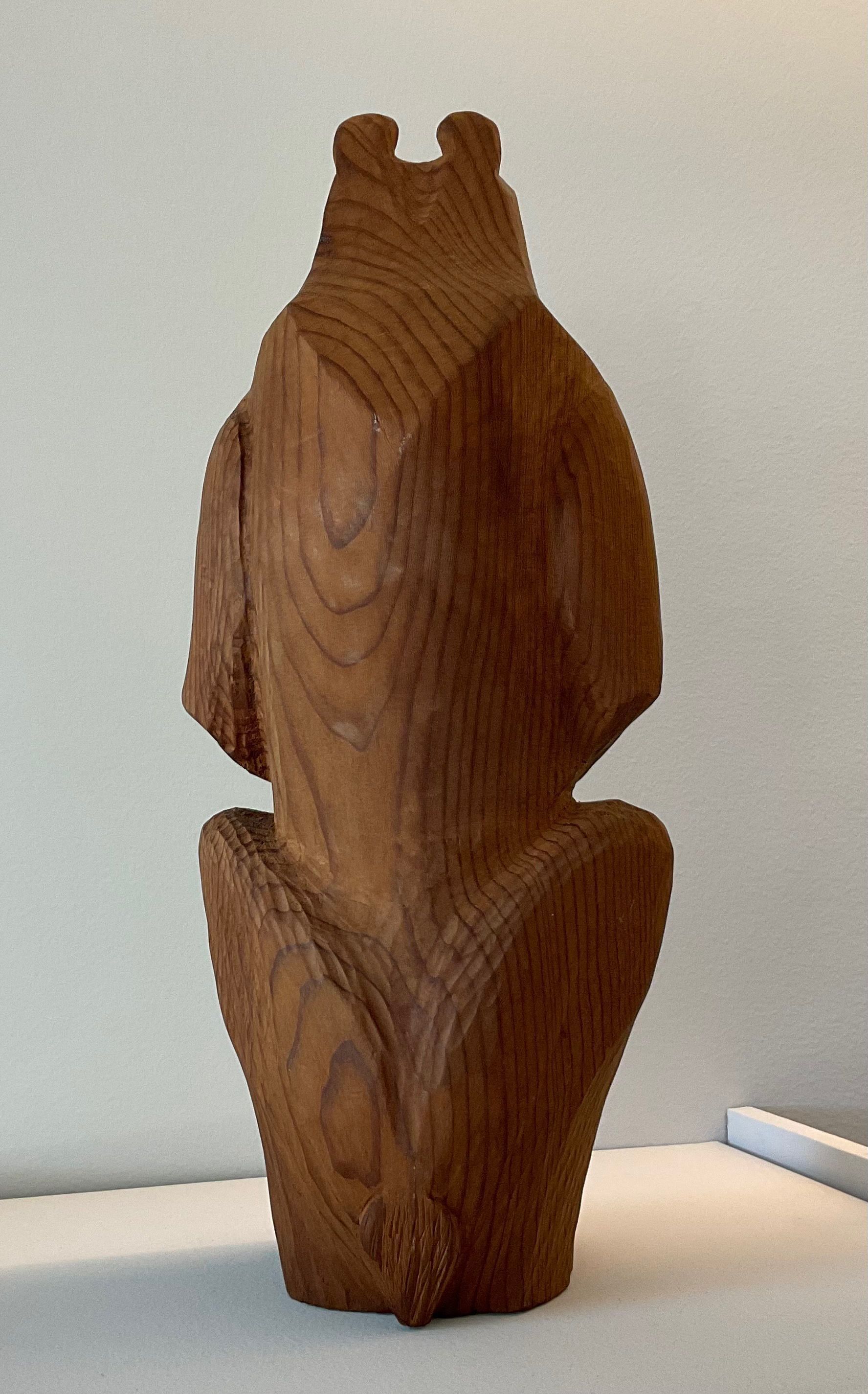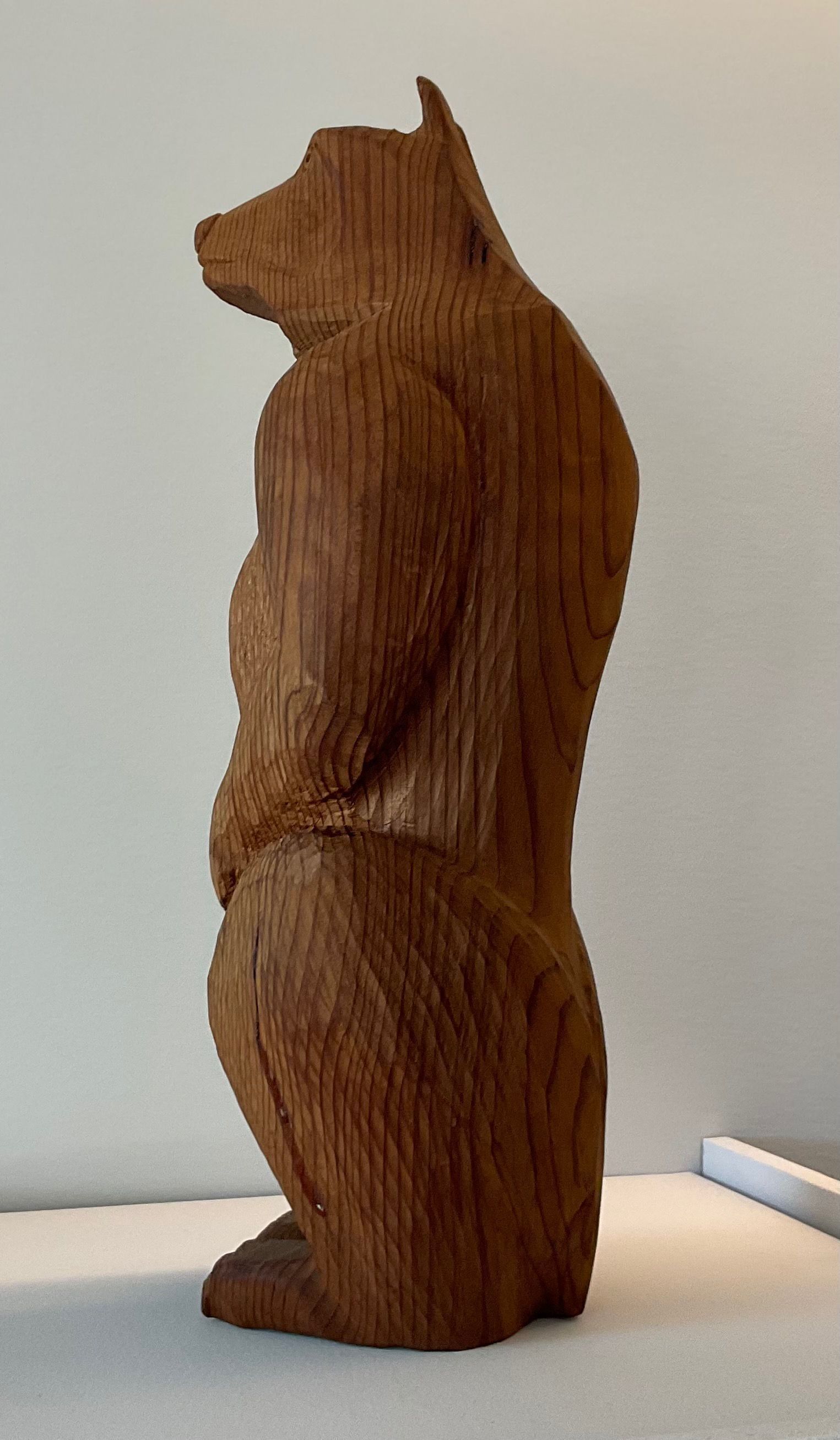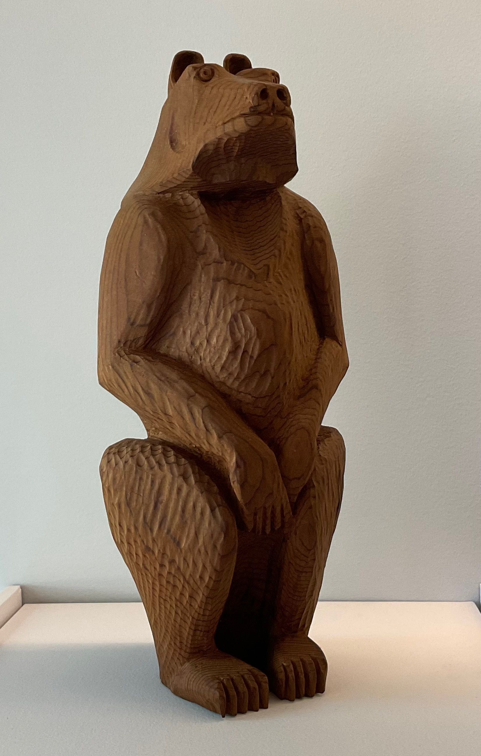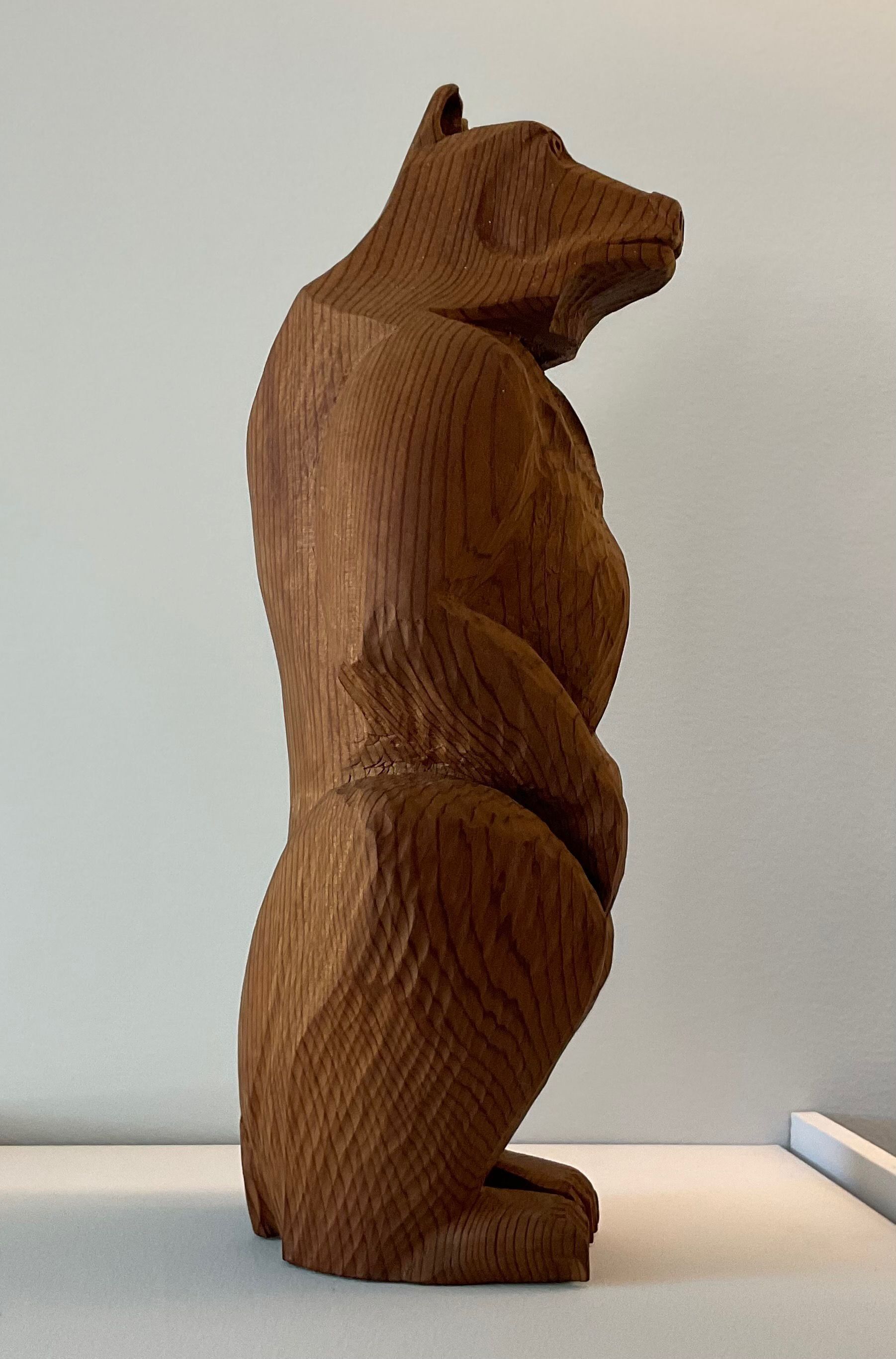Carved redwood resembling a bear. Angular in form, bear is in a standing position ears stick up and back of large protruding head carvings made to resemble hair.Collection