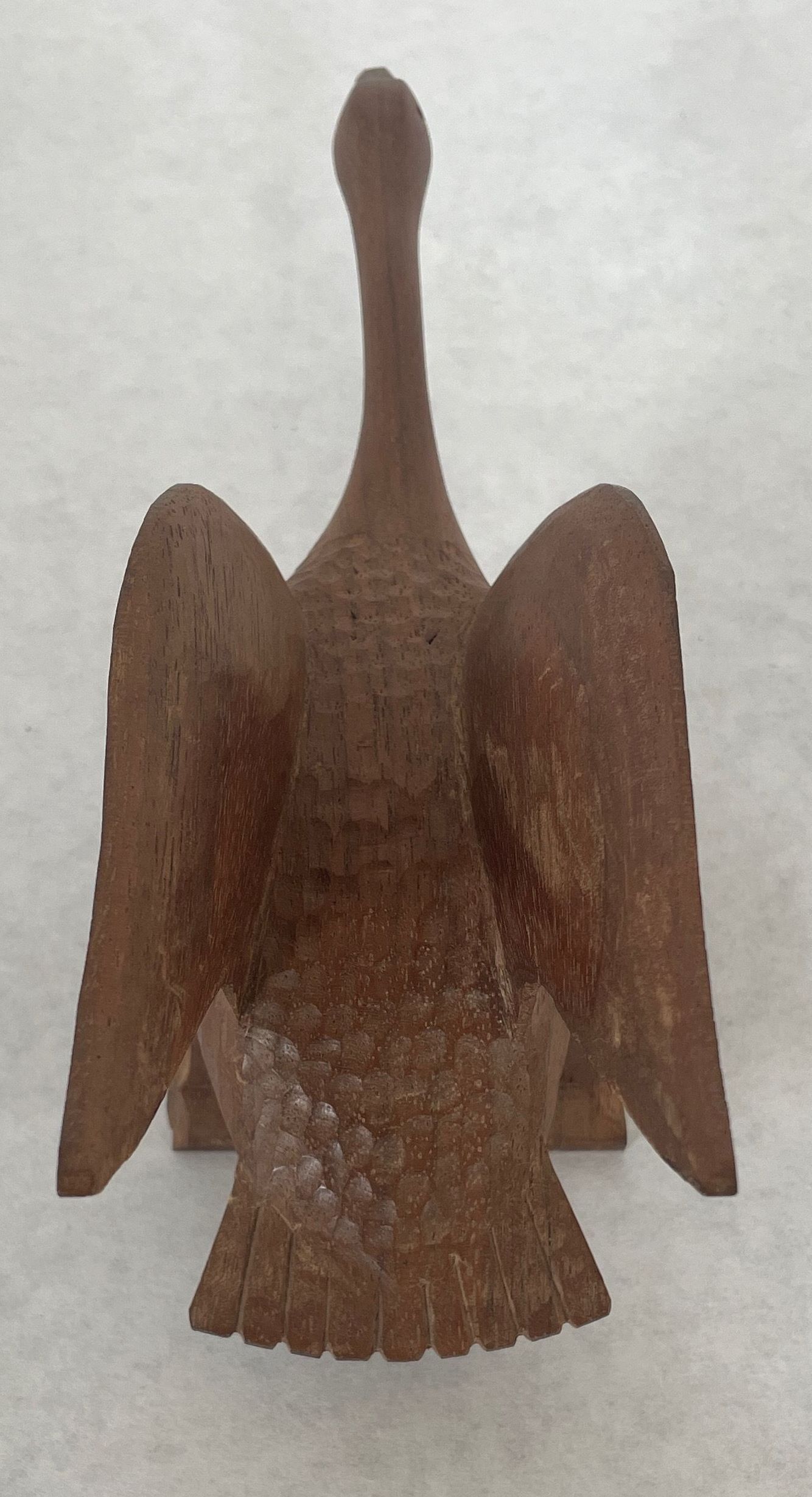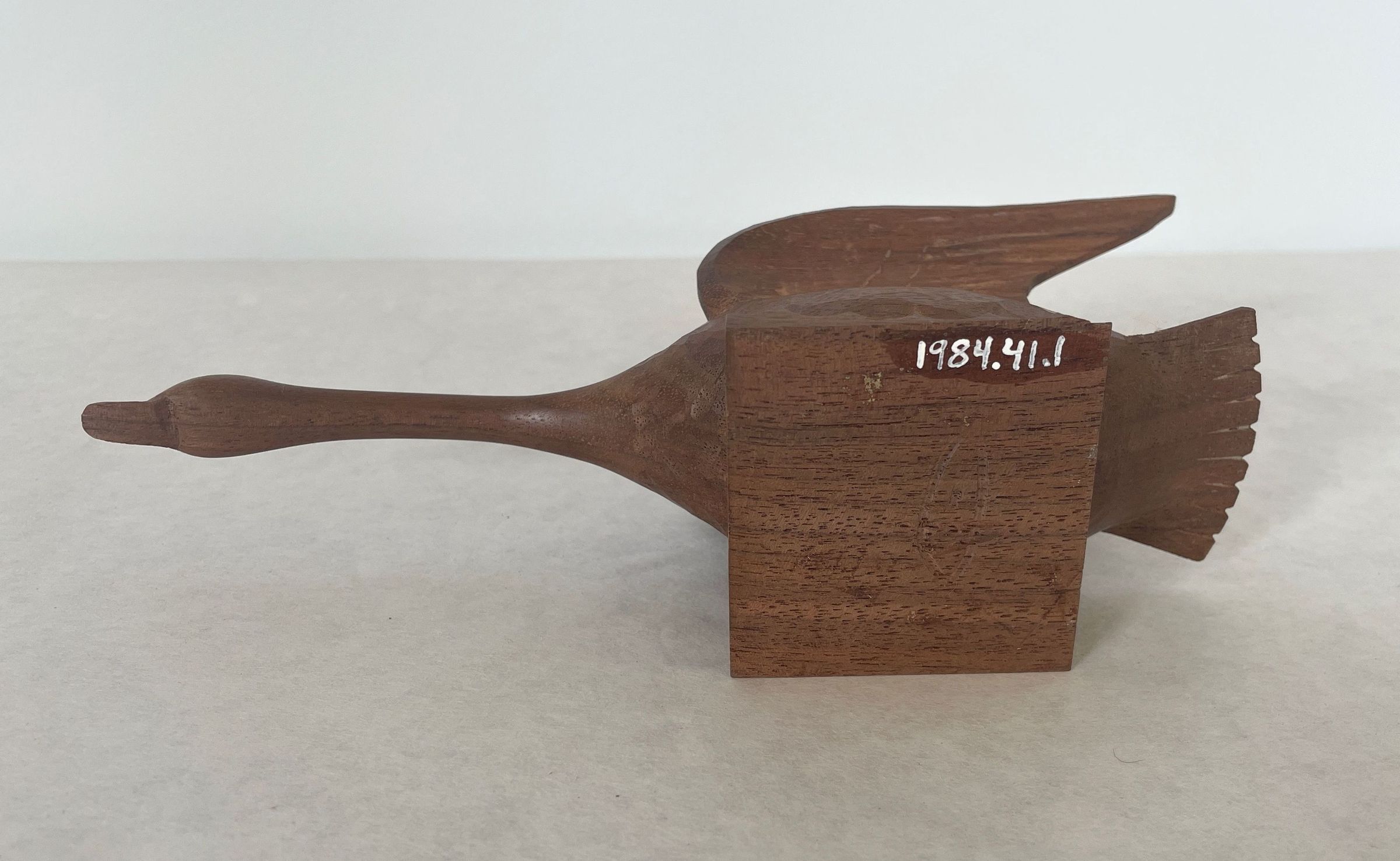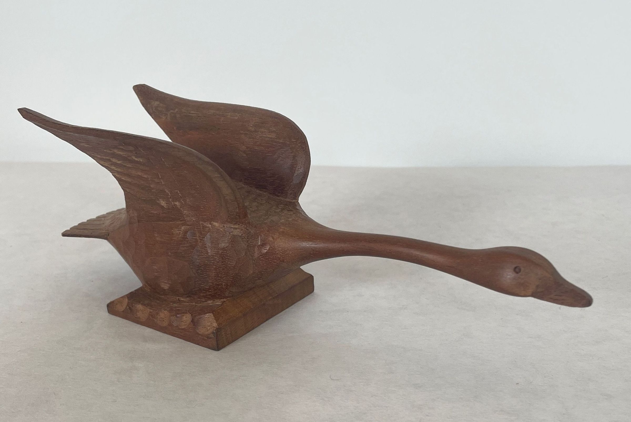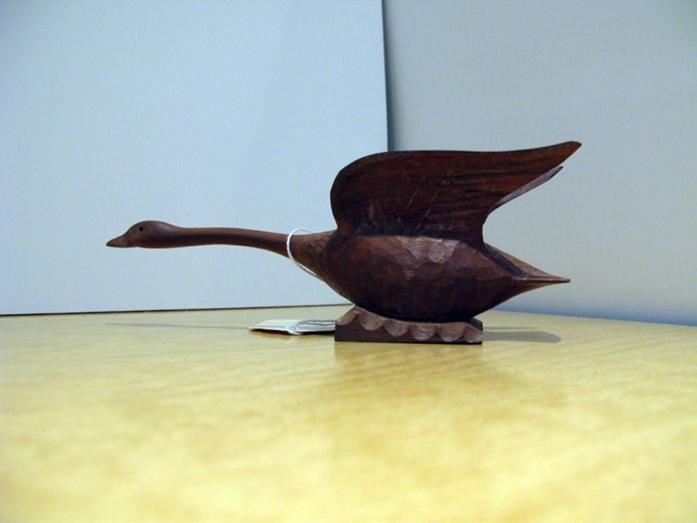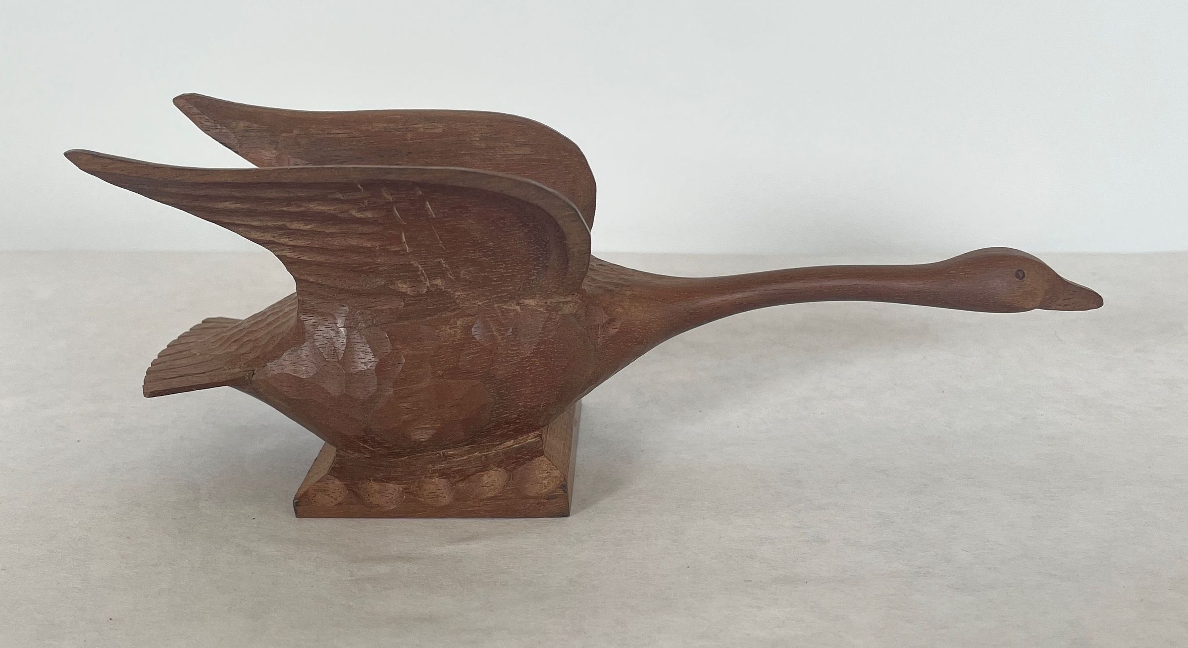 Goose looks as if in flight-wings pulled back and neck and head plunged forward. Set upon wooden base.Collection