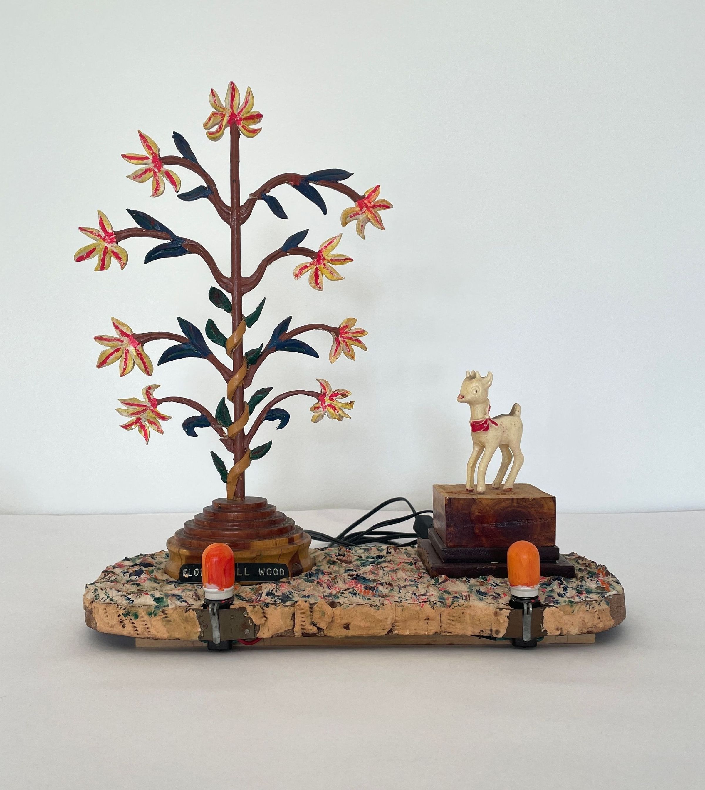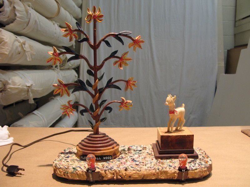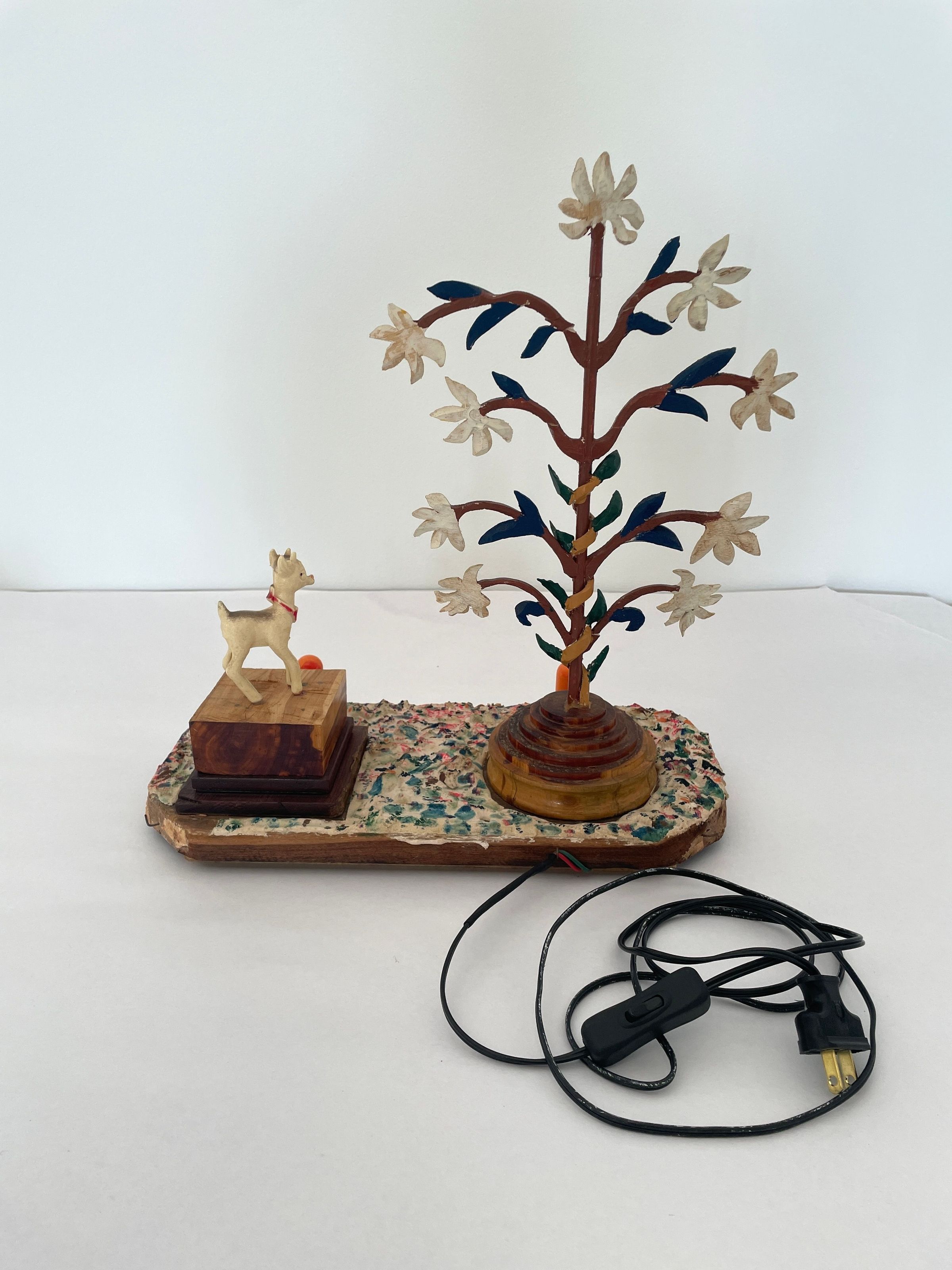 Ceramic covered base top is rough textured spotted with bright colors. 2 bulbs in front, electrical cord supports a tree of flowers, painted, on tiered wooden base, at right reindeer on wooden block.Artwork Details