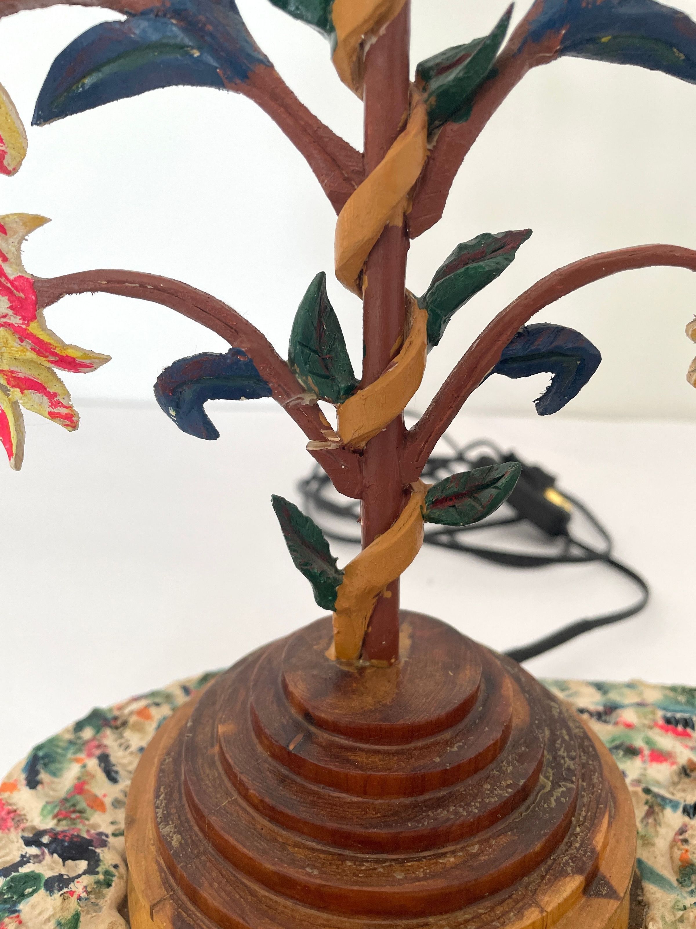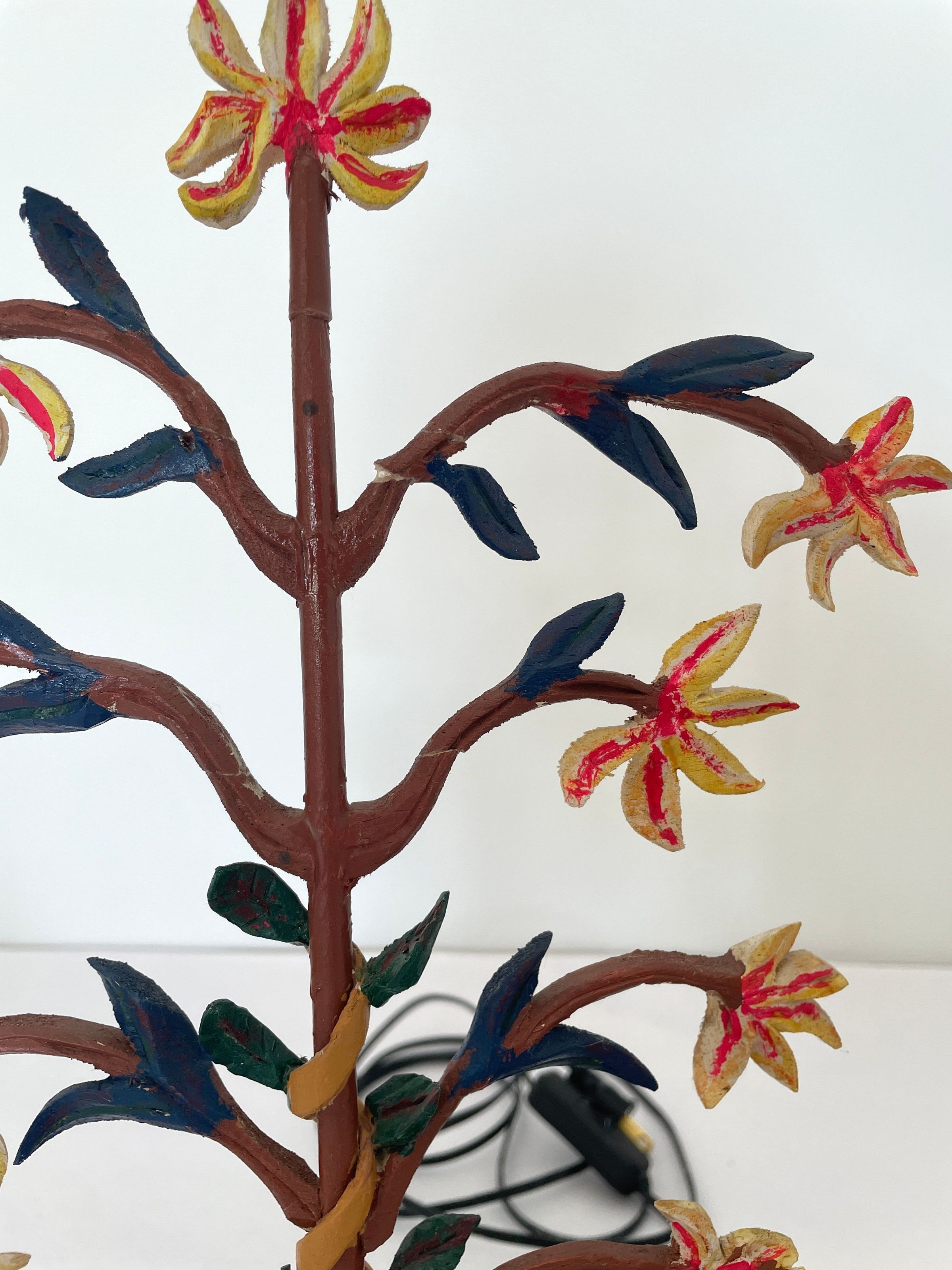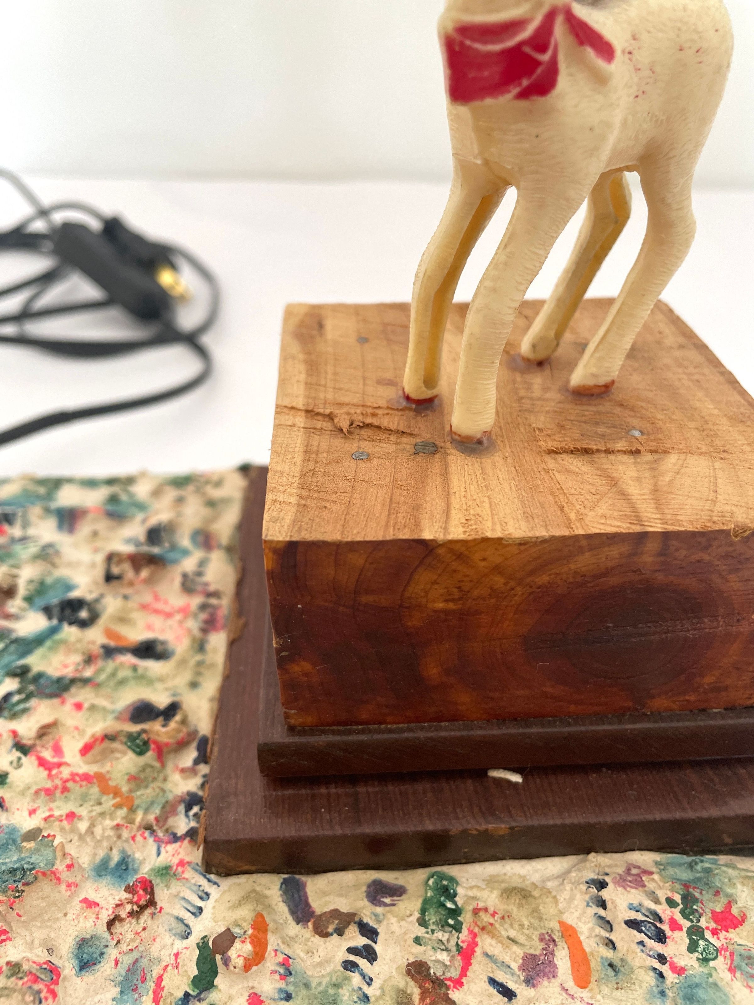 Ceramic covered base top is rough textured spotted with bright colors. 2 bulbs in front, electrical cord supports a tree of flowers, painted, on tiered wooden base, at right reindeer on wooden block.Artwork Details