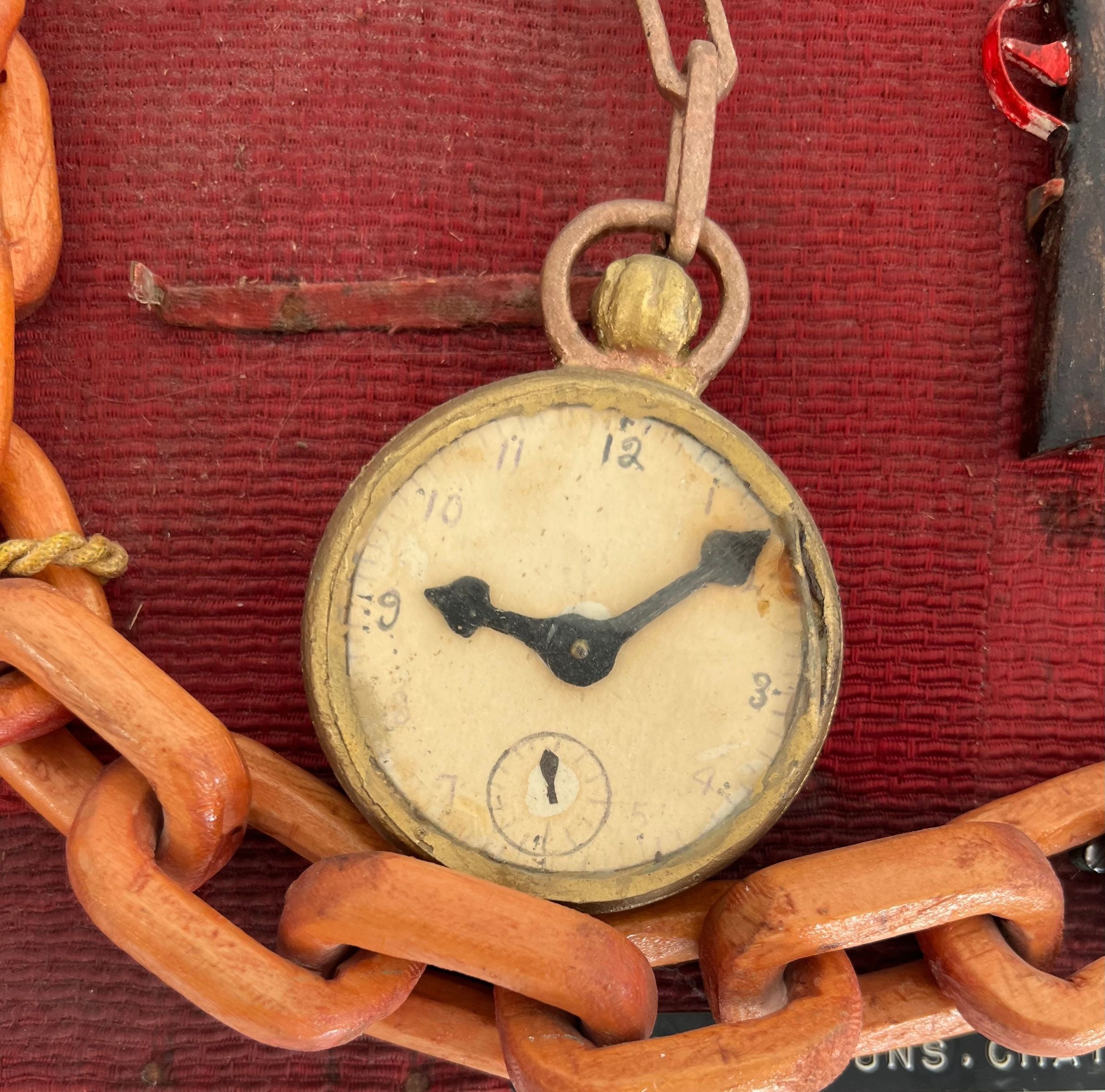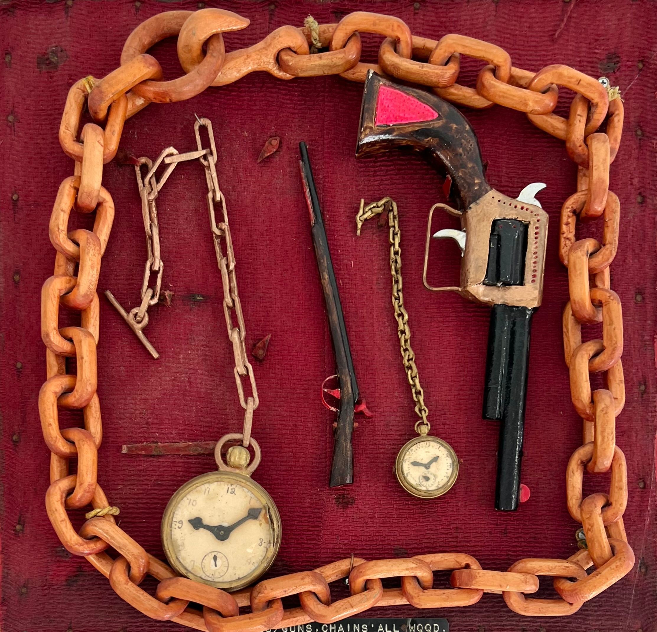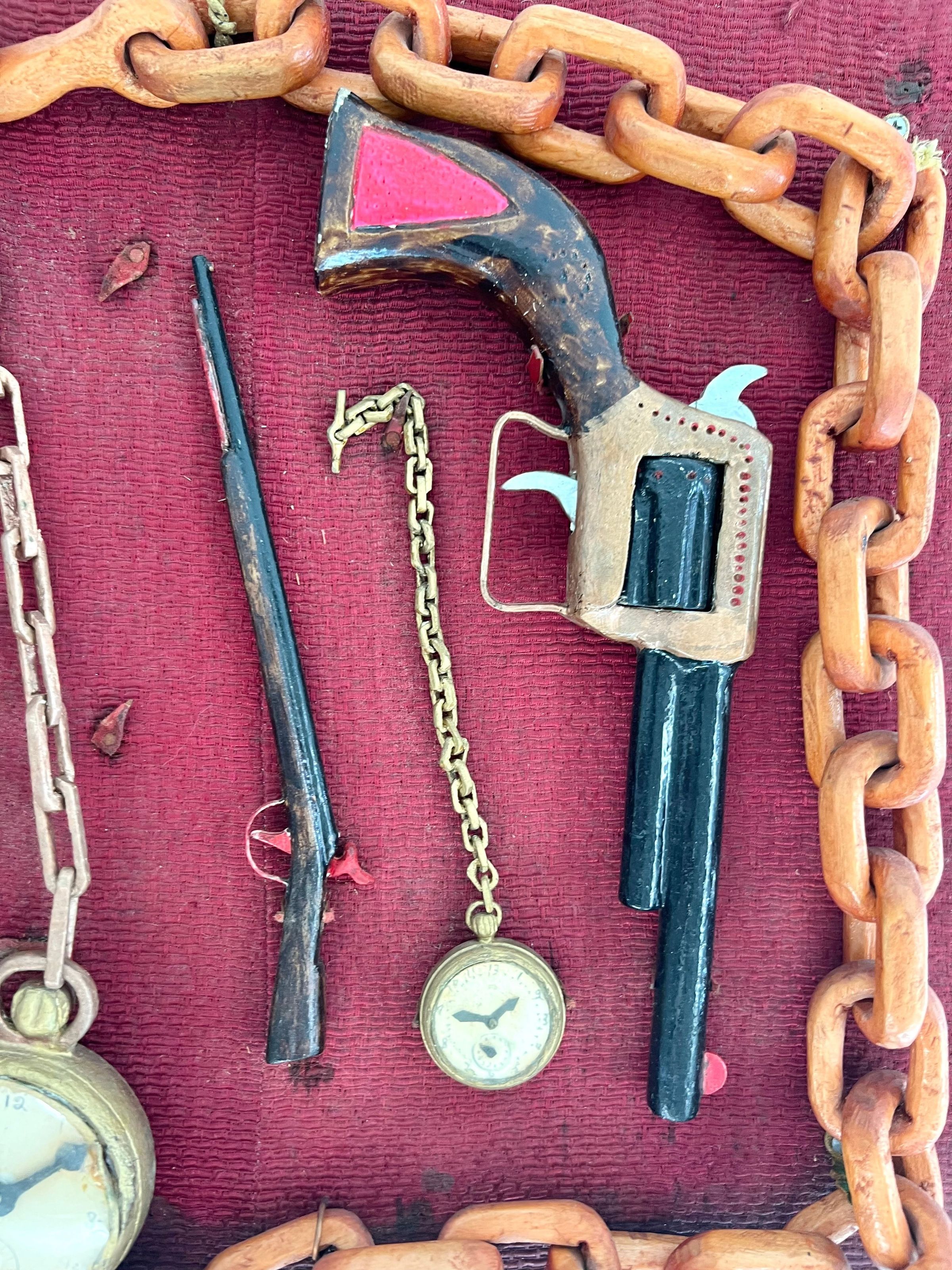Carved wood, painted in tempra. Displayed on 1 1/4" plywood board and covered with reddish textured material. Thick linked chain, hand gun, a large & a small watch, very small long barrel rifle.Collection
