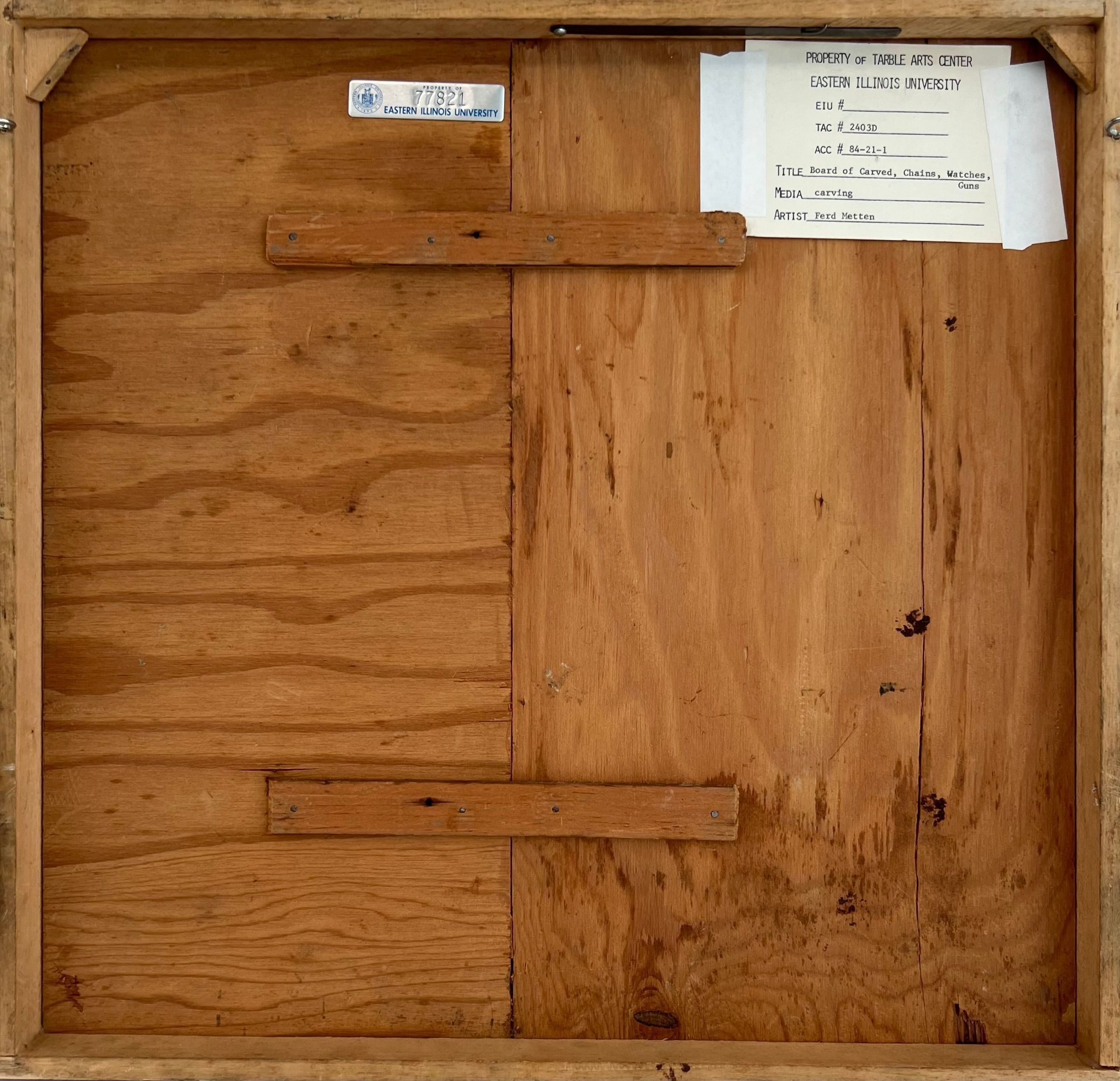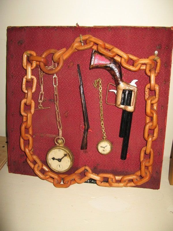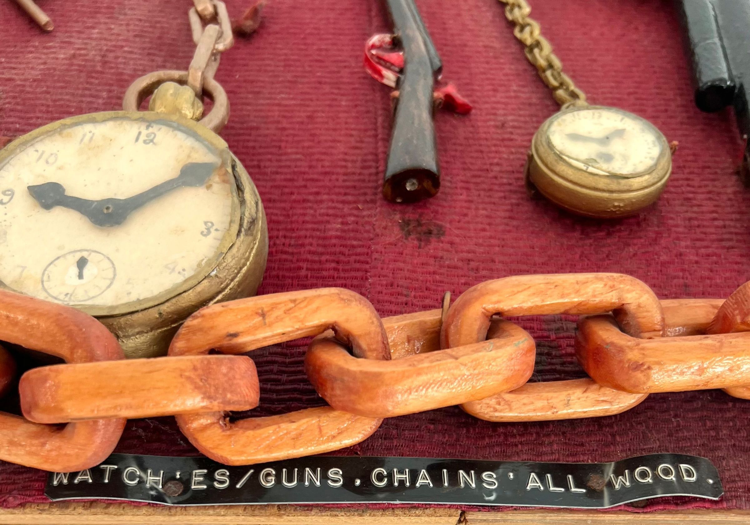 Carved wood, painted in tempra. Displayed on 1 1/4" plywood board and covered with reddish textured material. Thick linked chain, hand gun, a large & a small watch, very small long barrel rifle.Collection