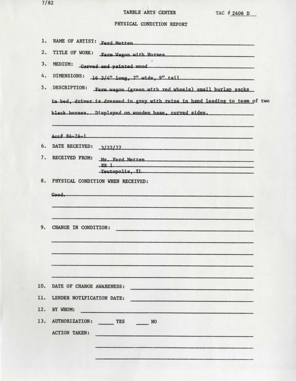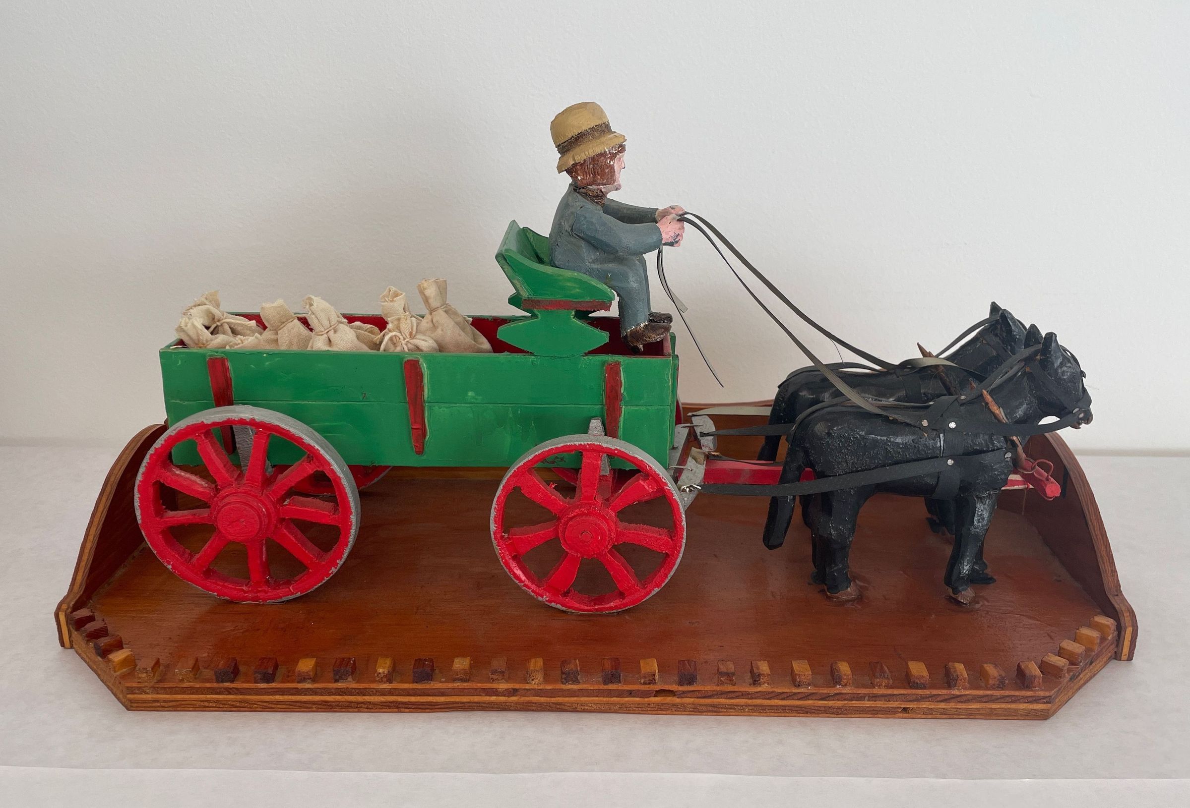 Farm Wagon (green with red wheels) small burlap sacks in bed, driver dressed in grew with reins in hand leading to team of 2 black horses. Displayed on wooden base curved sides.Artwork Details