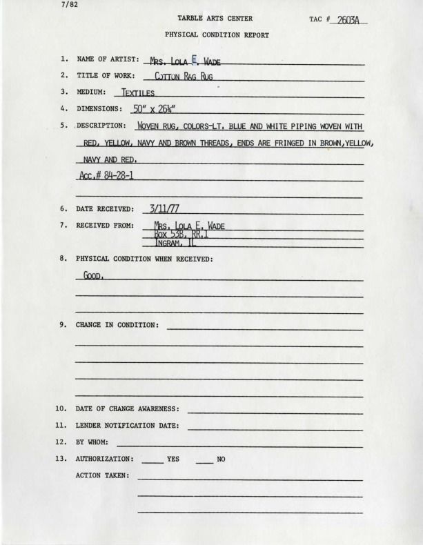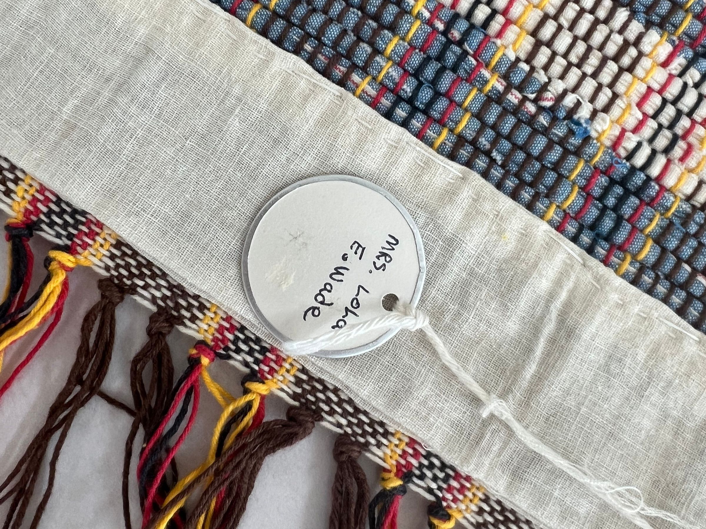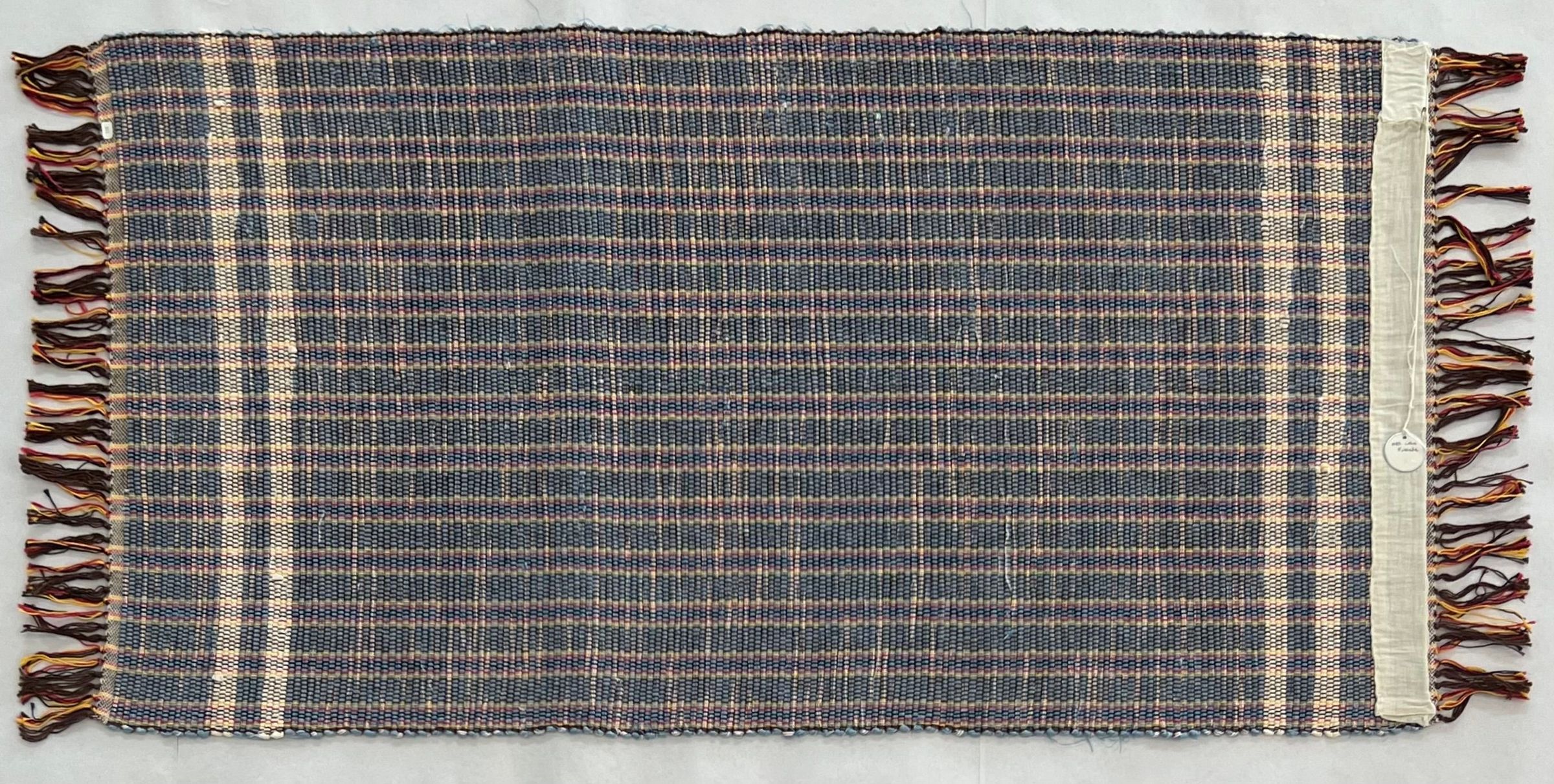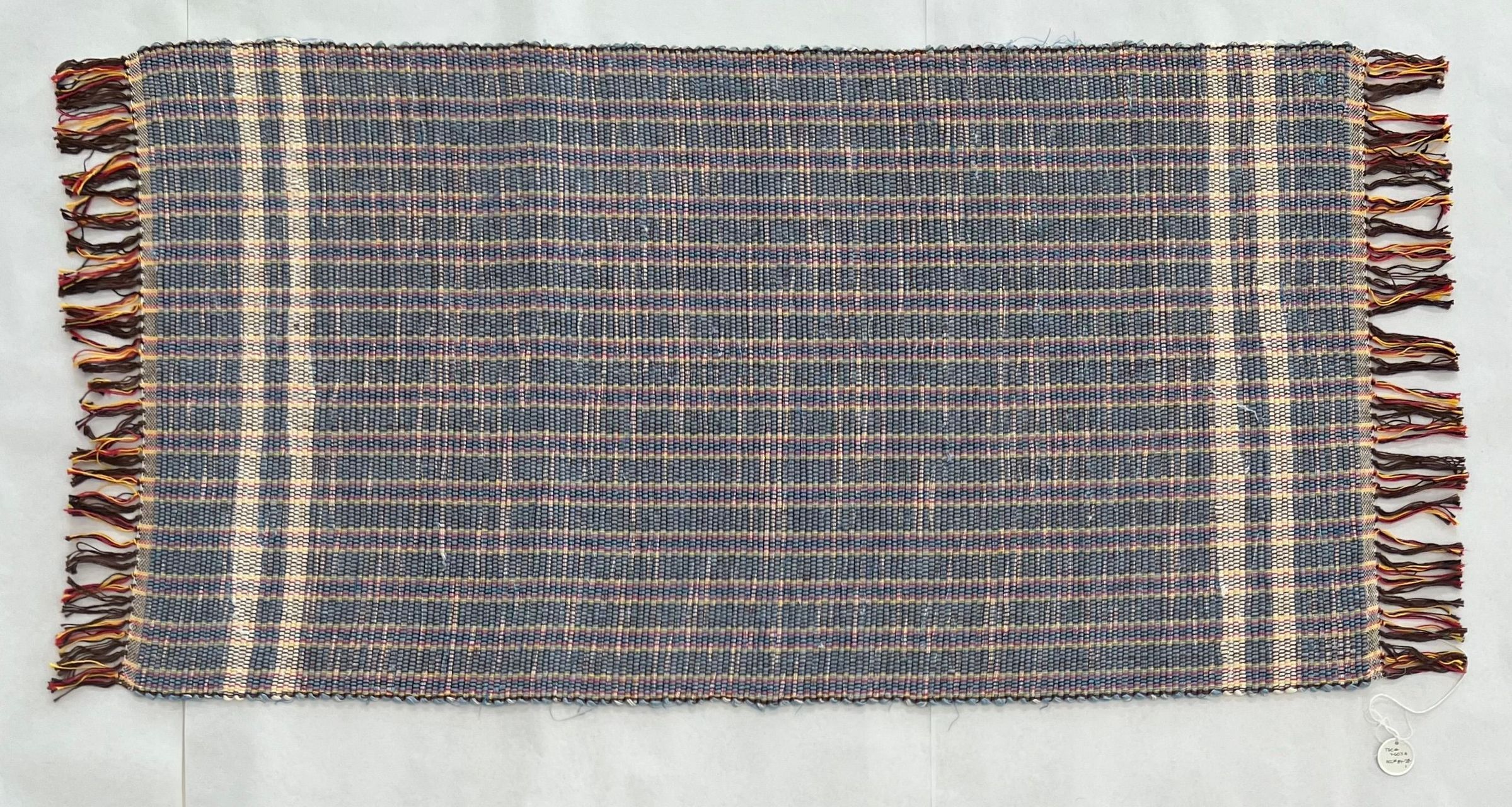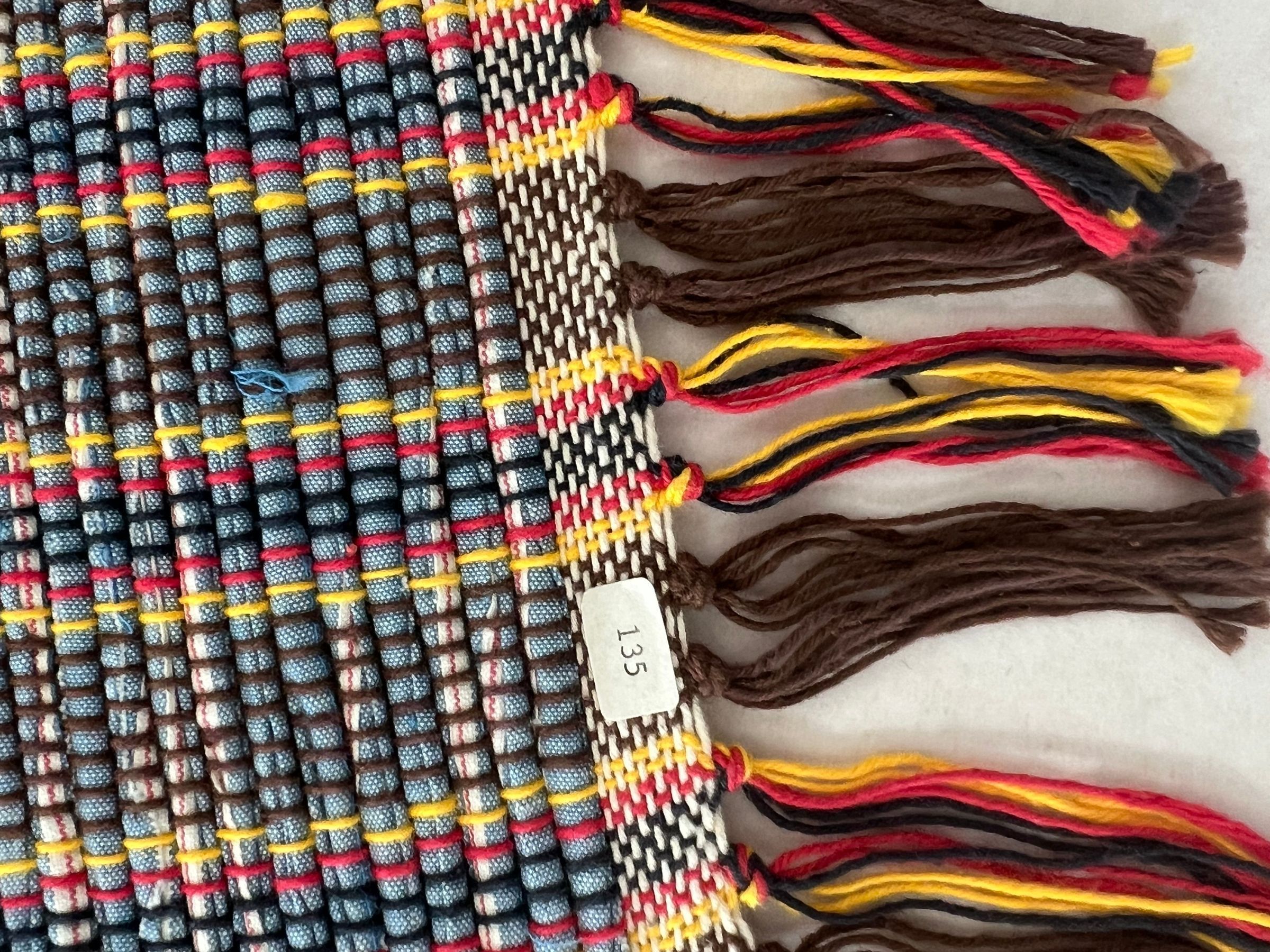 Woven rug colored lt. blue and white piping woven with red, yellow, navy and brown threads ends are fringed in brown, yellow navy and red. Length ends: 3.5" tassels.Collection