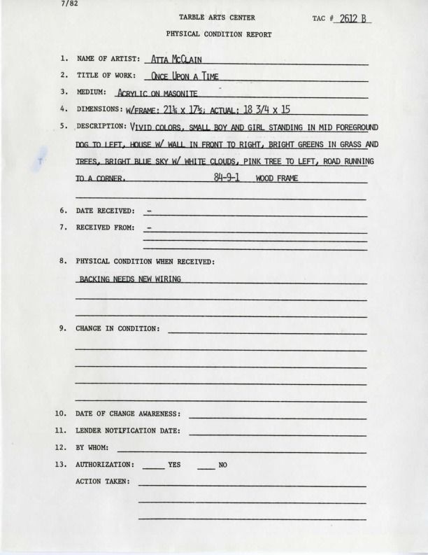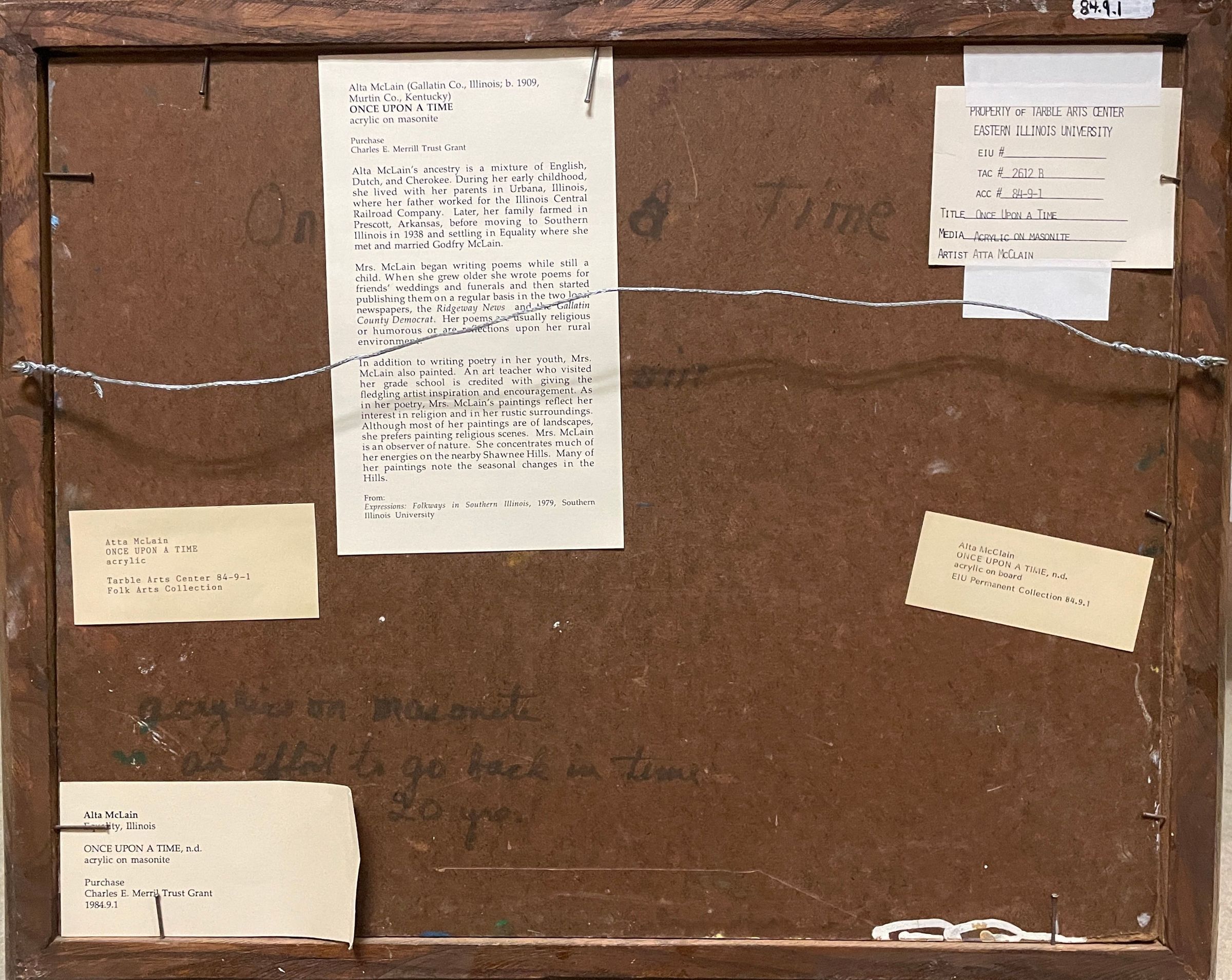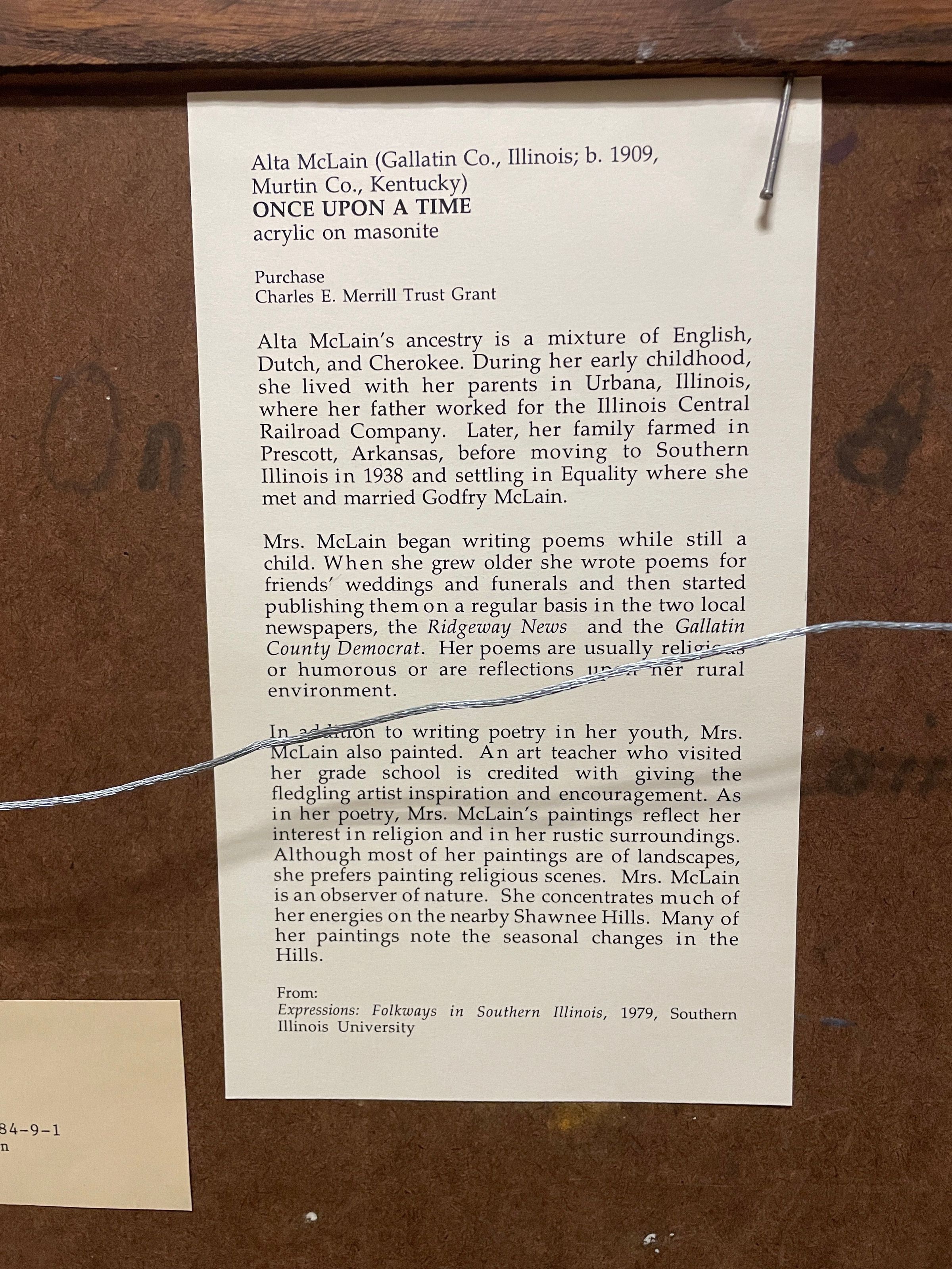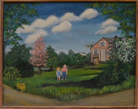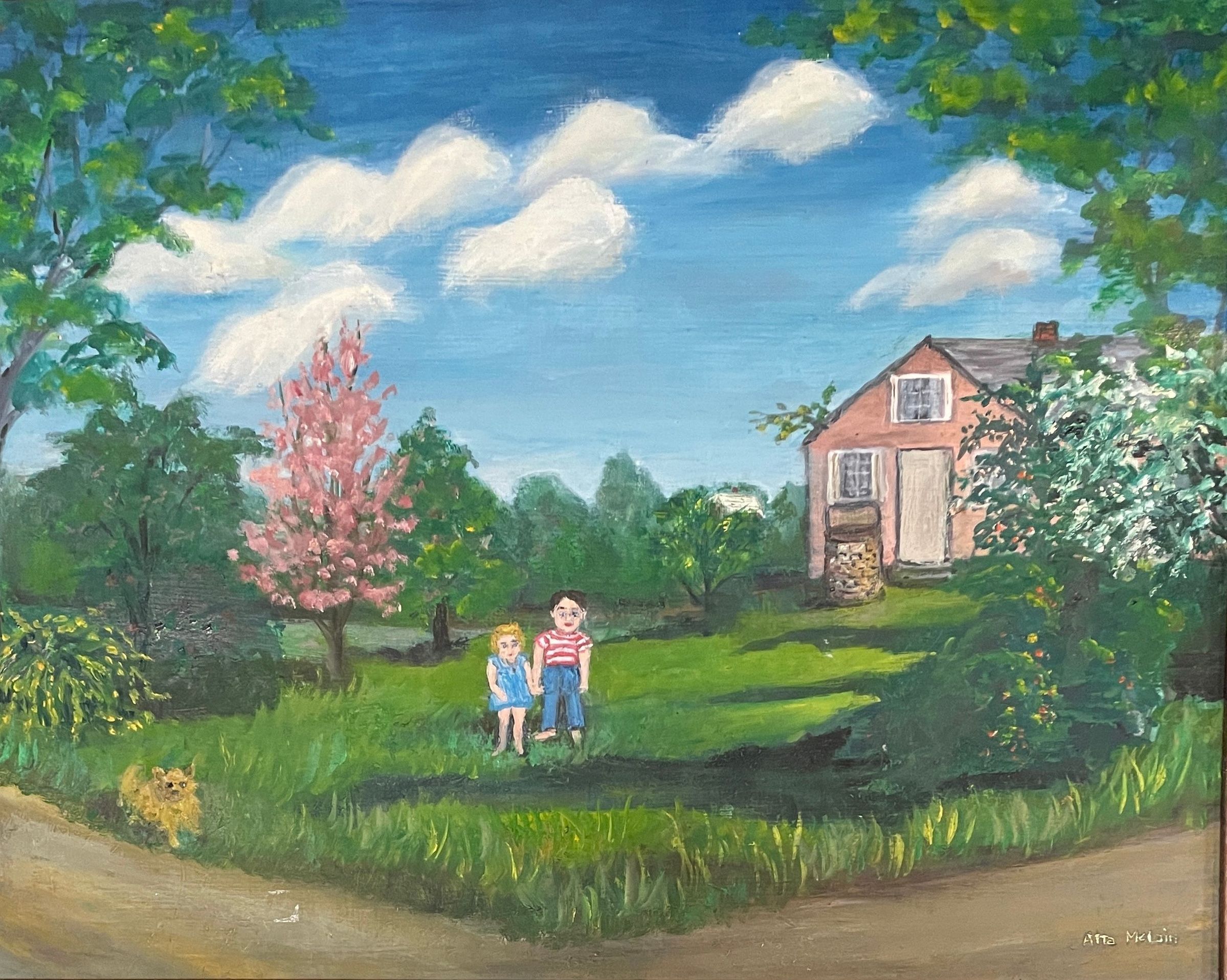 Vivid colors, small boy and girl standing in mid foreground. Dog to left, house w/ wall in front to right. Bright greens in grass and trees bright blue sky w/ white clouds pink tree to left, road running to a corner. Wood frame.Artwork Details
