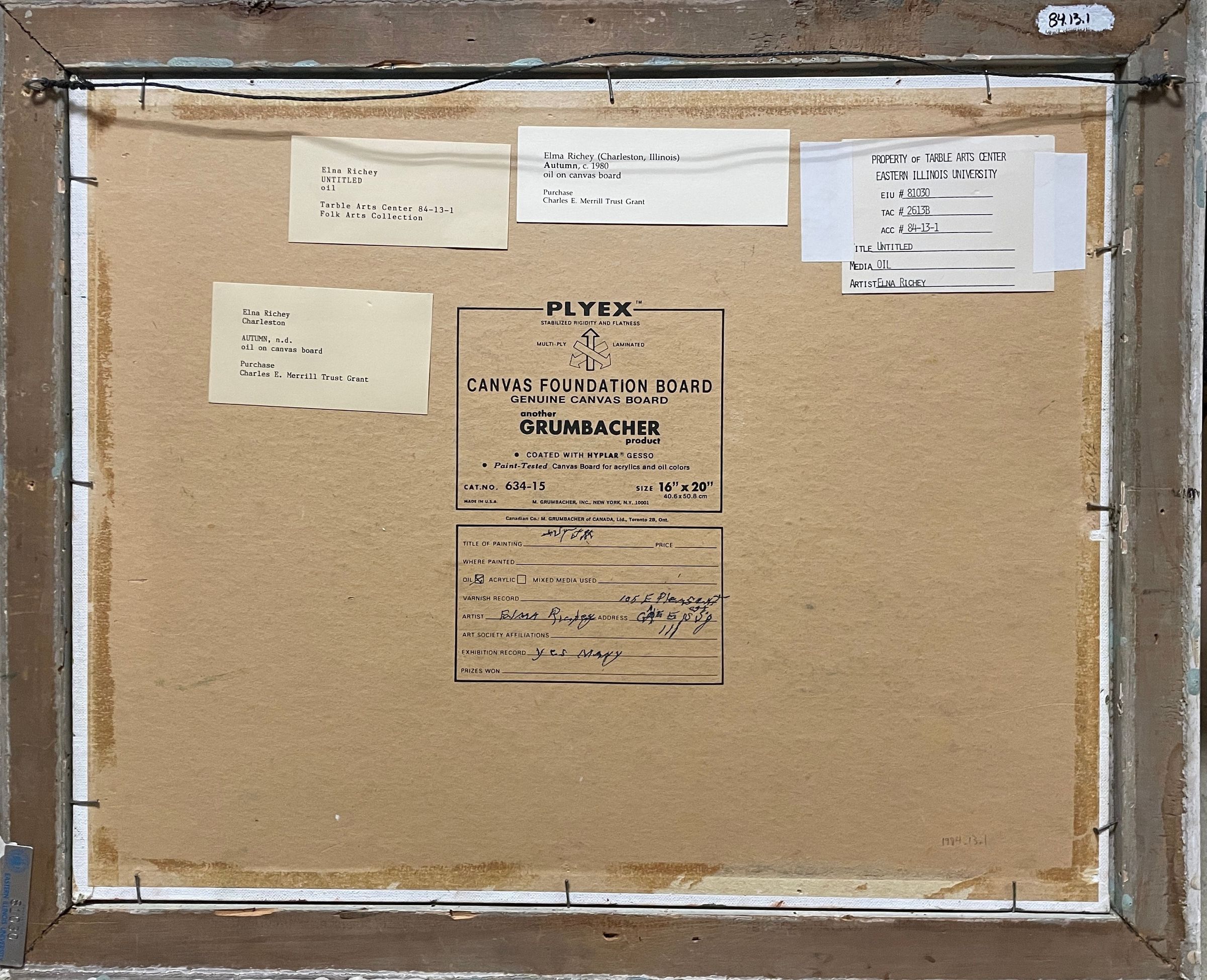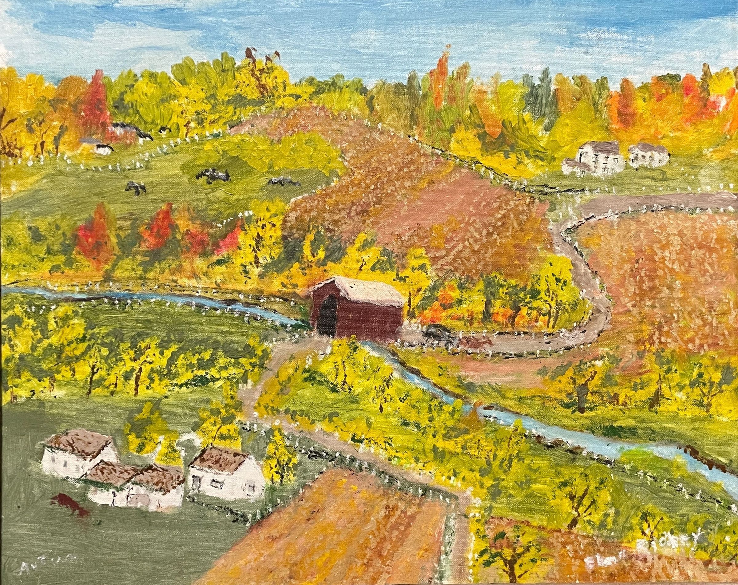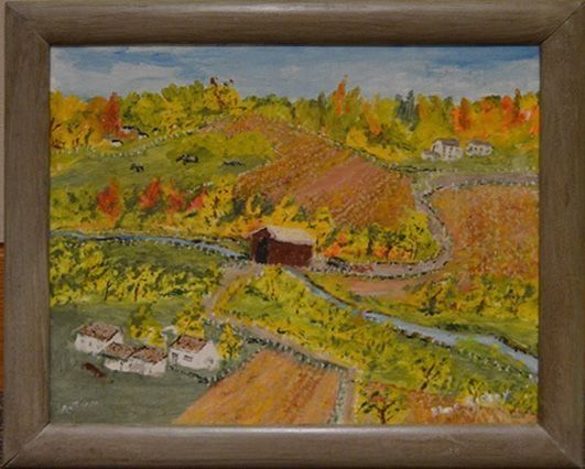 Country scene in bright colors, several winding roads running all over picture plane, covered bridge in center of work, scattered houses many trees.Artwork Details