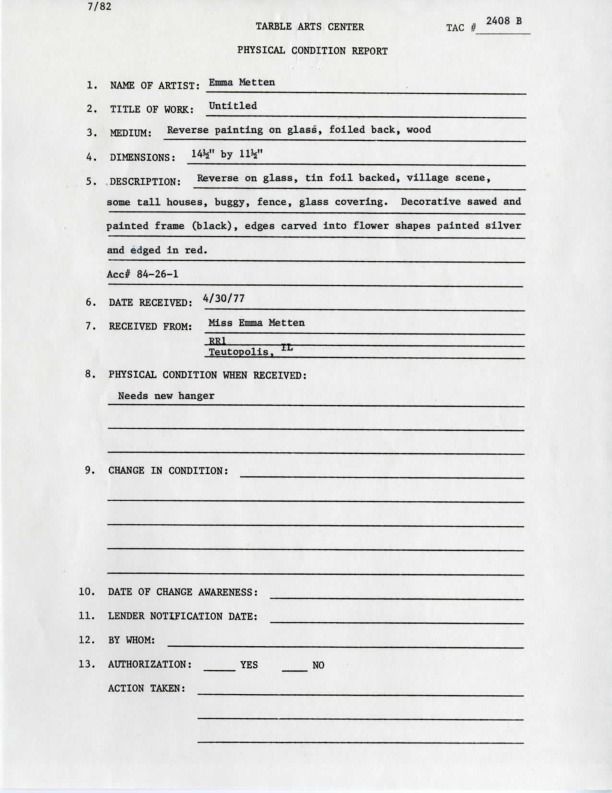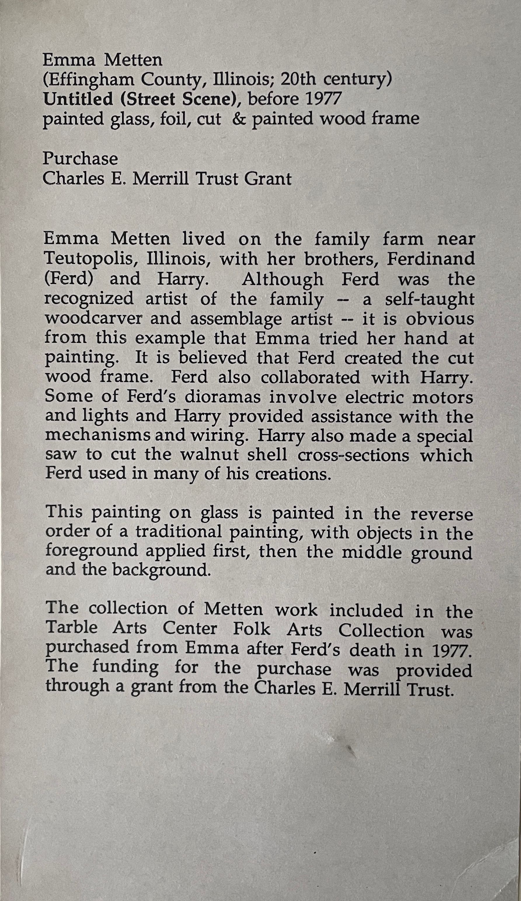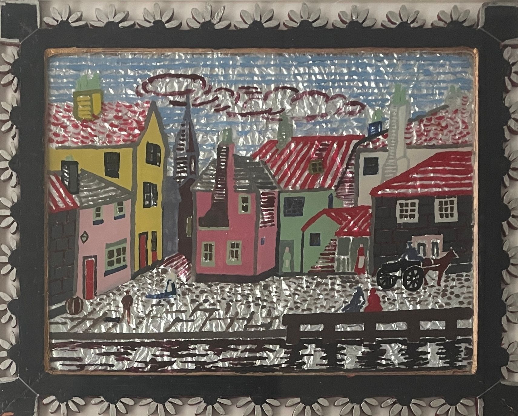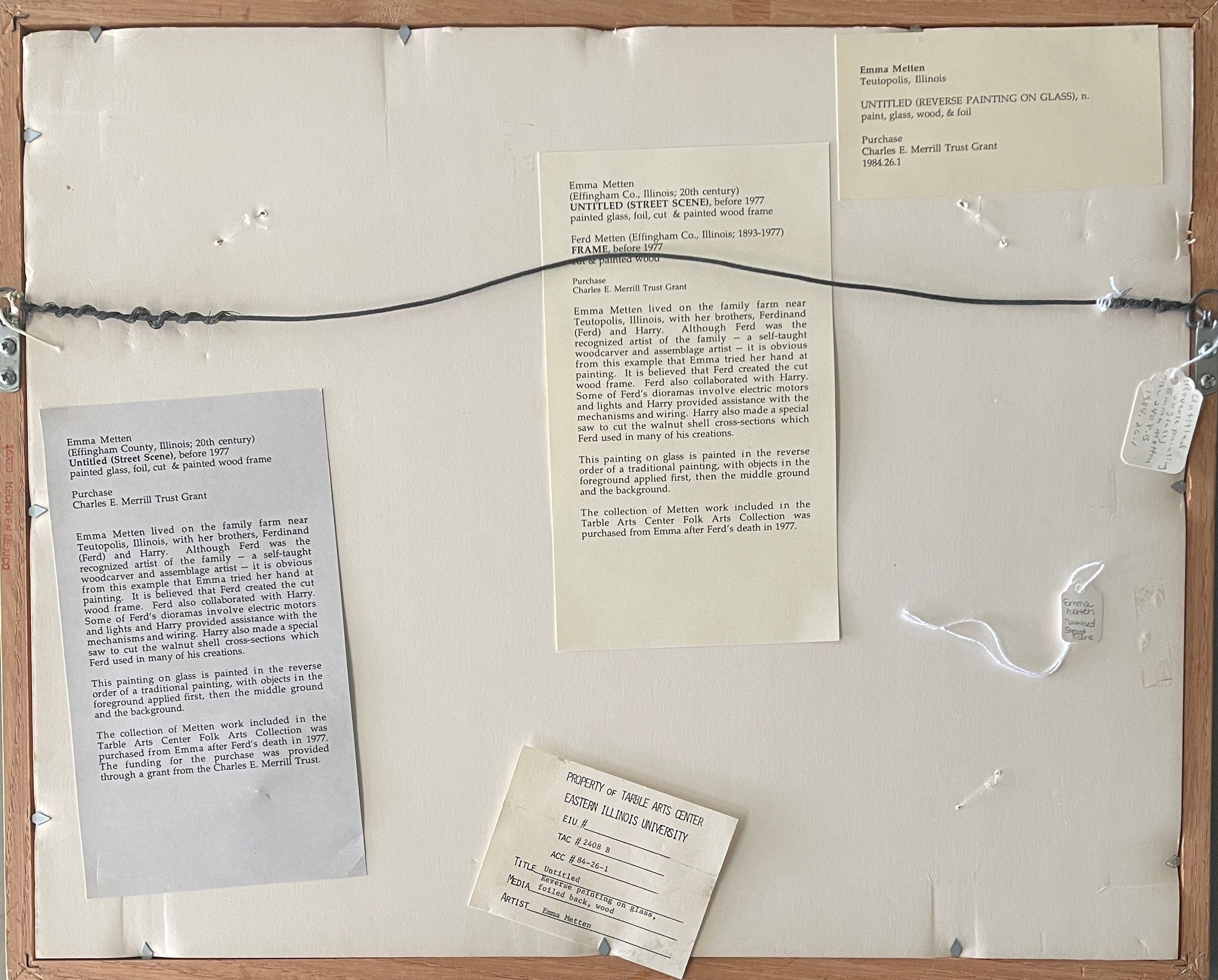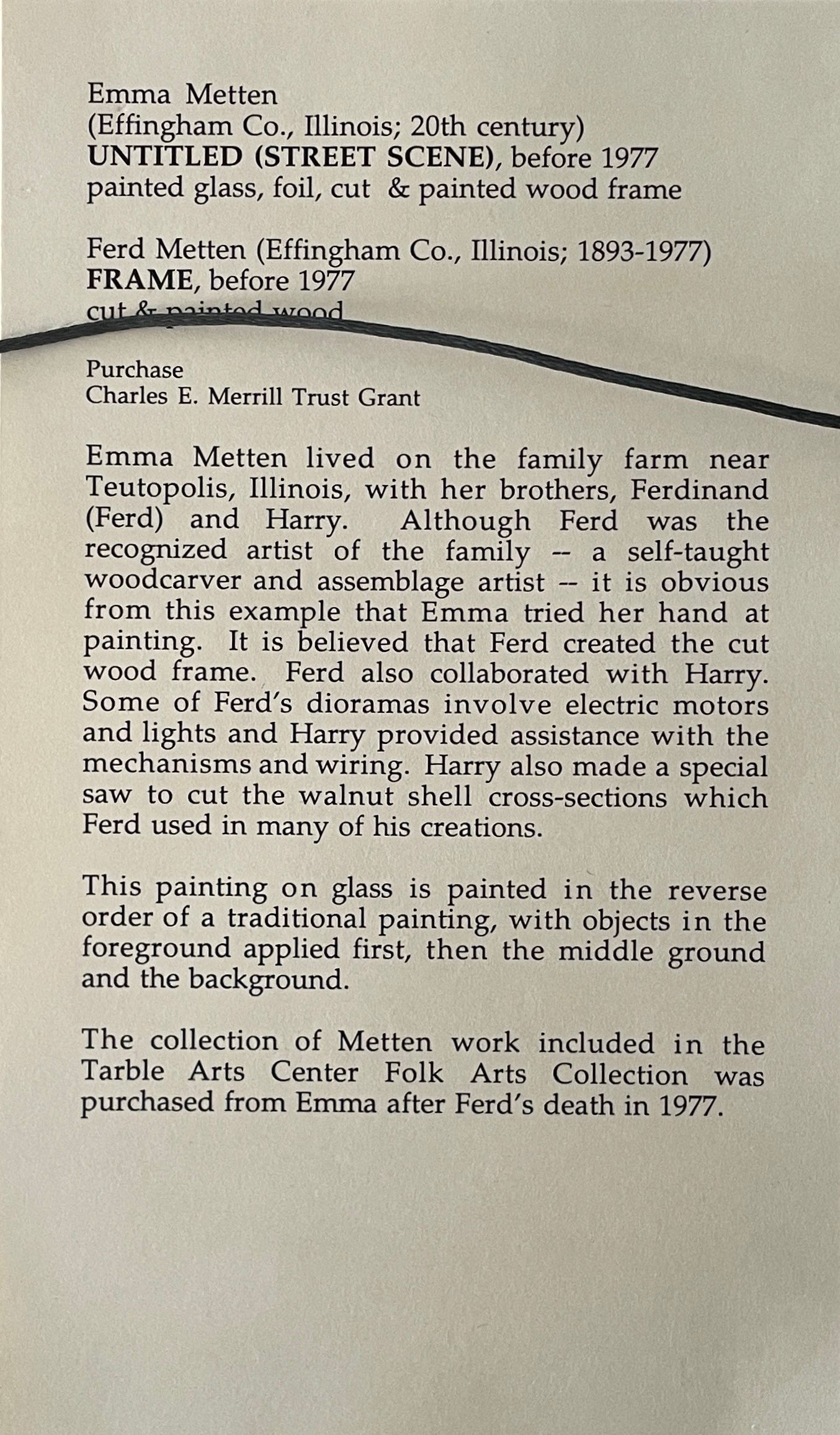 Reverse on glass, tin foil backed, glass covering. Village scene with some tall houses, buggy, fence, glass covering. Decorative sawed and painted frame (black) silver painted flower shapes edged in red are carved onto frame edge. Frame made by brother Ferd Metten?Artwork Details