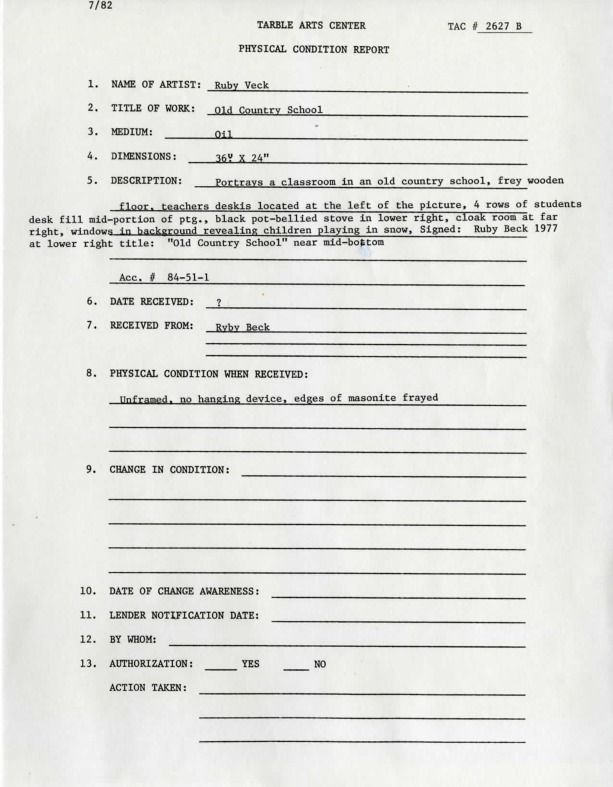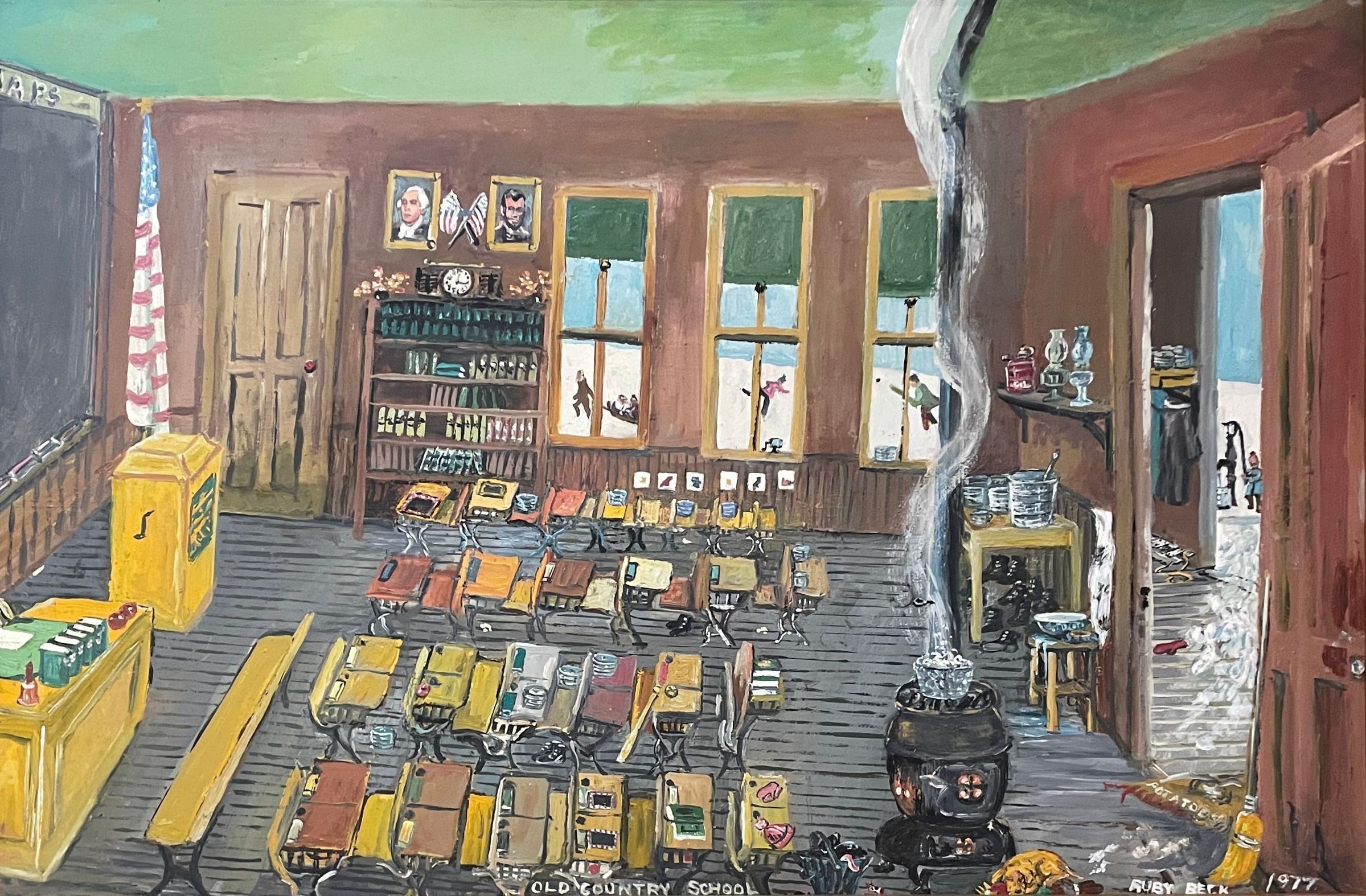 Portrays a classroom in an old country school frey wooden Floor, teacher desk is located at the left of the picture, 4 rows of students desk fill mid-portion of ptg., black pot belly stove in lower right, cloak room at far right windows in background revealing children playing in snow, Signed: Ruby Beck 1977. At lower right title: "Old Country School" near mid-bottom.Collection