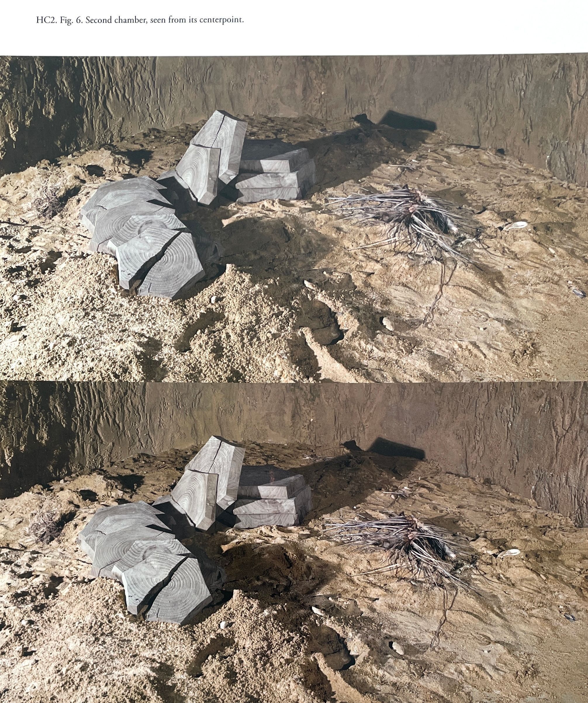 Rounded beige walls with sandy floor. in room are log cross-sections cut into hexagons pile of stick and small fiberous mass. Portfolio of Humaliwo Chambers Vol II 6 of 12 images. two nearly identical images run length wise for stereoscopic viewer.Collection