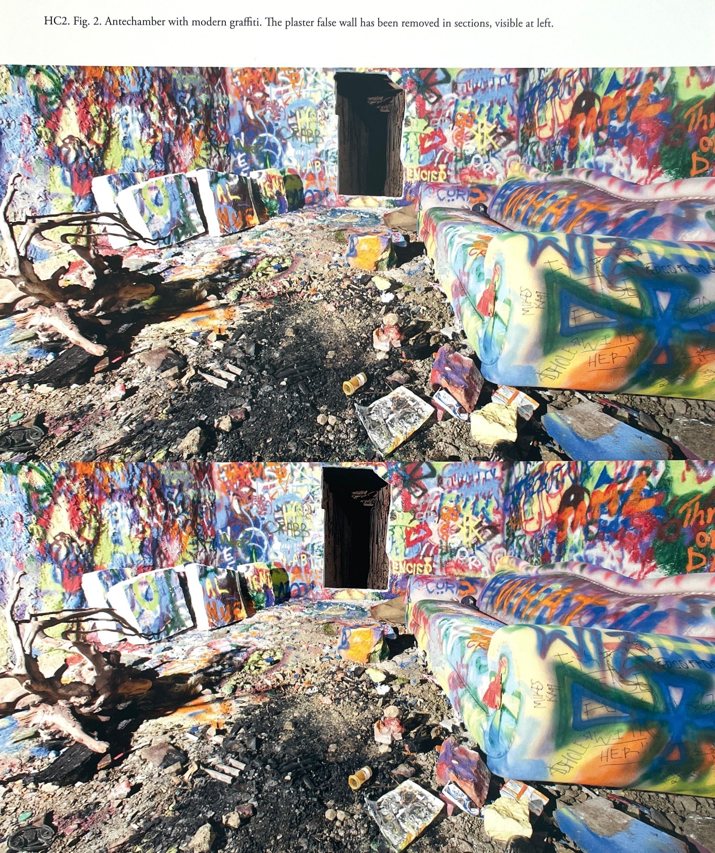 HC2. Fig. 2. Antechamber with modern graffiti. The plaster wall has been removed in sections visible at left.Entry/Object ID