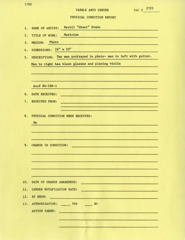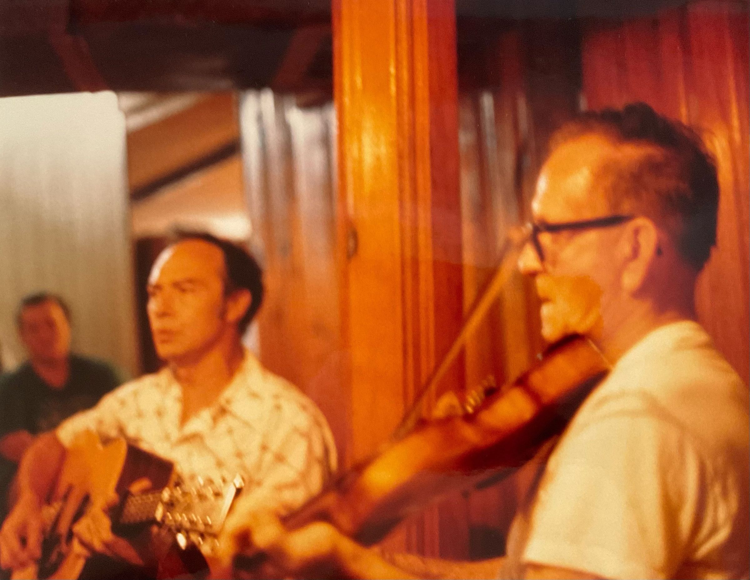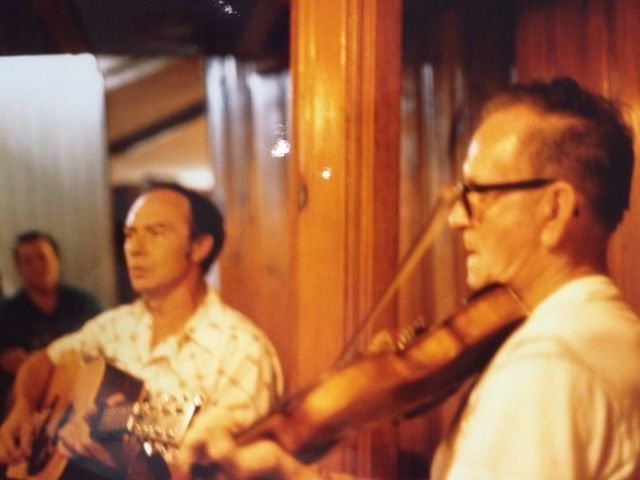Two men portrayed in photo- man to left with guitar. Man to right has black glasses and playing violin.Collection