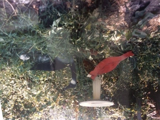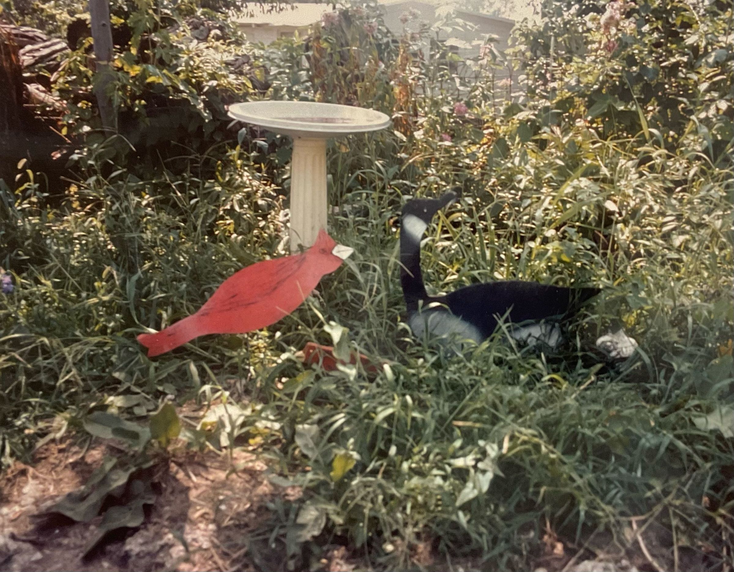 Bird (red) and black goose (cut out of jigsaw) portrayed in grass by white bird bath.Collection