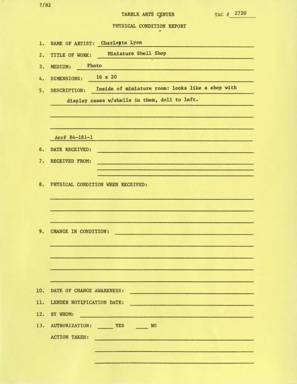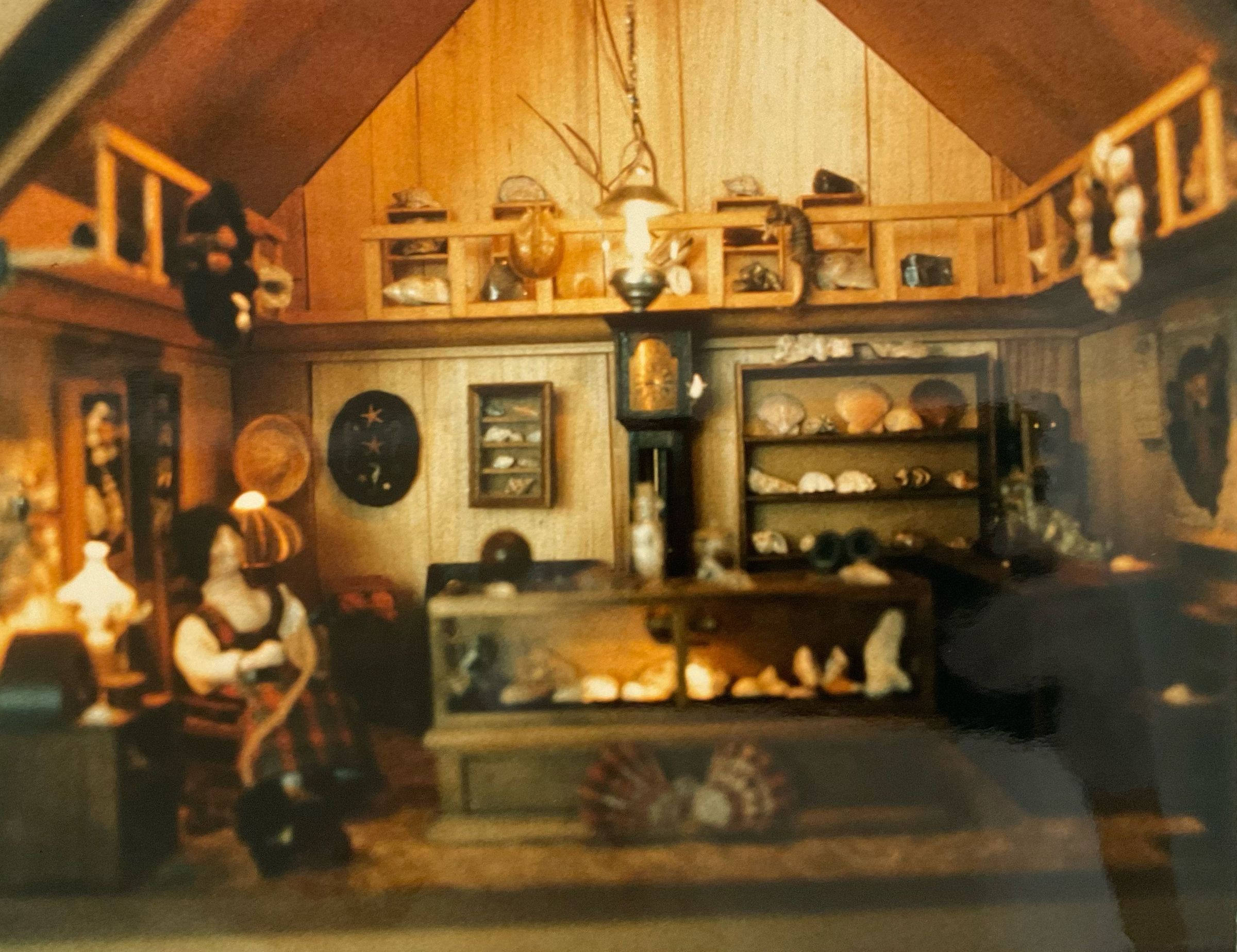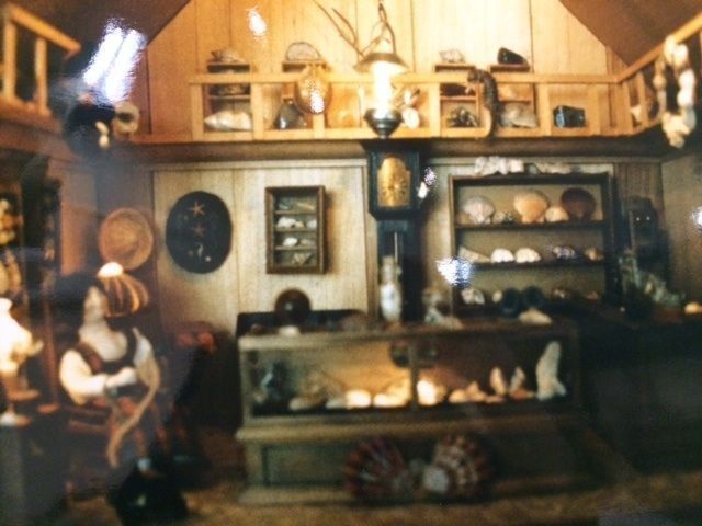 Inside of miniature room: looks like a shop with display cases w/ shells in them doll to left.Collection
