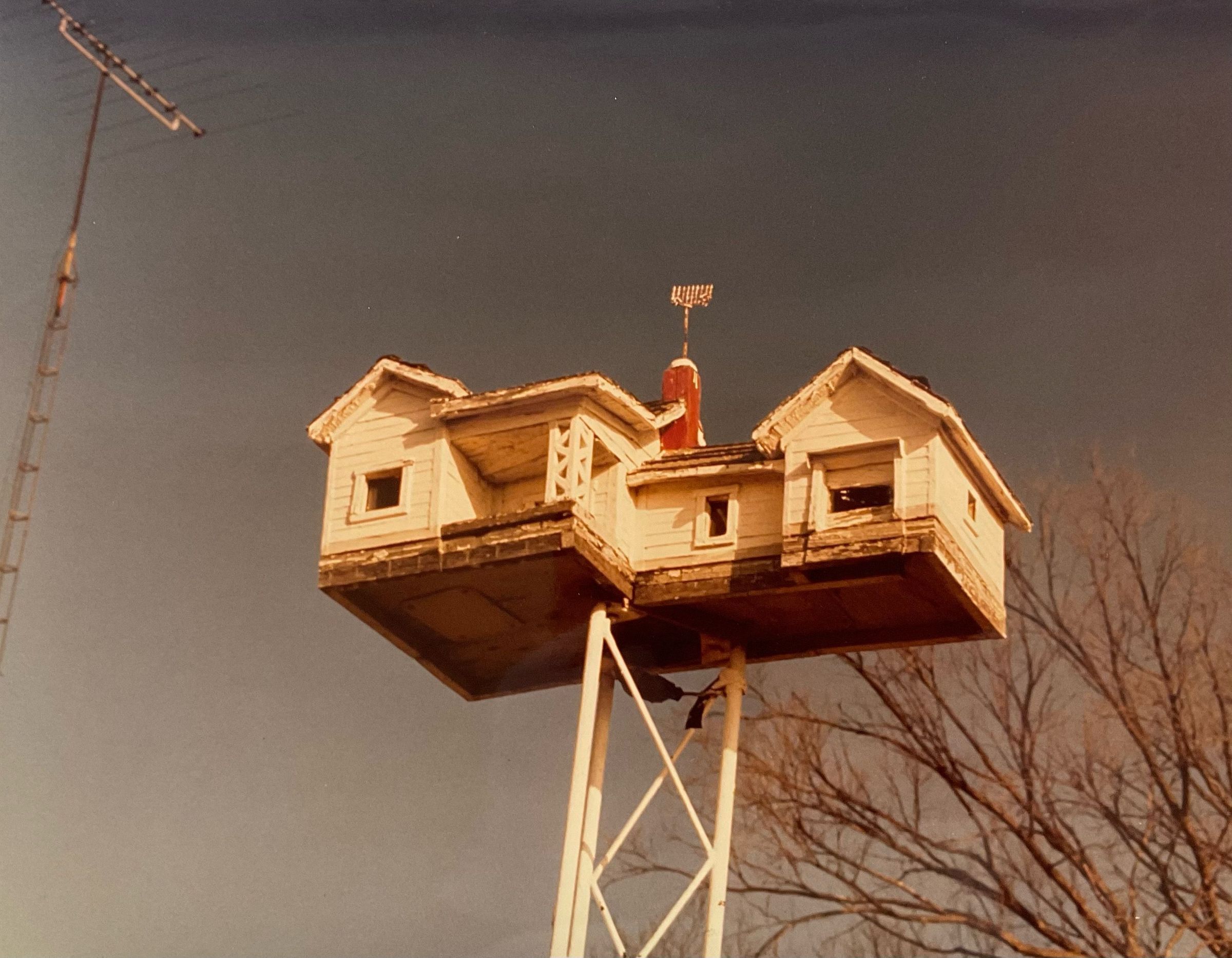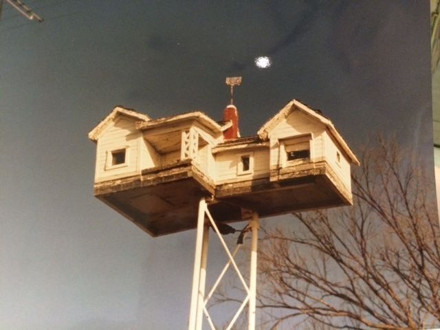 White bird house set high upon pole blue sky in background. Bird house is weathered looking looks like actual house.Collection