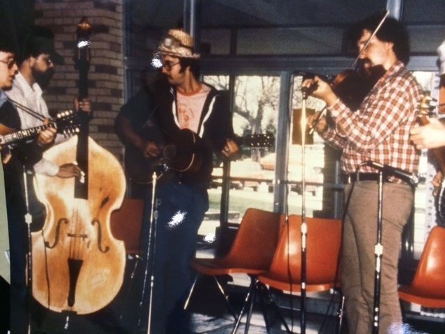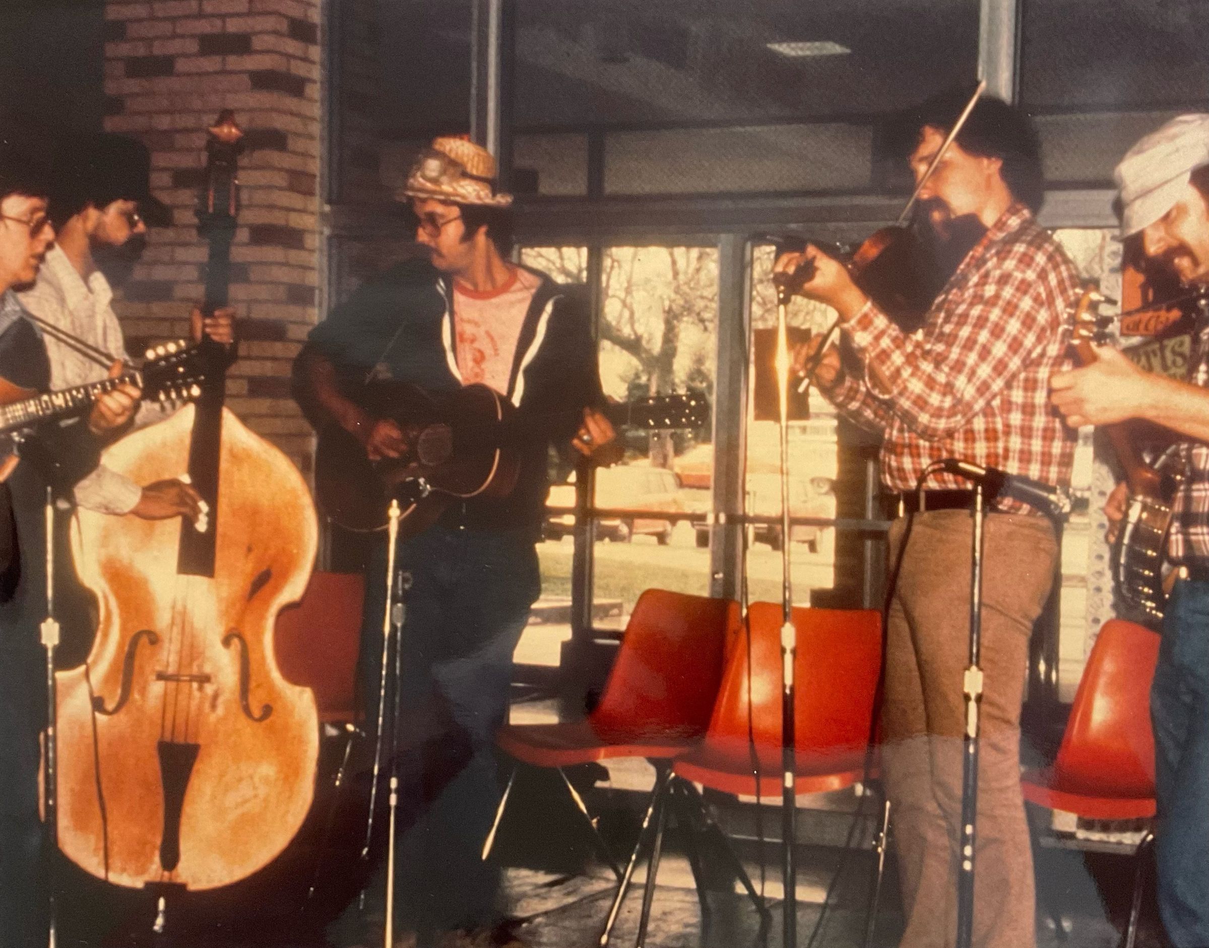 Shows four men playing cello, violins, guitar, banjo microphones in front of them.Collection