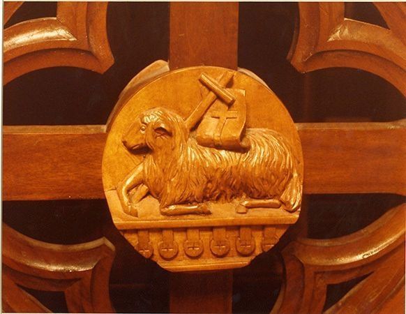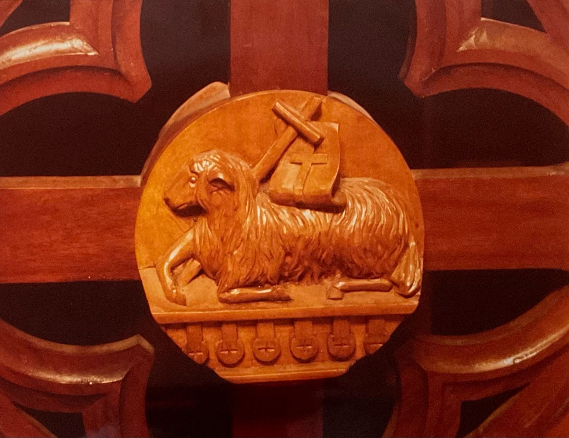 Brown wooden carving, portrayed, circular piece portrayed in center of cross figured displays sheep with cross scroll near back.Collection