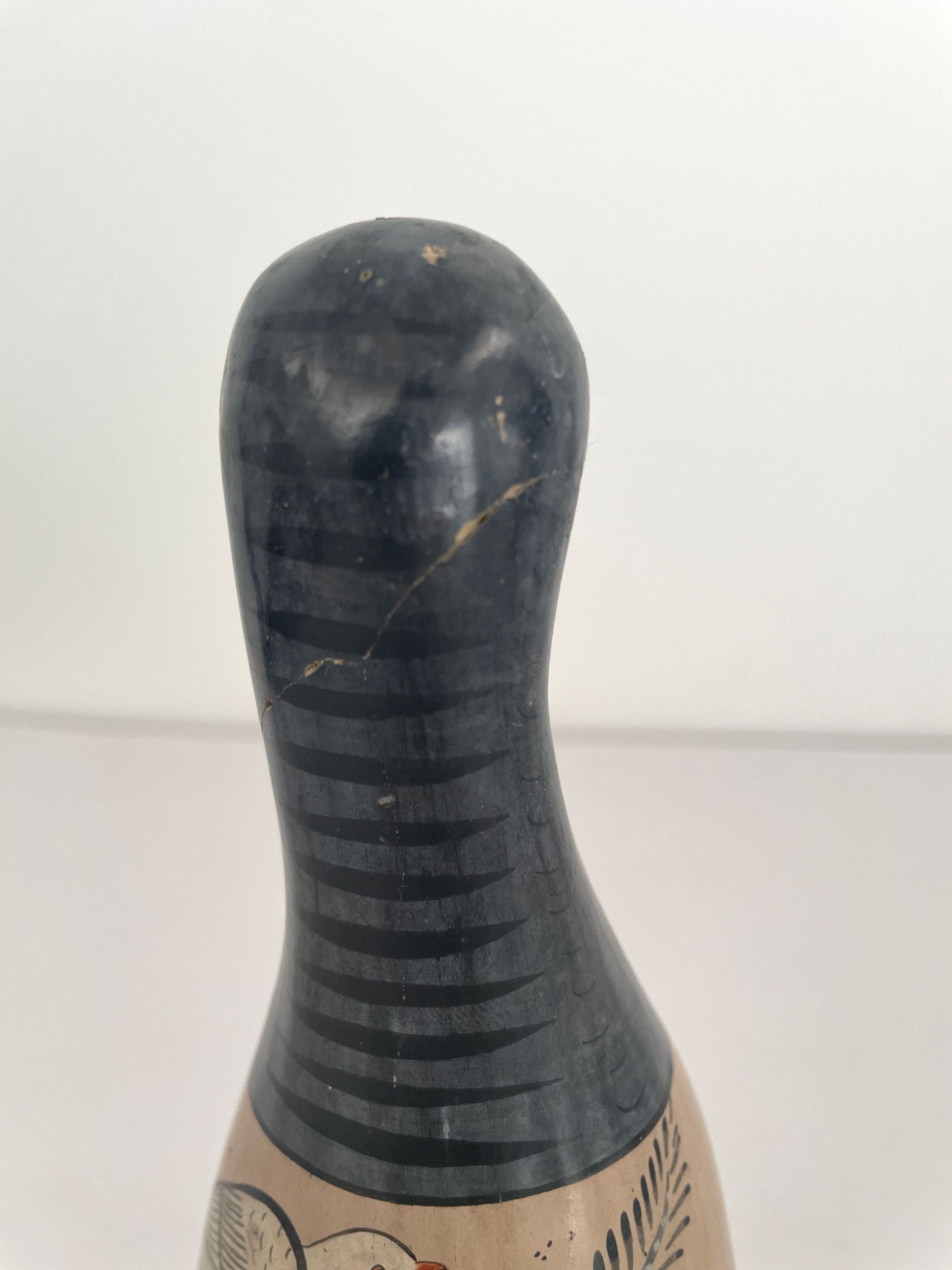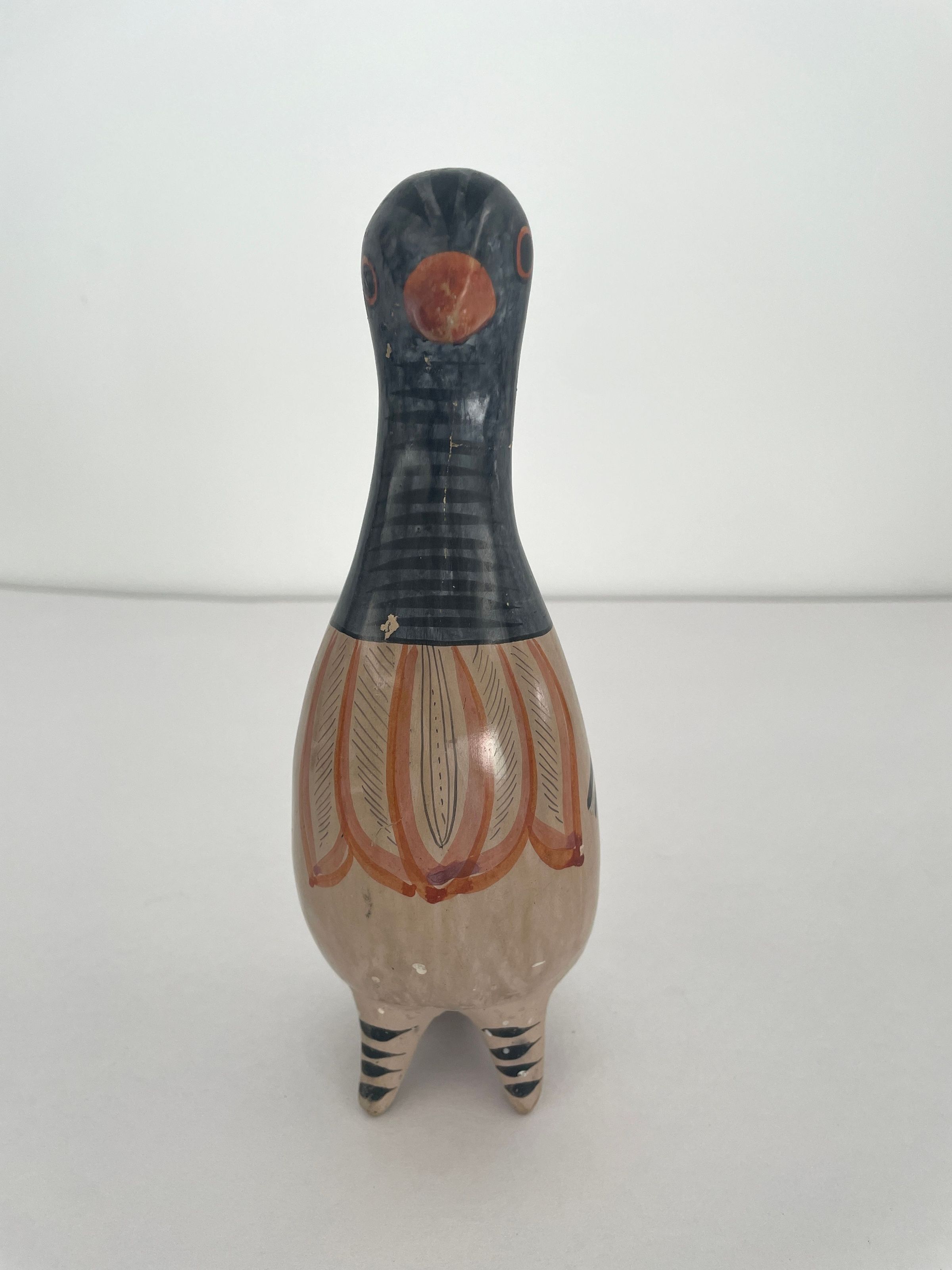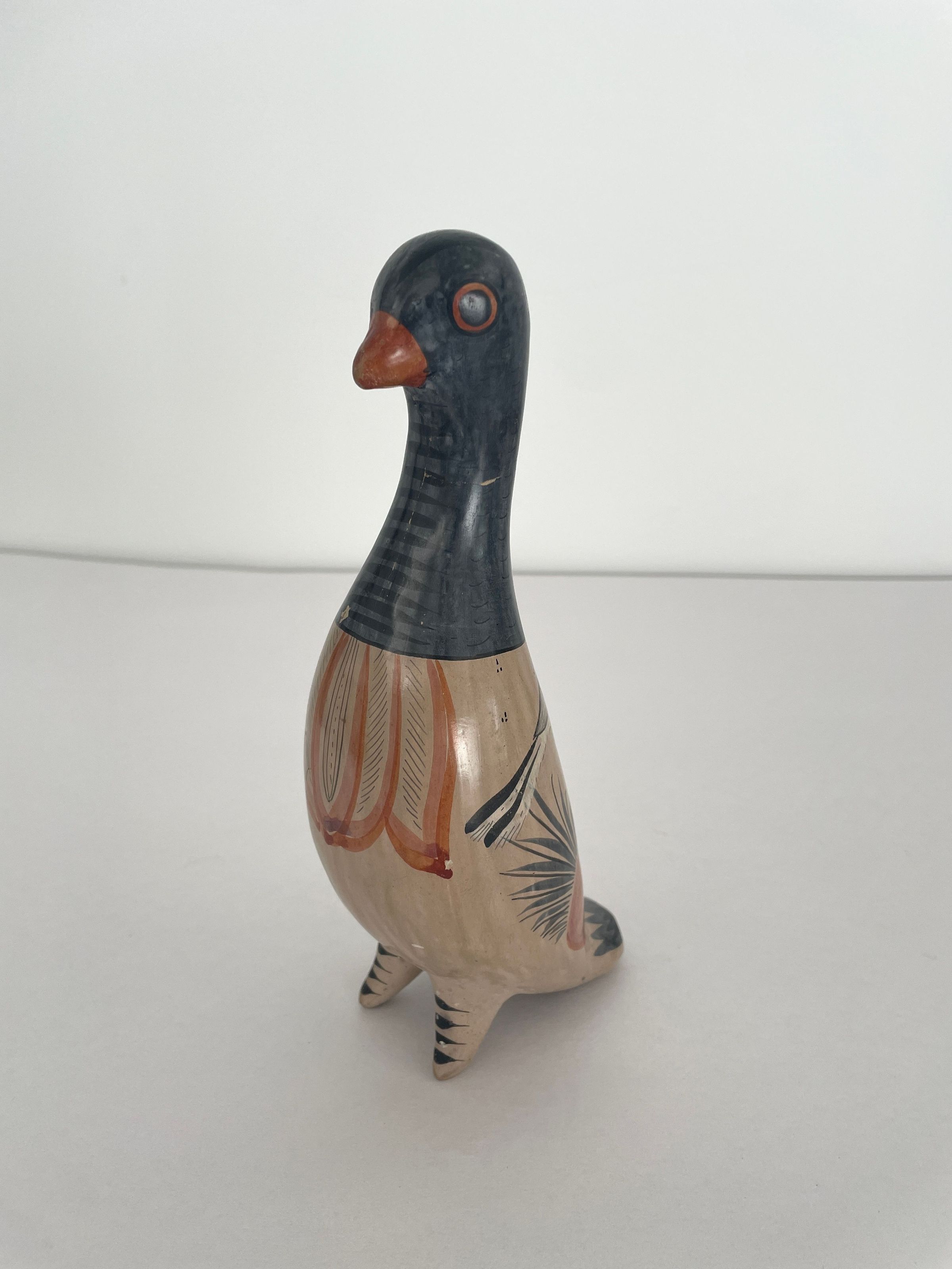 Bird is painted with floral thick lines. Back of bird is depiction of white bird perched on a leafCollection