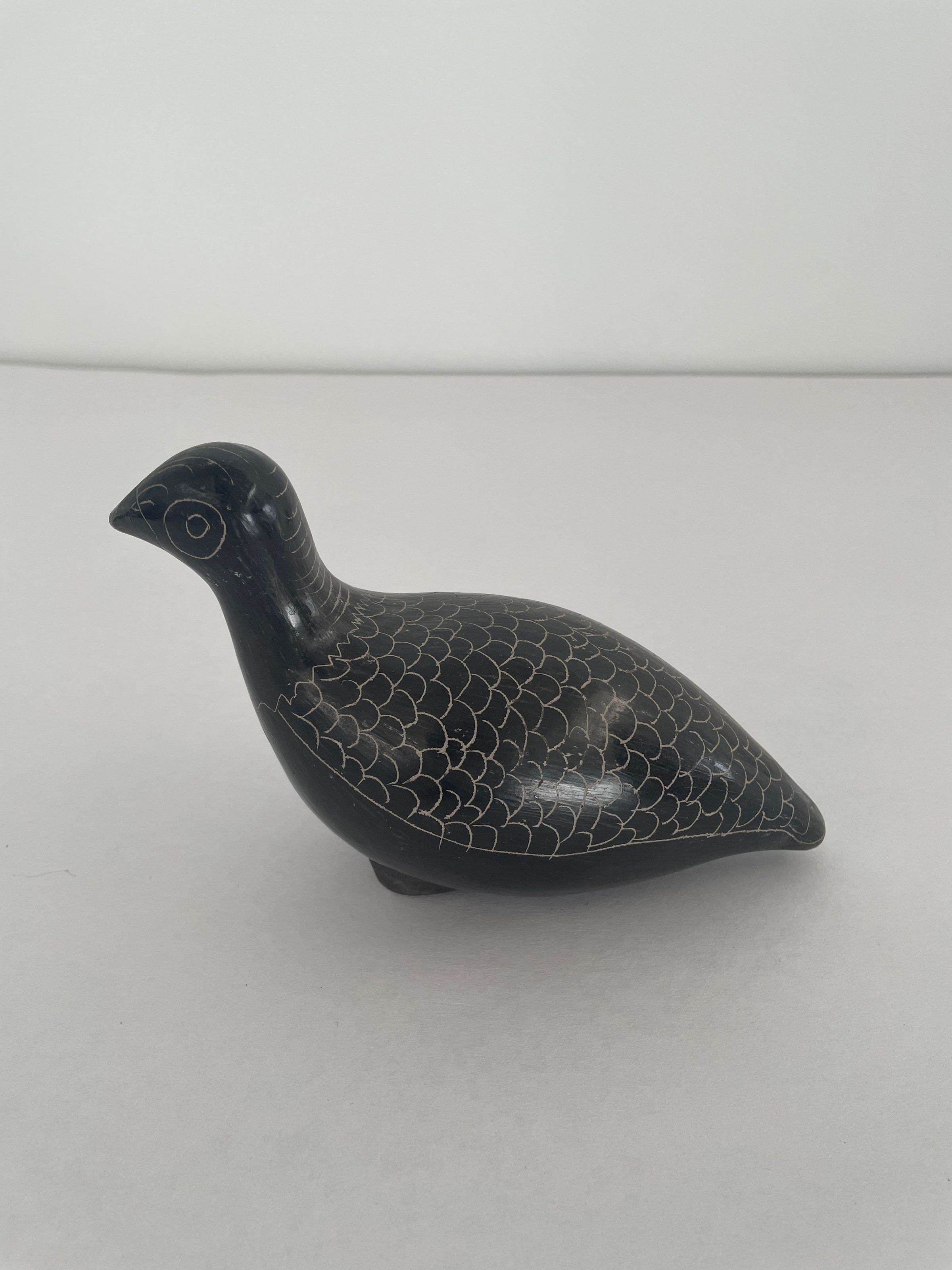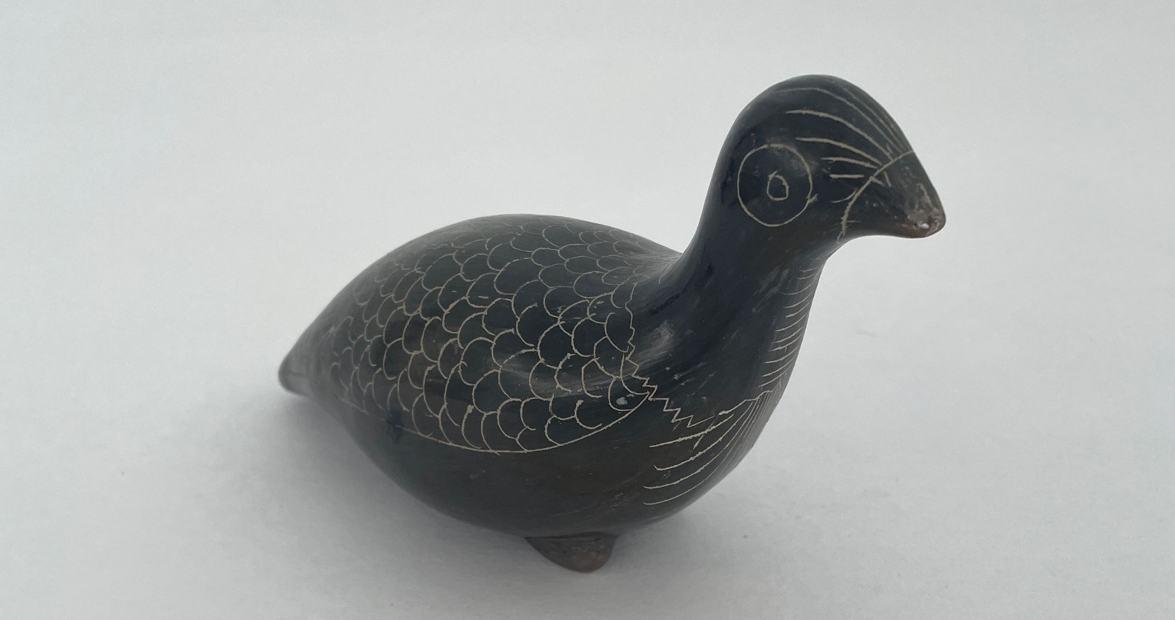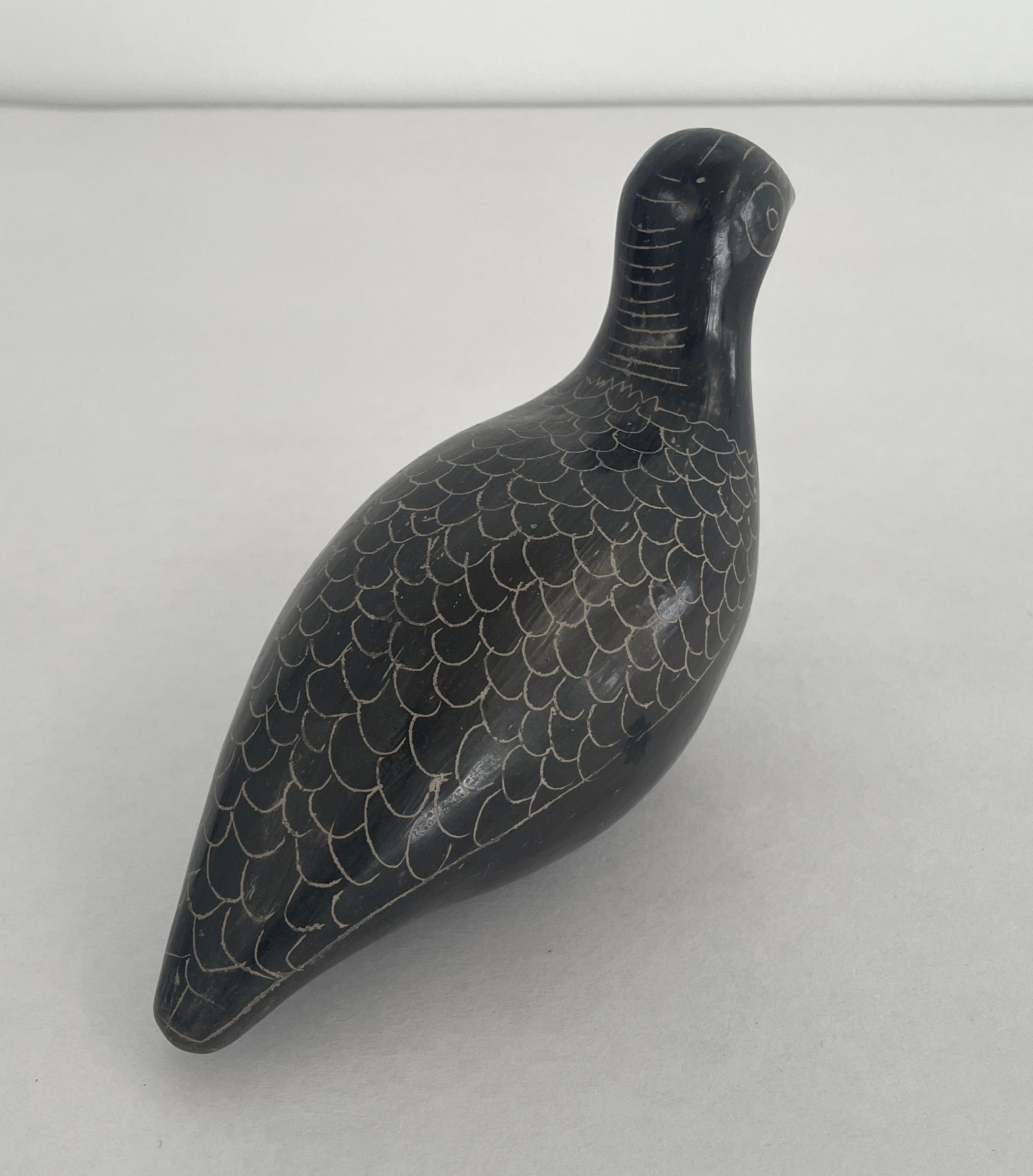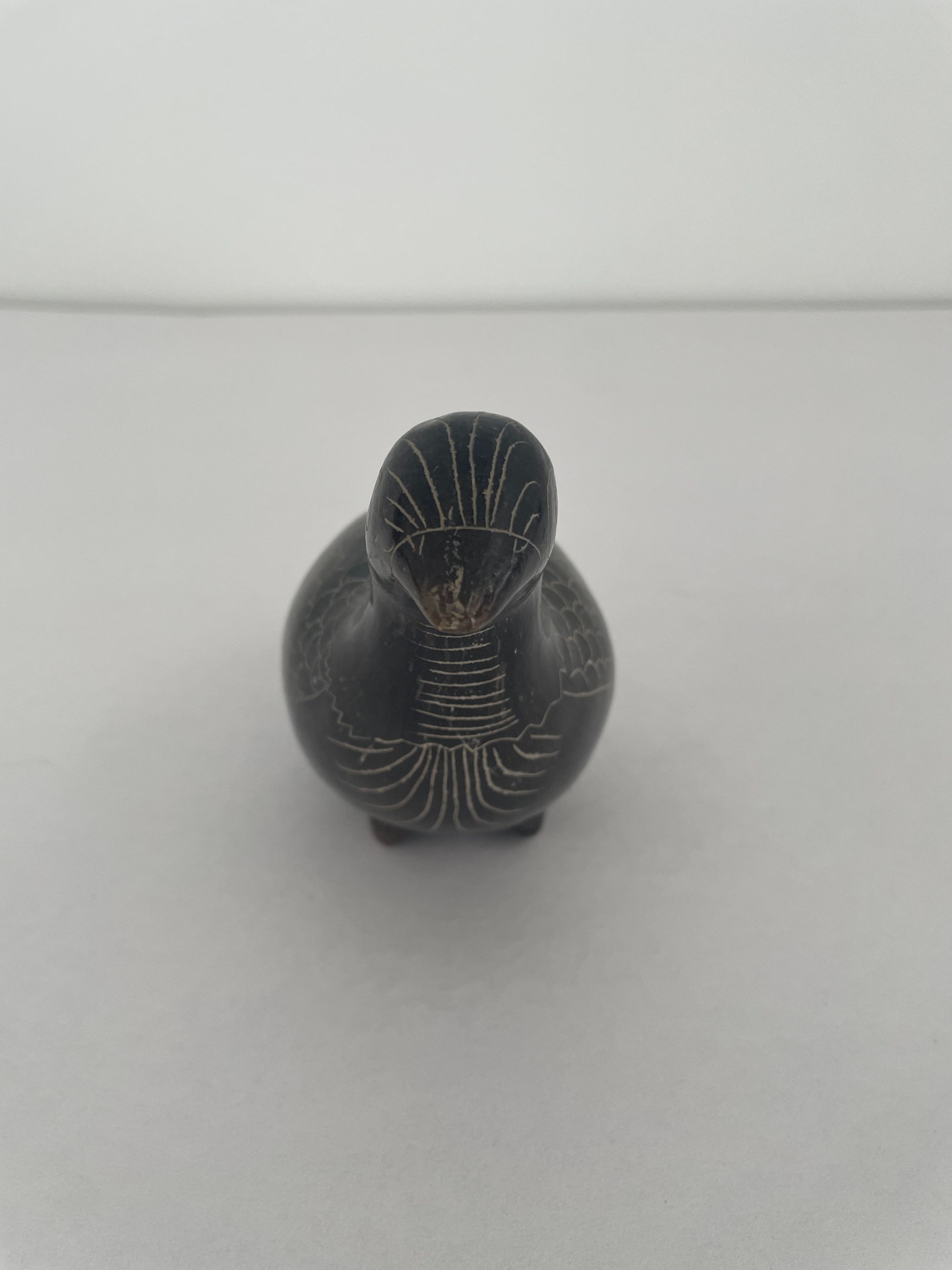 Bird is black burnished for shiny surface. Design incised on surface. Neck features horizontal lines. Back of bird covered in repeated pattern.Collection