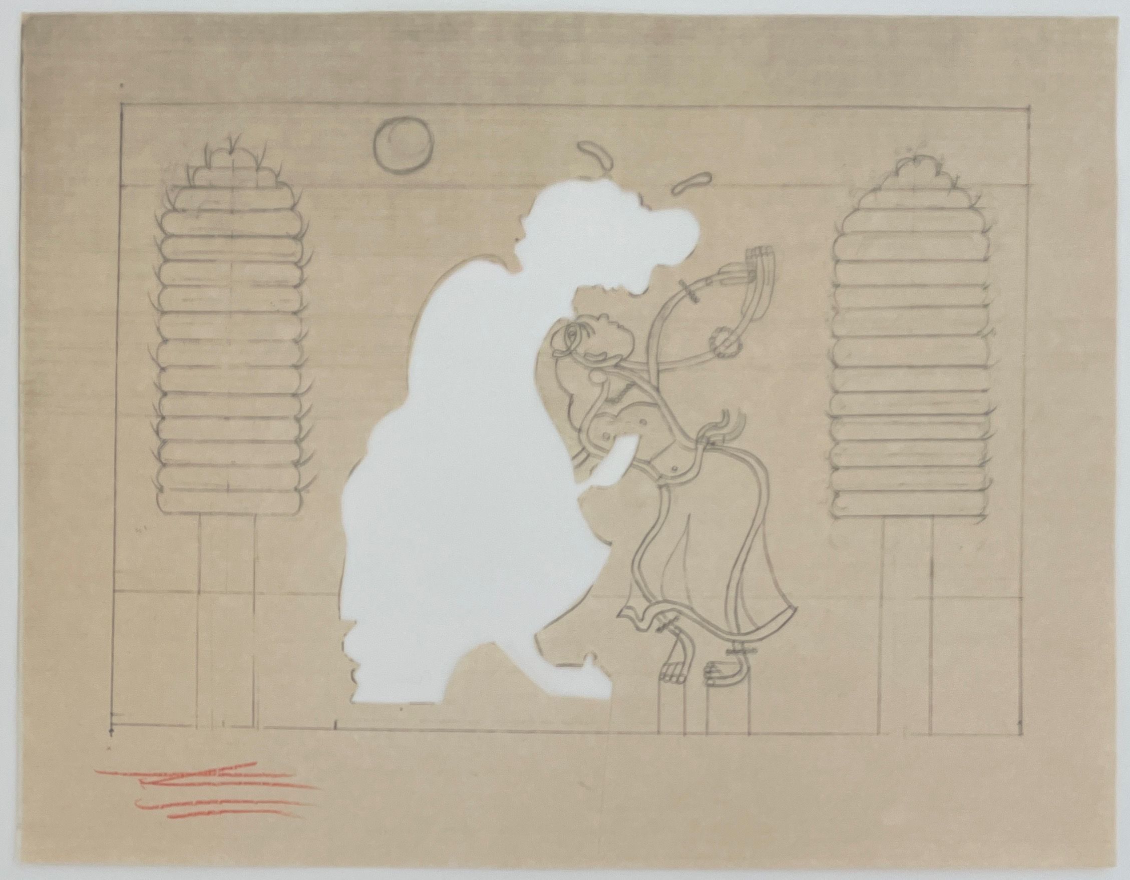 black and white study sketch for Moon Meet May. 'Moon' figure is cutout of composition. A few red pencil marks are on the bottom left.