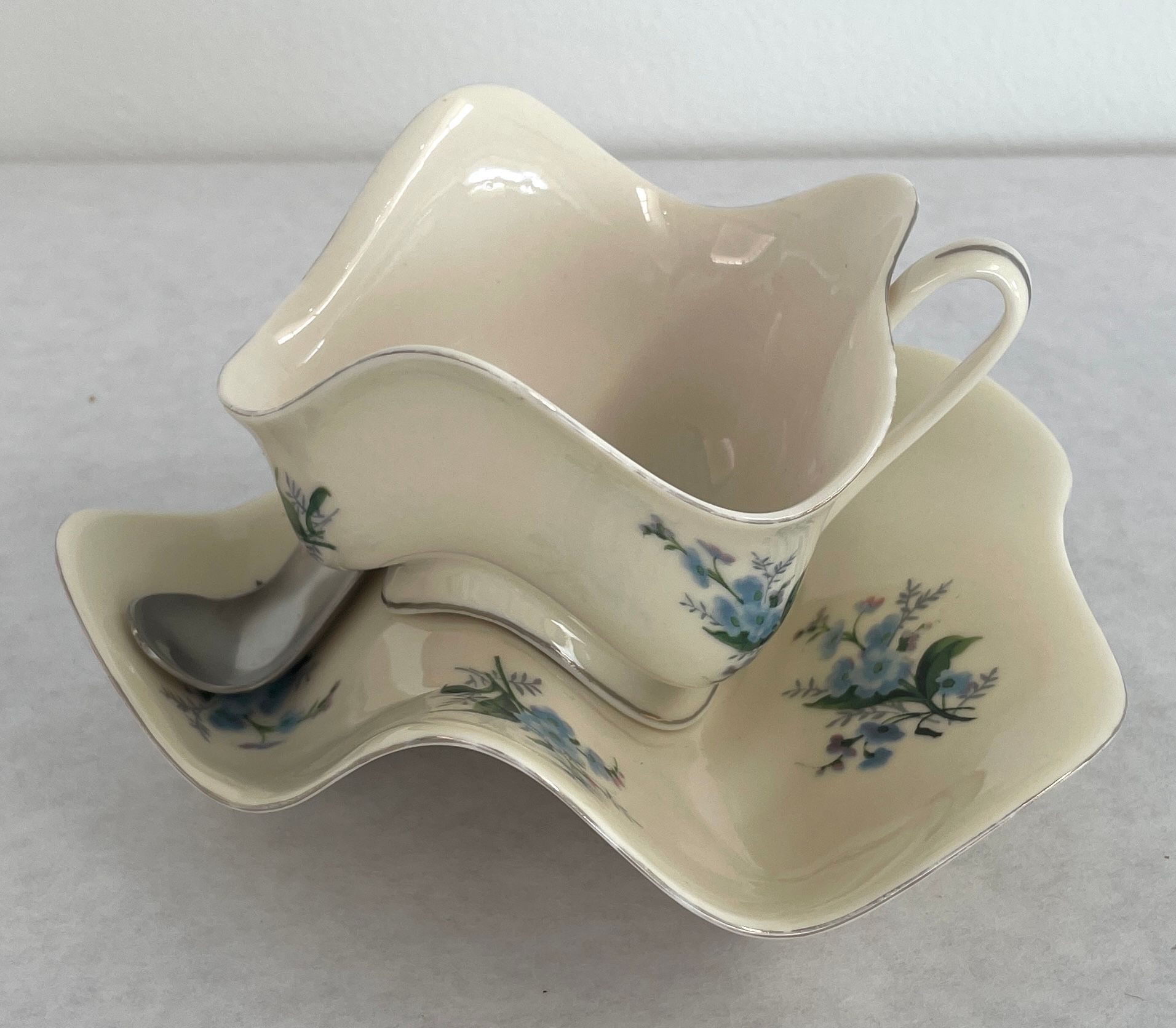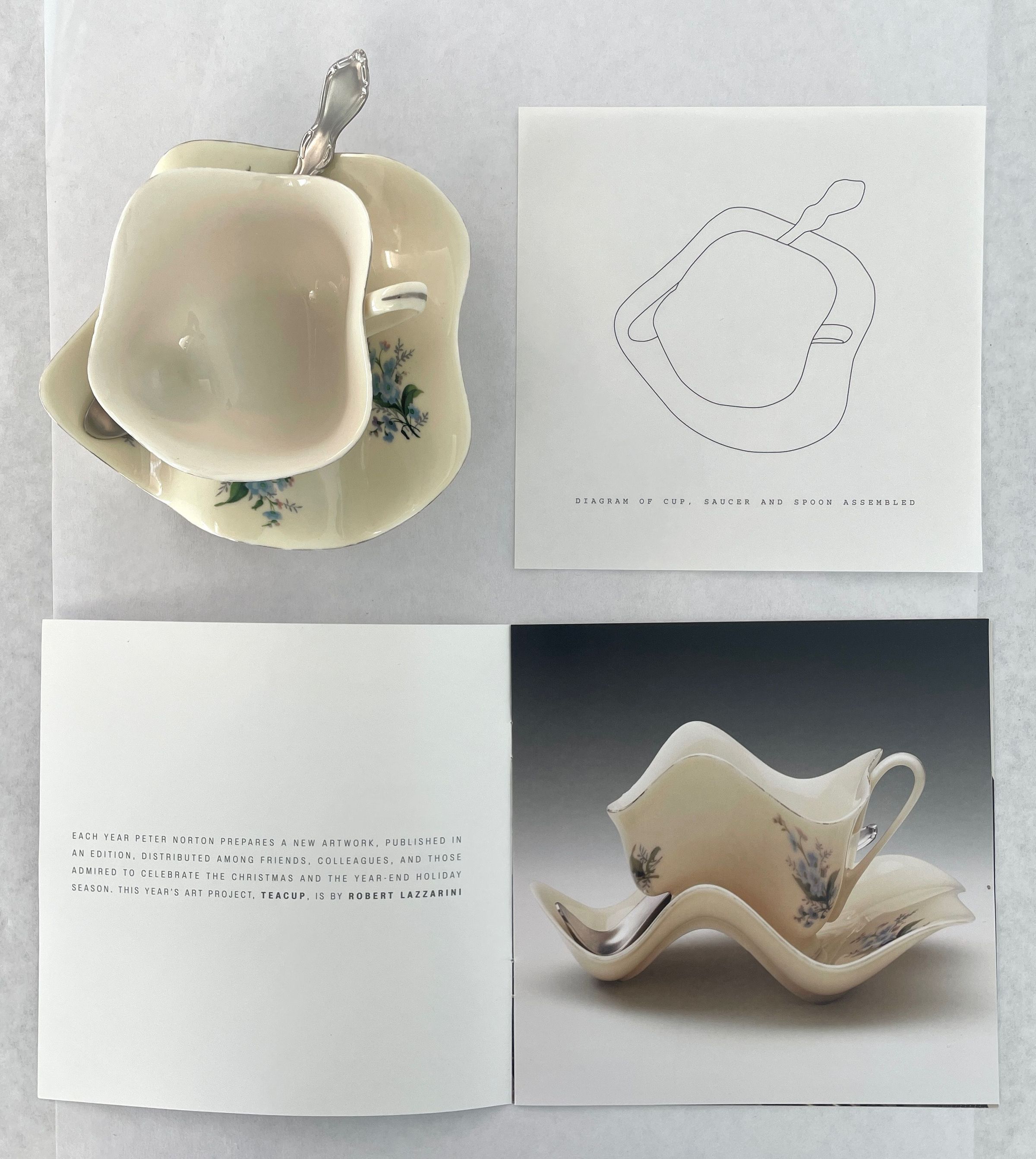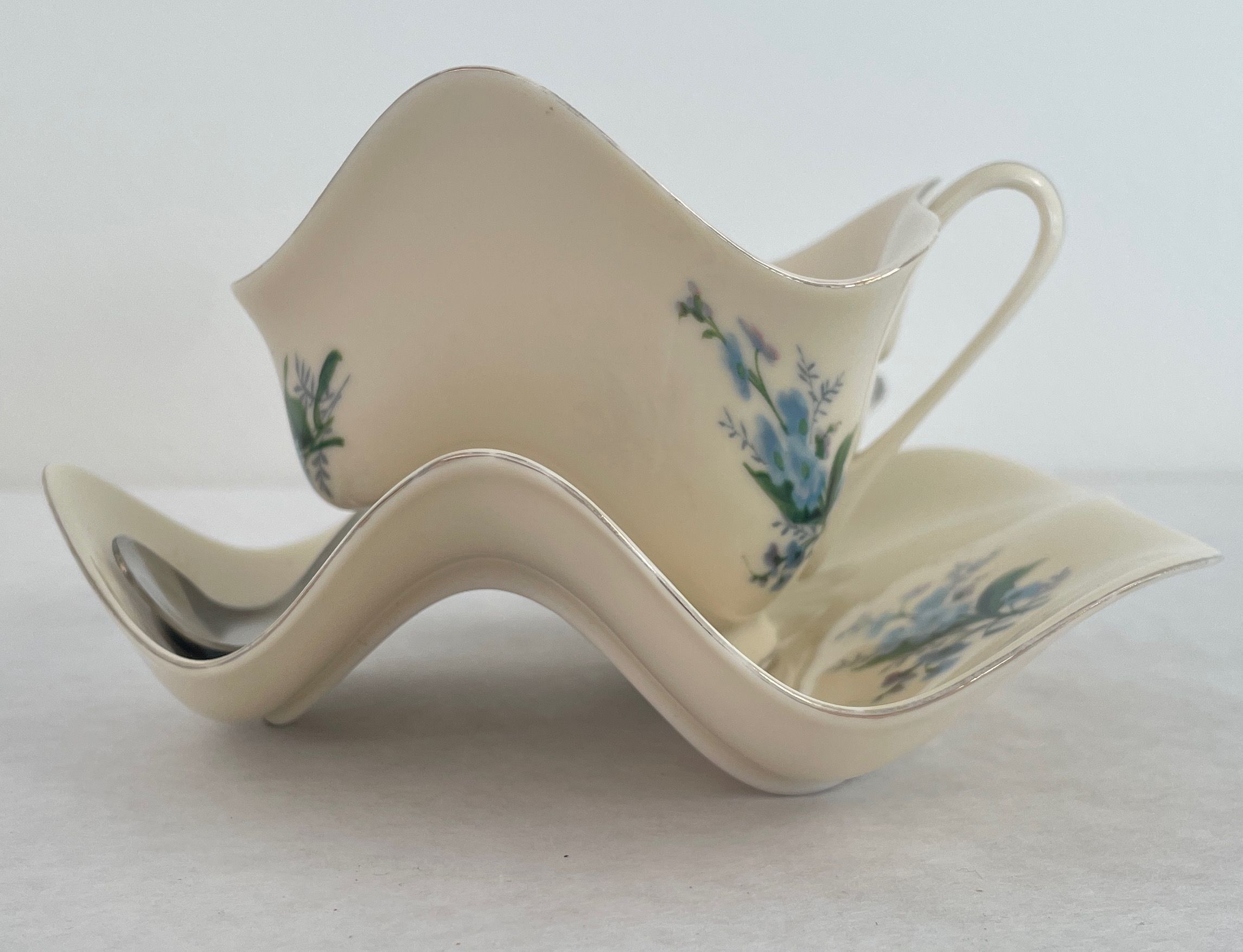 Porcelain teacup saucer and spoon. Yellow aged glaze with forget-me-nots. The classical teacup form is distorted into a wavy dynamic design.Collection