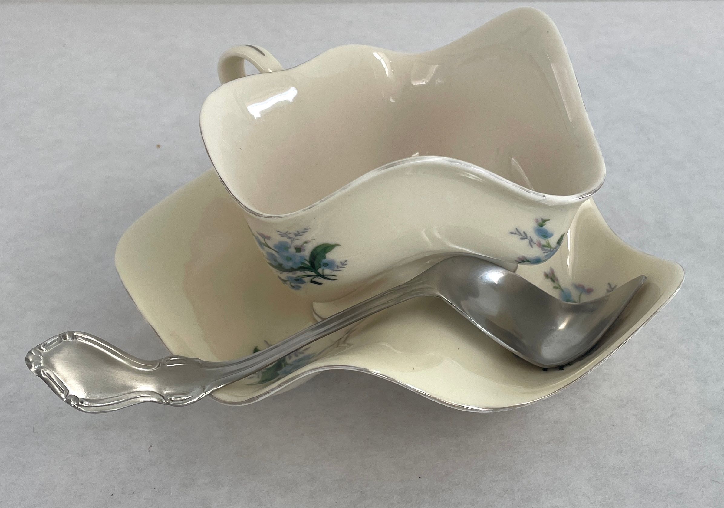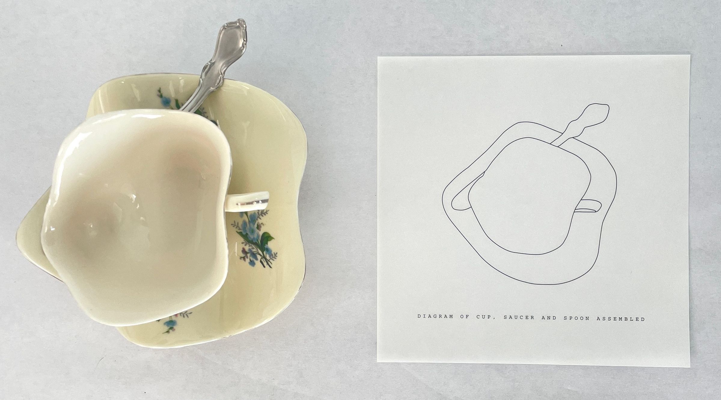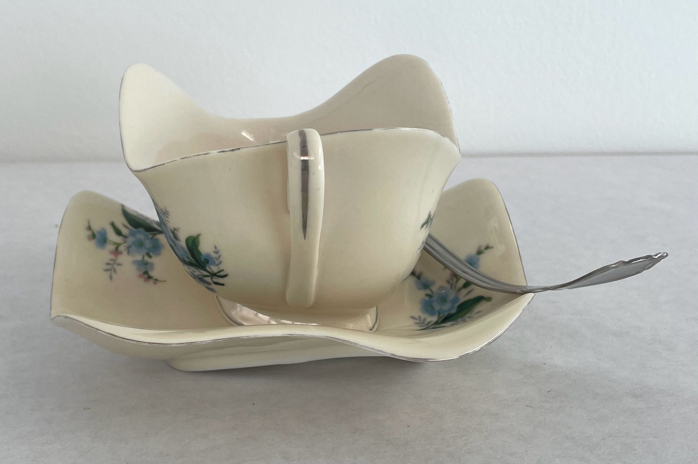Porcelain teacup saucer and spoon. Yellow aged glaze with forget-me-nots. The classical teacup form is distorted into a wavy dynamic design.Collection