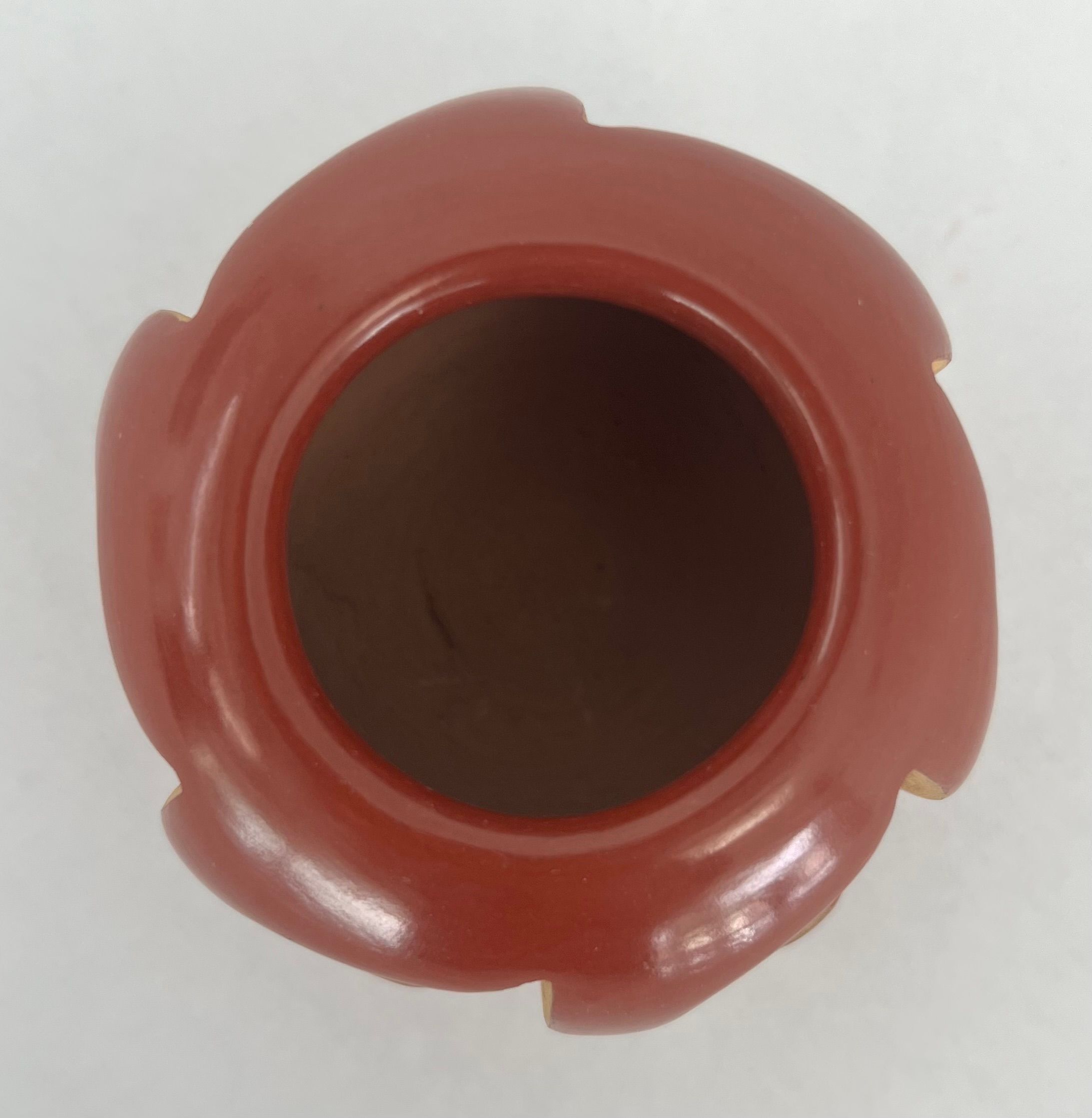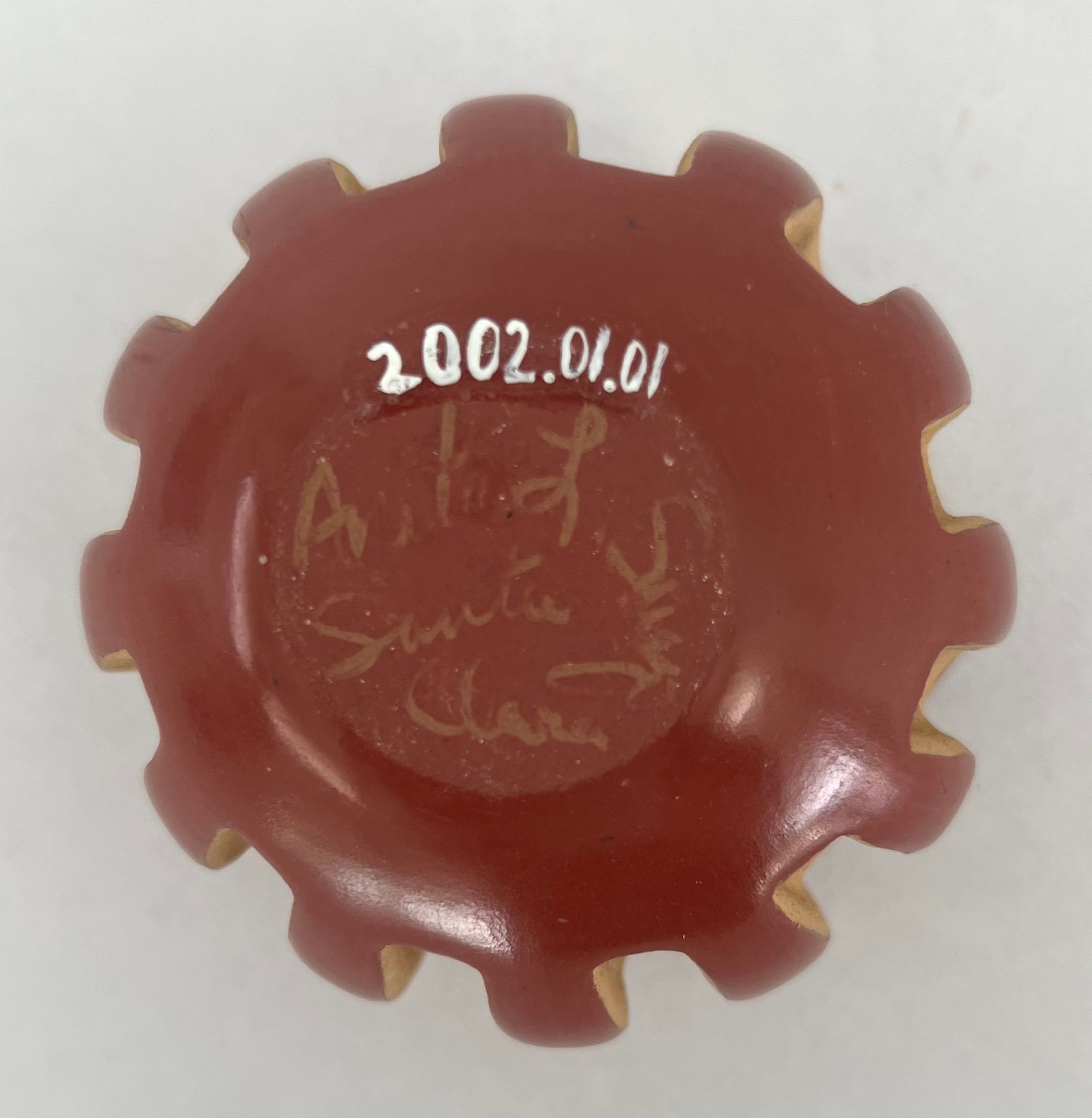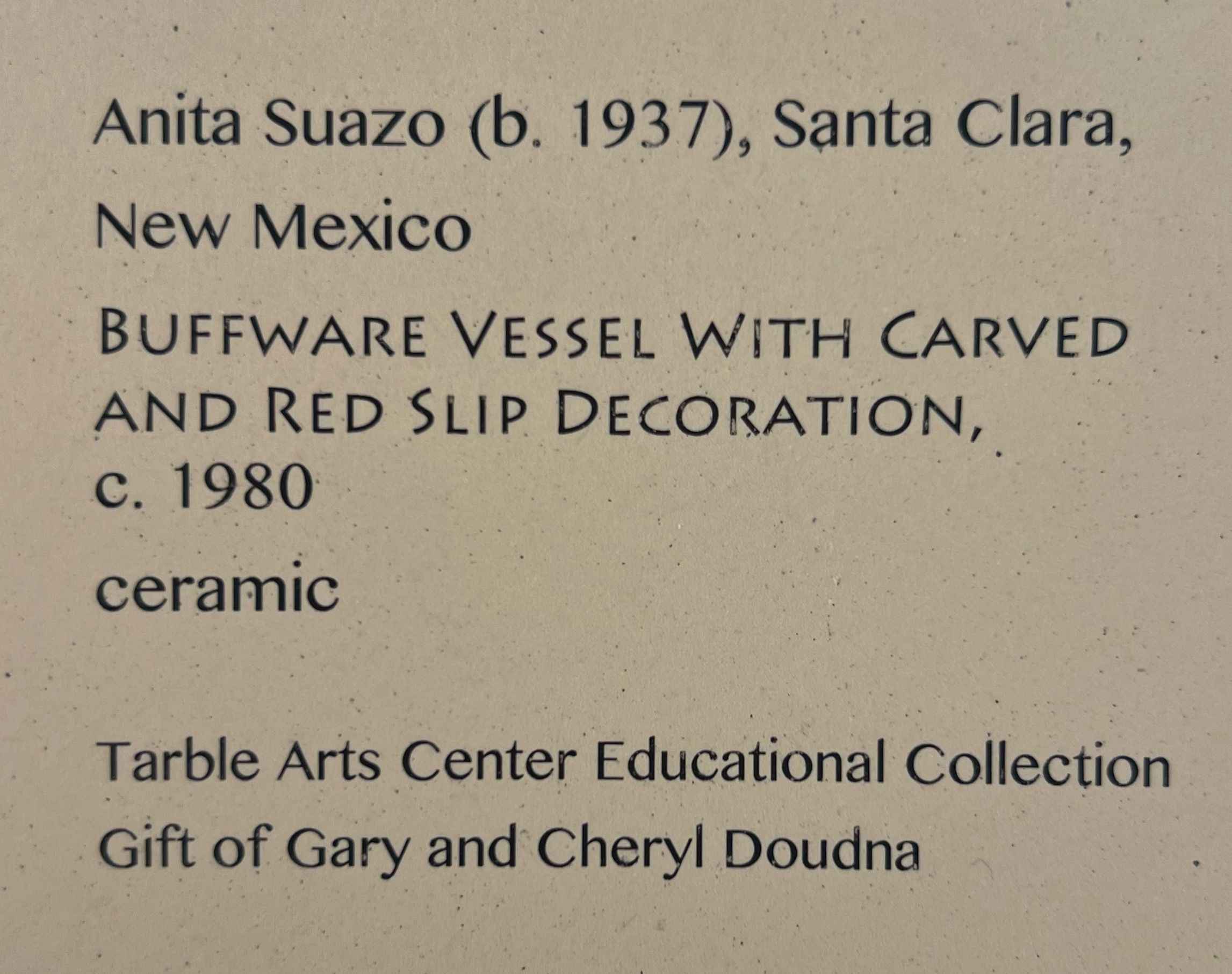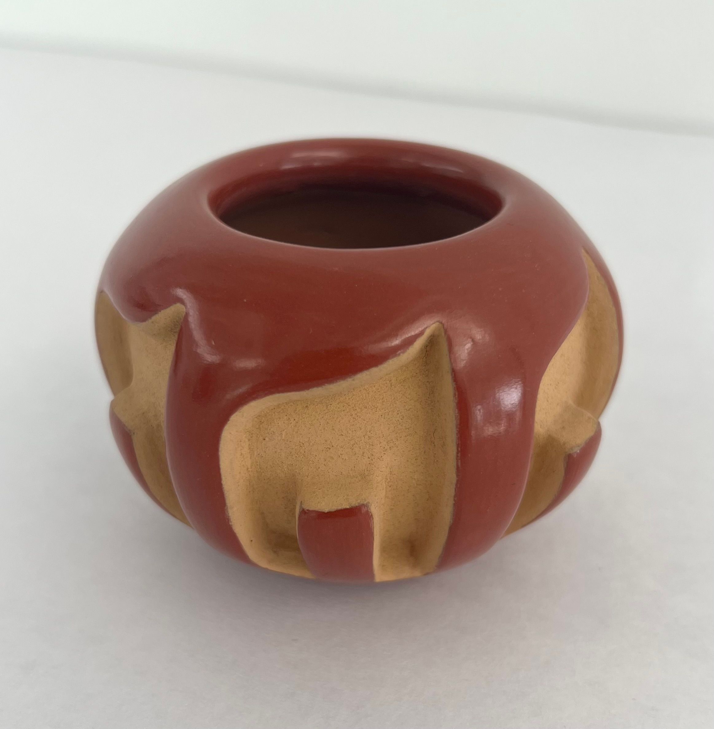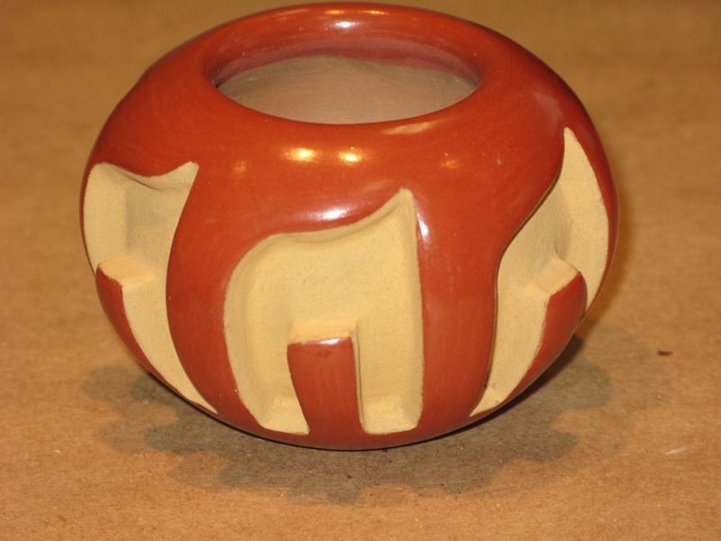 redware with carved designs(traditional) buff clay with red slips carved into back. Artist's name inscribed in bottom: excellent condition. ceramicExcellent condition; artsit's name inscribed in bottomCollection