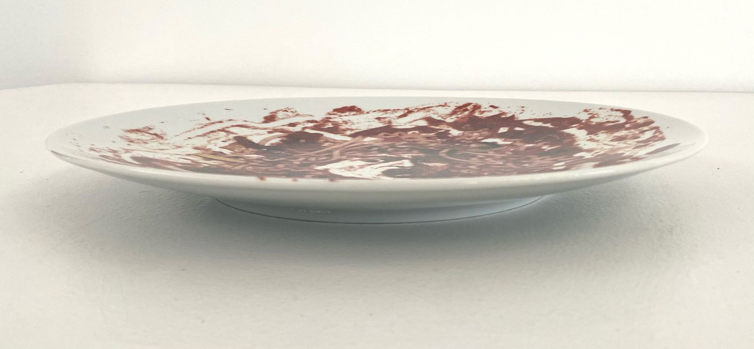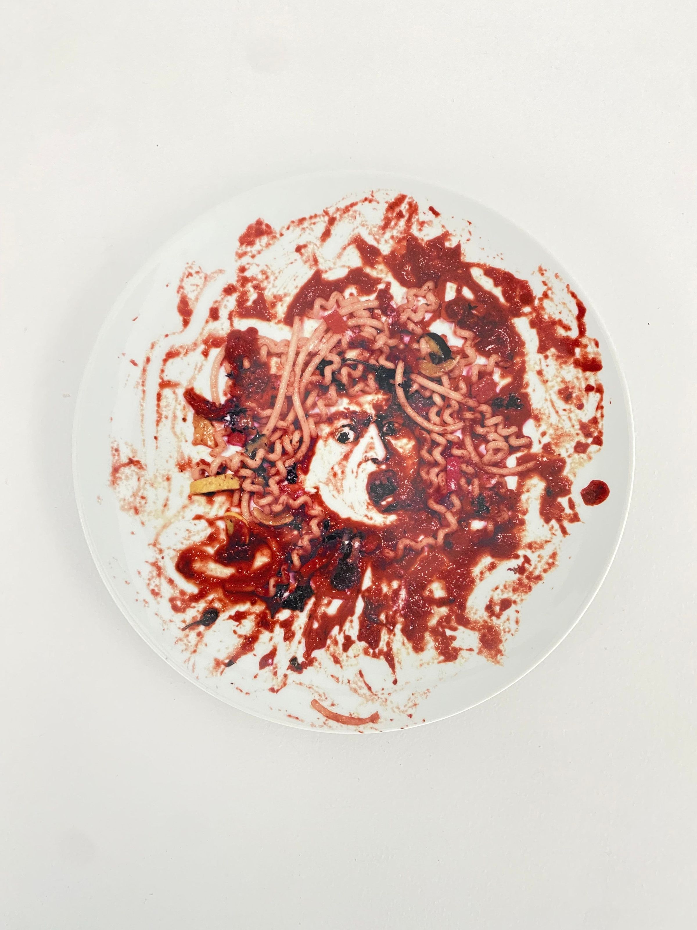 Ceramic plate with image of a recreation of Caravaggio's Medusa rendered in pasta marinara A woman with mouth open as if to scream snakes on top of her headImage is affixed to plate with decal after a photograph of maniputated marinaraCollection