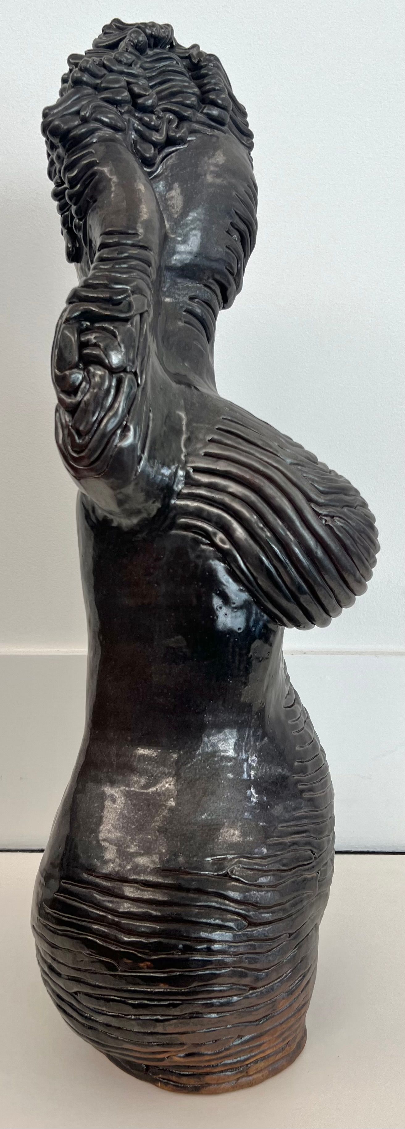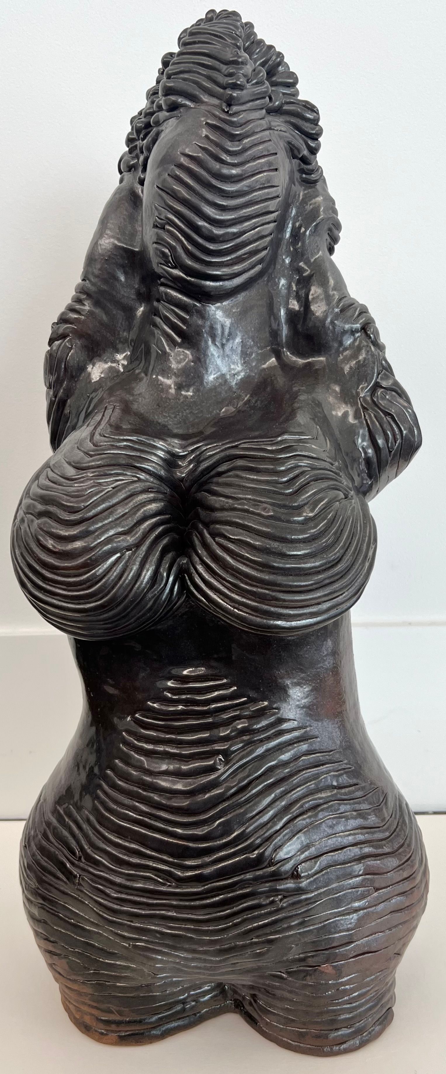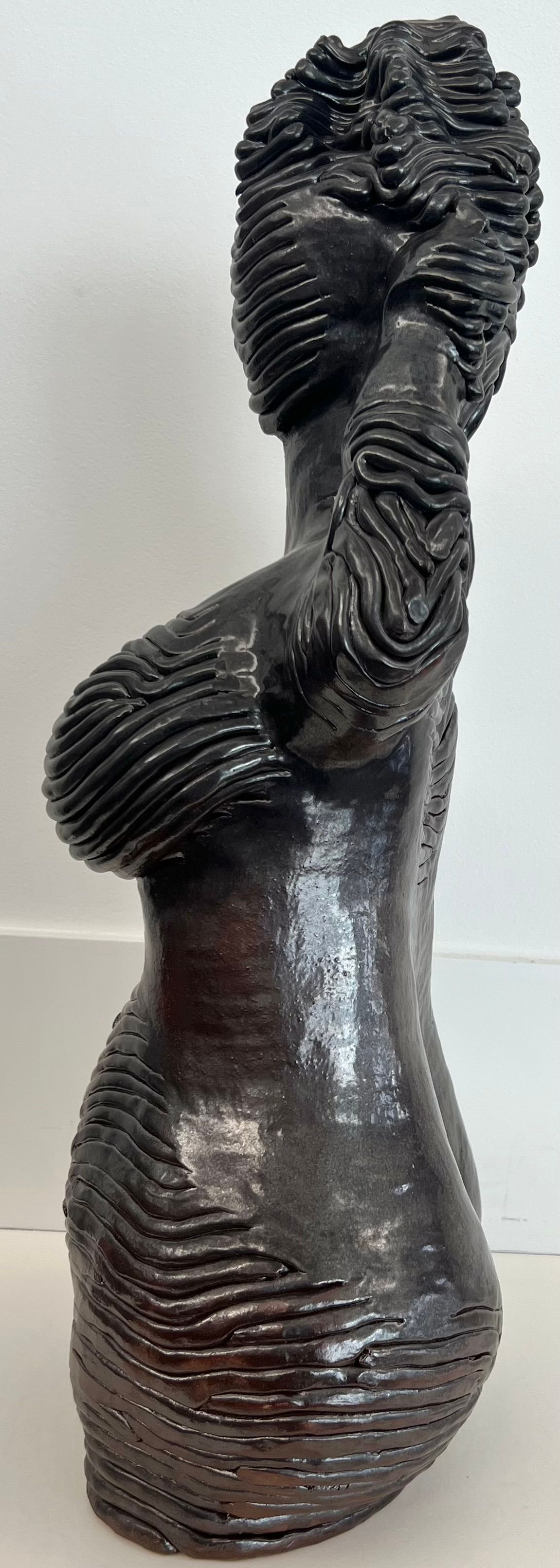 Torso and head of woman-linear marigation of metal adds texture-hands are raised to head. Hollow interior. Grey-black finish.Dimensions